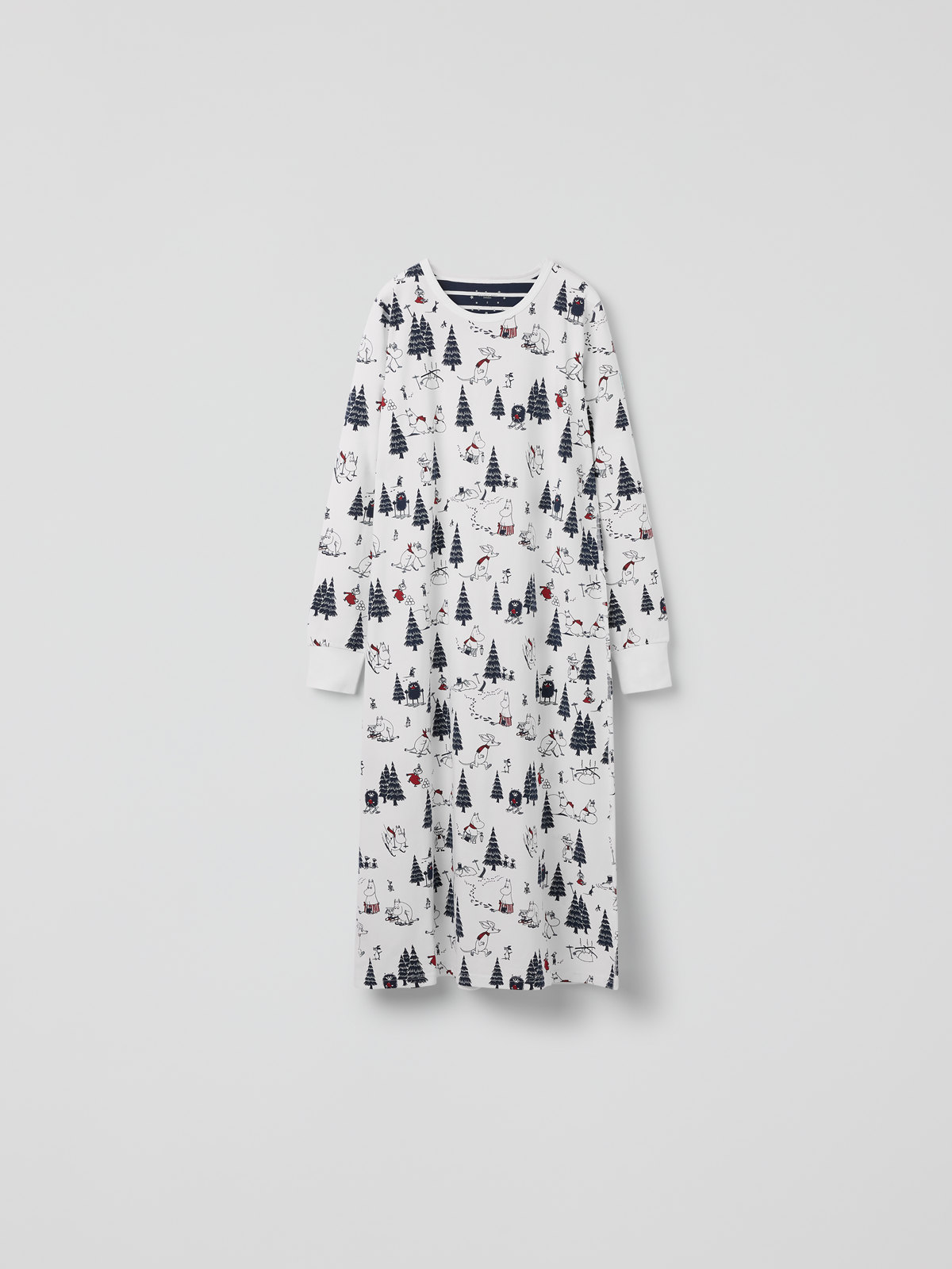 Pehmeä ja kaunis yöpaita, luomupuuvillaa, aikuisille – osa rakastettua design-yhteistyötämme Muumien 80-vuotisjuhlan kunniaksi vuonna 2025. Yöpaita on kuvioitu kokonaan Tove Janssonin muumitarinoiden hahmoilla.