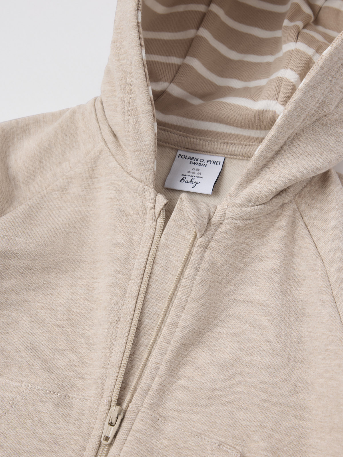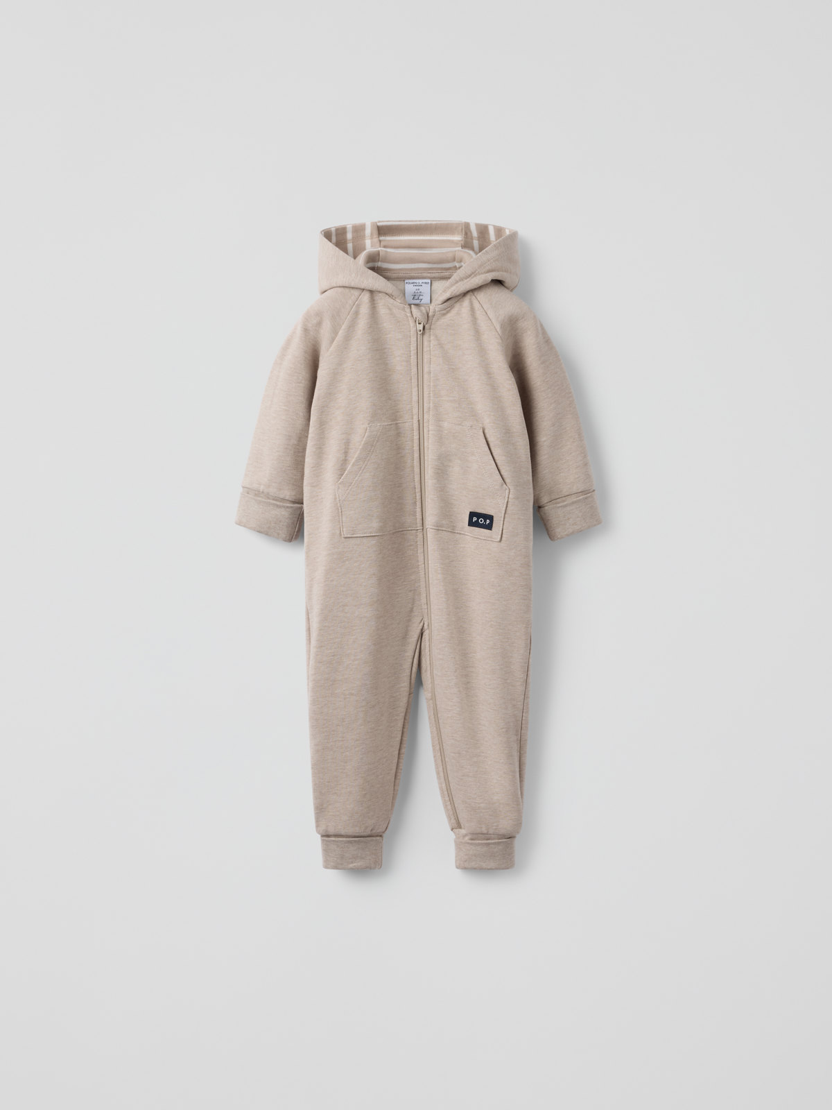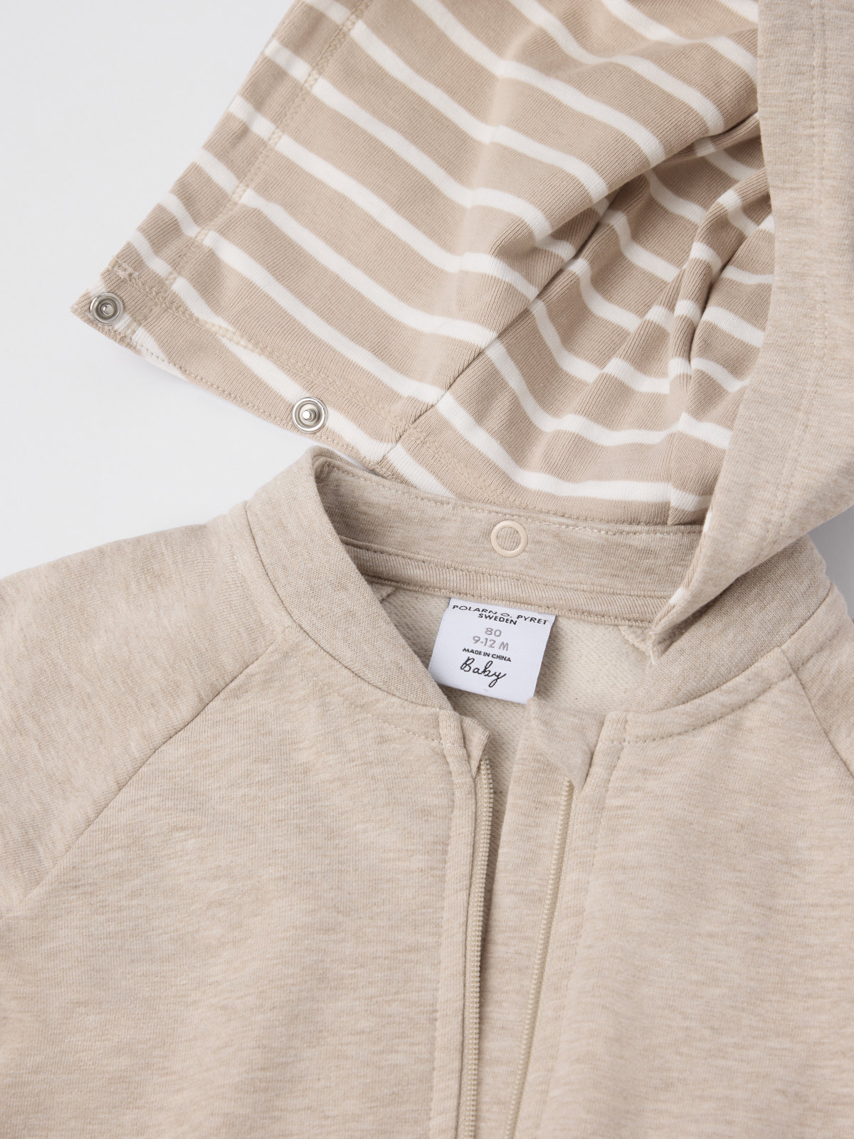 Vauvan pehmeä haalari luomupuuvillaa. Kaunista collegekangasta harjatulla sisäpinnalla. Haalarissa on kengurutasku. Kiinteän hupun vuori on pehmeää puuvillatrikoota, jossa on klassinen raitakuosimme. Pitkä vetoketju pääntieltä lahkeensuulle helpottaa pukemista. Vetoketjussa on suoja, jotta se ei hankaa leukaa ja poskia. Erittäin pitkät ribbiresorit hihan- ja lahkeensuissa voi taittaa alas lapsen kasvaessa.