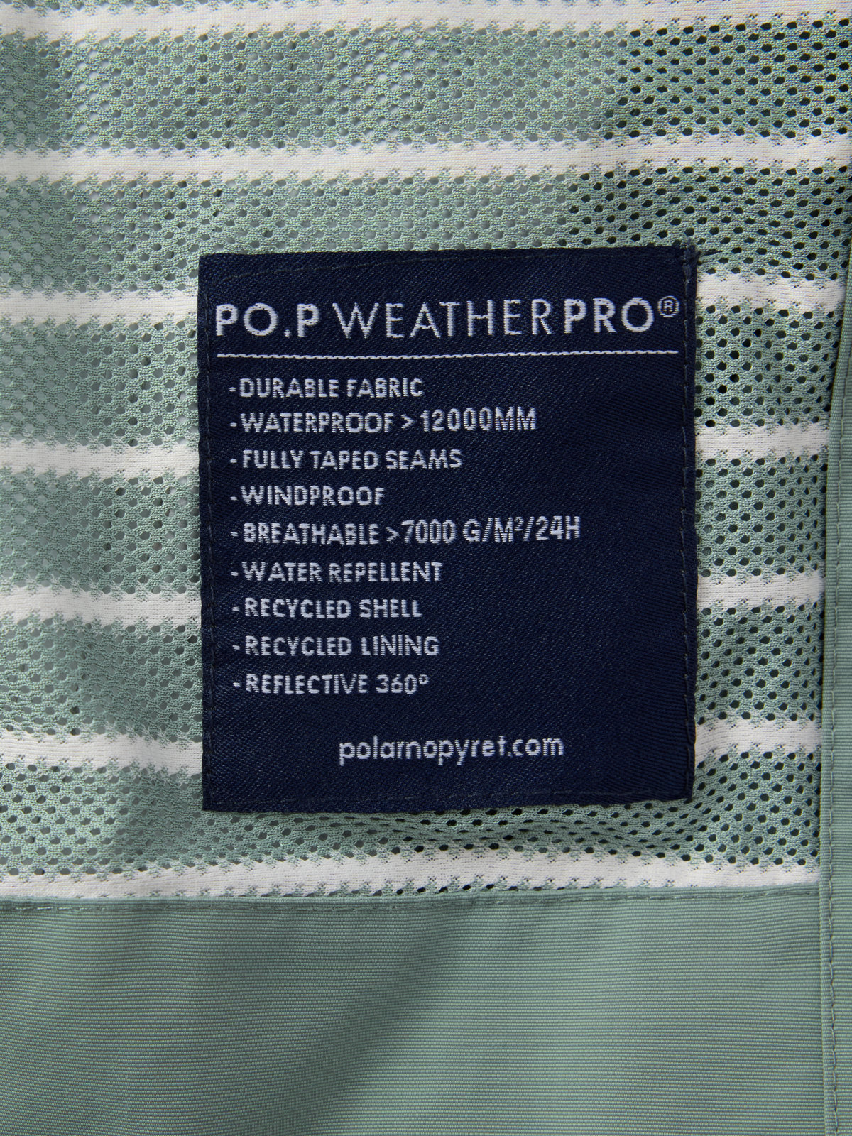 Ulkovaatteet, joissa on merkintä PO.P WeatherPro®, täyttävät kaikki vaatimuksemme teknisille ulkovaatteille, olipa kyse sitten kestävyydestä, vedenpitävyydestä, hengittävyydestä tai lapsiturvallisuudesta.
