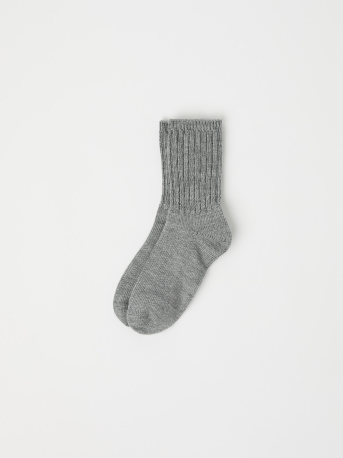 Nämä paksut sukat on valmistettu lämpimästä merinovillasta, joten jalat eivät palele. Sukissa on pitkä ribbiresori. Koko on merkitty varren sisäpuolelle. Tilaa on myös lapsen nimelle. Helppo pitää järjestyksessä!
