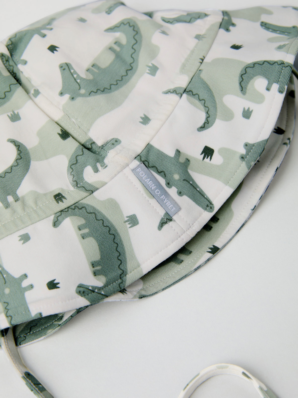 Aurinkohattu 100 % luomupuuvillaa – perheen pienimpien suosikki auringossa! Aurinkohattu on kuvioitu kokonaan krokotiilikuviolla. Pehmeät solmittavat nauhat pitävät hatun paikallaan.