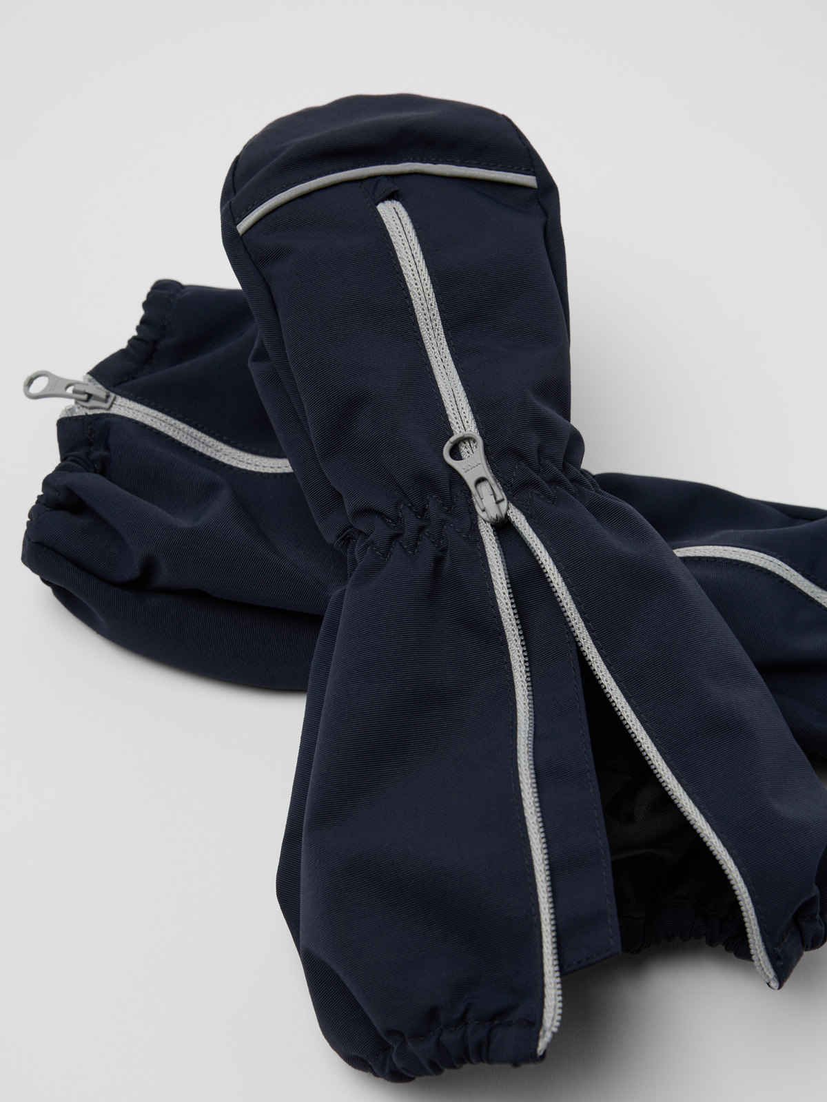 Tuulenpitävät hanskat vedenpitävää materiaalia. Hanskoissa on kaunis fleecevuori ja päällä pitkä vetoketju, joka helpottaa pukemista. Hanskojen päällä on heijastimet ja kämmenpuolella pitävä kangas. Vetoketju ei ole vedenpitävä.