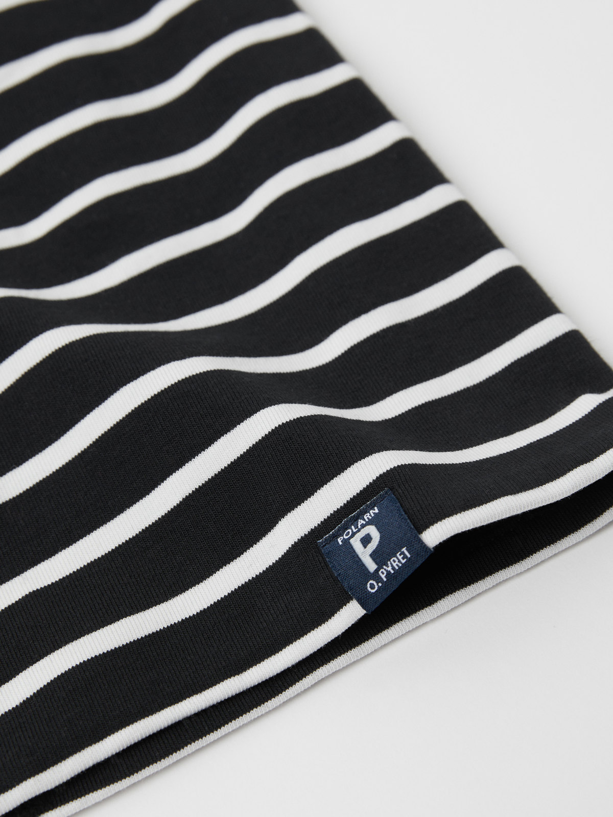Raidallinen kauluri luomupuuvillaa. Kaulurin sisäpuolella pehmeä fleecevuori kierrätettyä polyesteriä. Kauluri sopii hyvin takin tai haalarin alle lämmittämään kylminä päivinä.