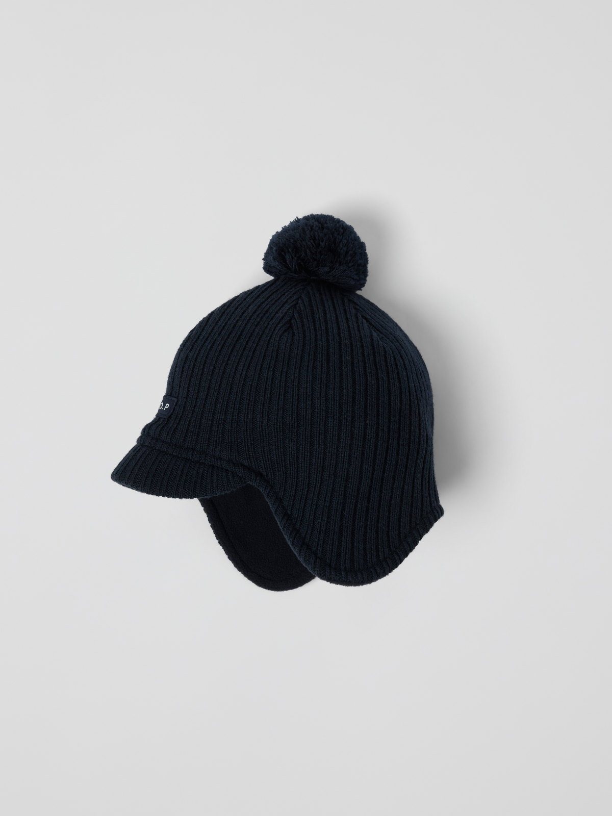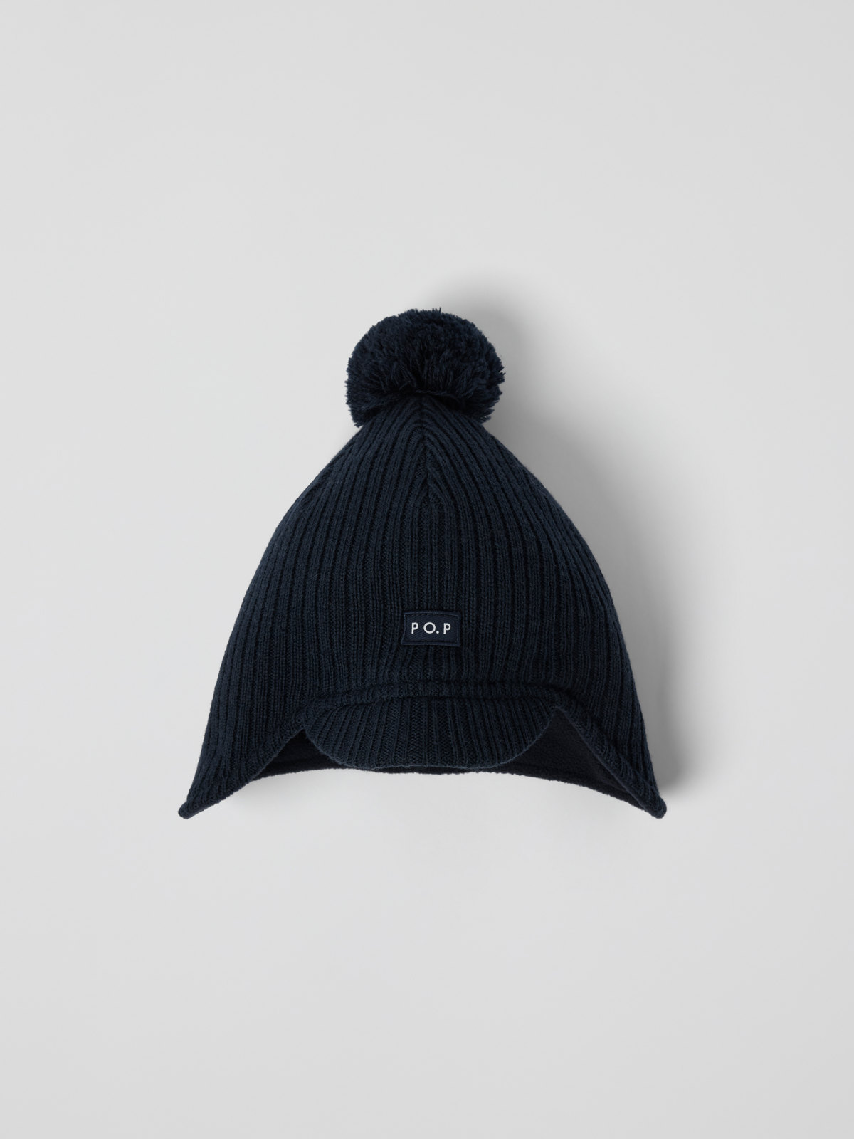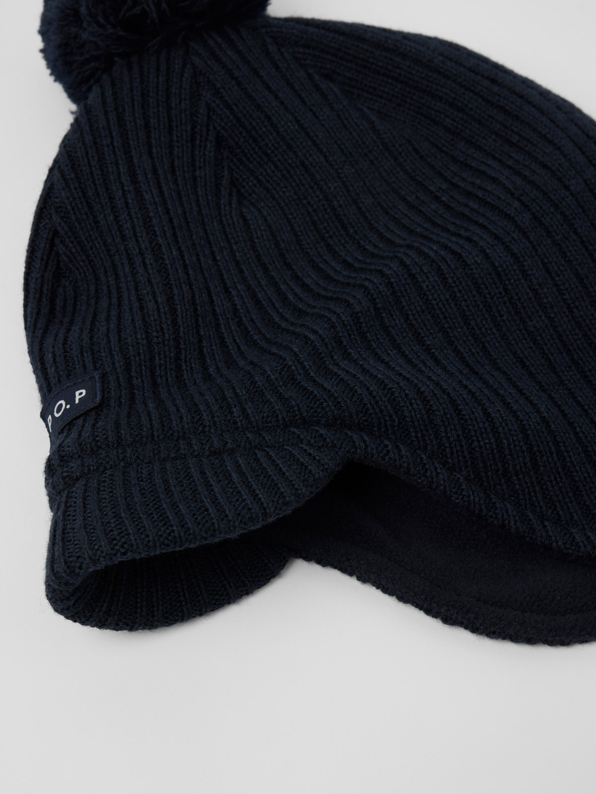 Ribbineulottu pipo lämpimästä villasta, jossa on pehmeä fleecevuori kierrätetystä polyesteristä. Pipo ulottuu hyvin korvien päälle ja siinä on pieni lippa edessä, joka suojaa sateelta ja tuulelta. Päällä on koristeellinen tupsu.