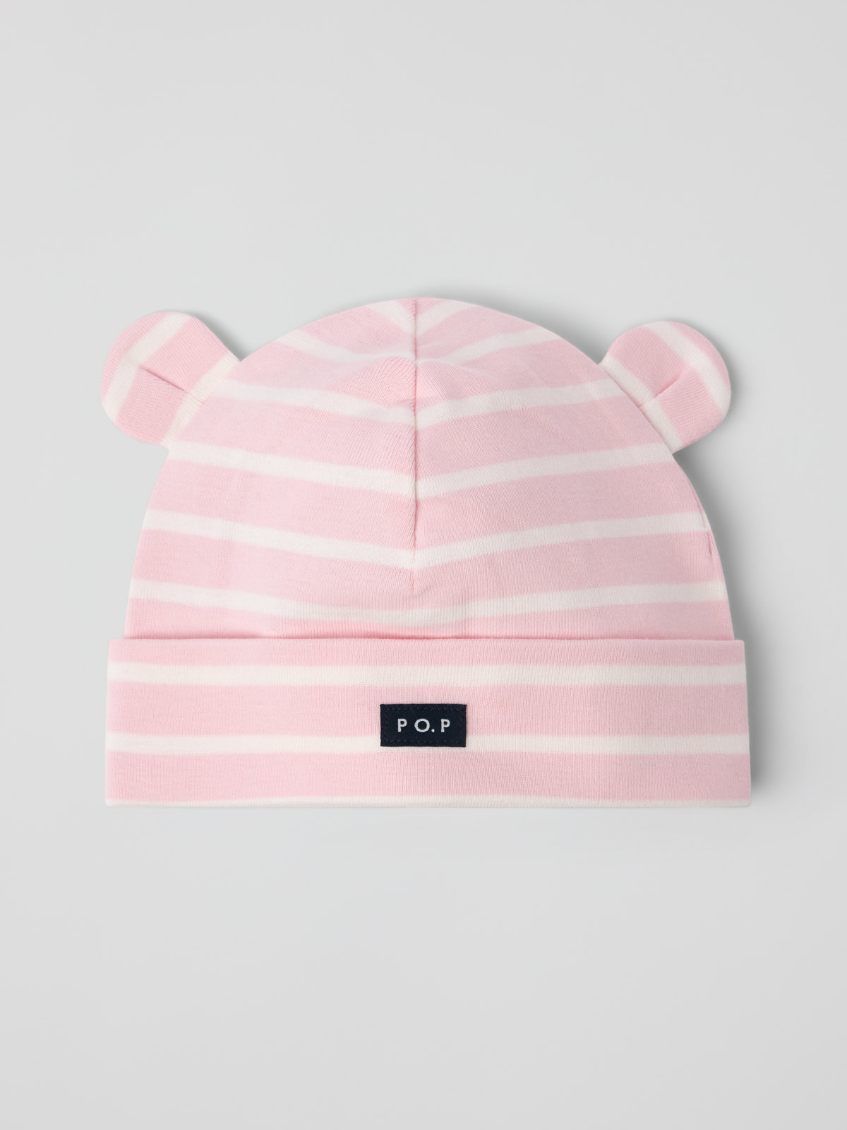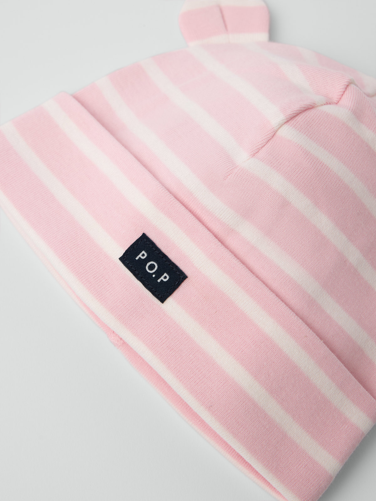 Klassinen raidallinen pipo 100 % luomupuuvillatrikoosta vauvalle. Pipossa on koristeena korvat. Taitoksen avulla pipon kokoa voi säätää vauvan pään koon mukaan.