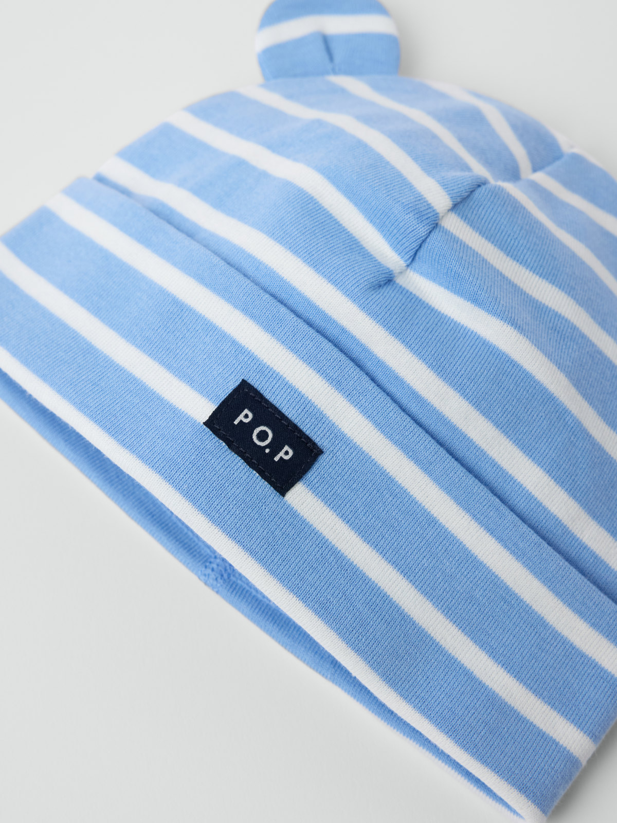 Klassinen raidallinen pipo 100 % luomupuuvillatrikoosta vauvalle. Pipossa on koristeena korvat. Taitoksen avulla pipon kokoa voi säätää vauvan pään koon mukaan.