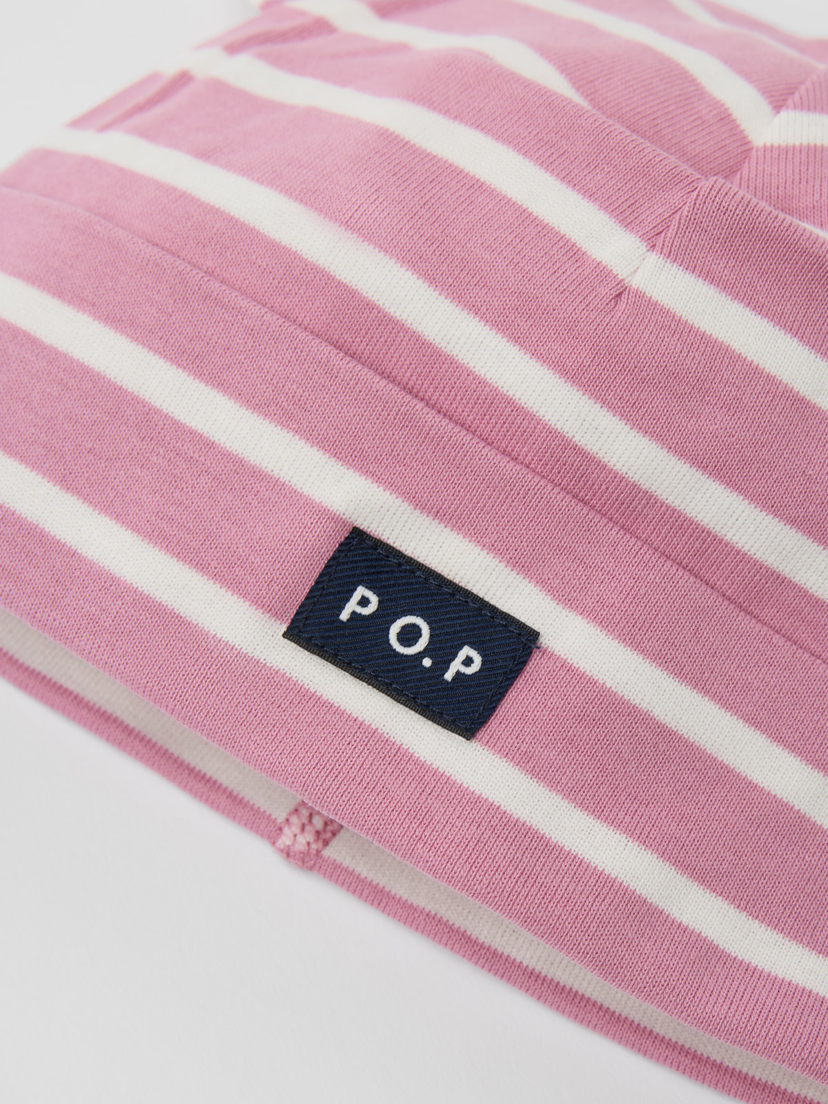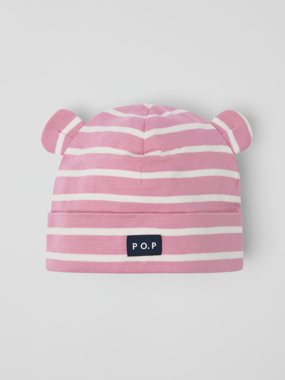 Vauvan raidallinen pipo 100 % luomupuuvillatrikoota. Pipossa on koristeena korvat. Taitoksen avulla pipon kokoa voi säätää vauvan pään koon mukaan.