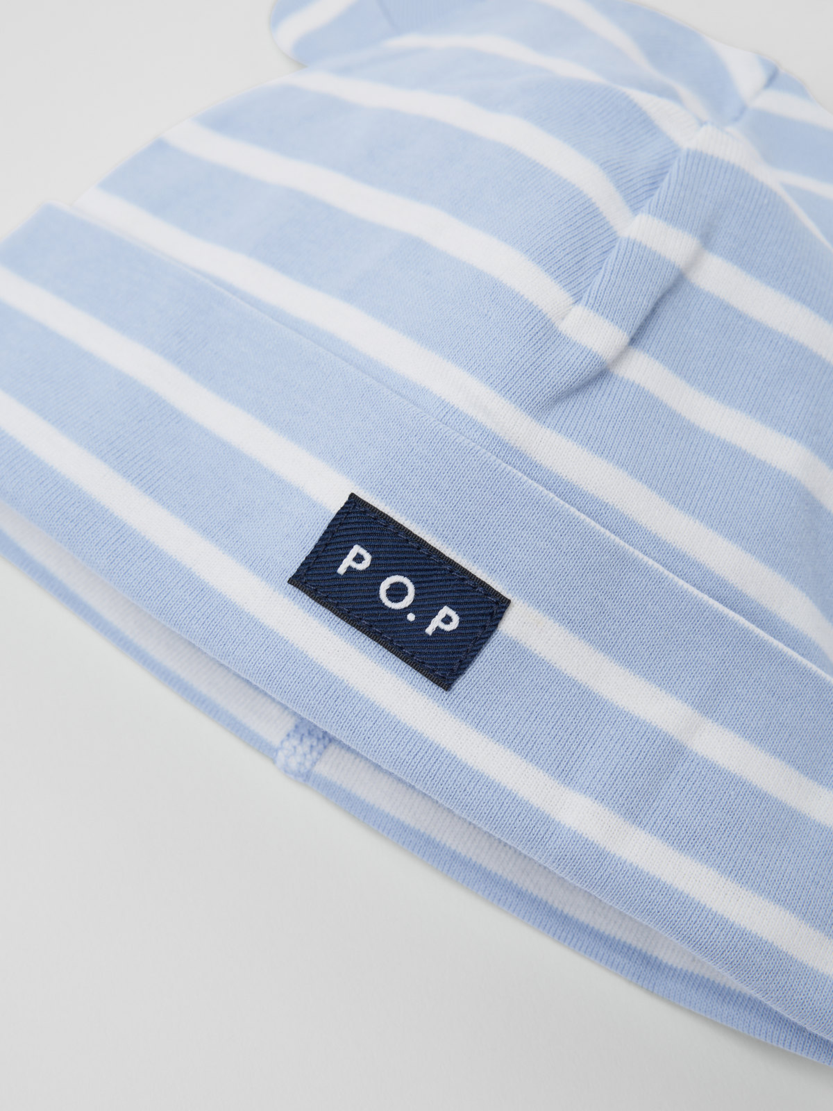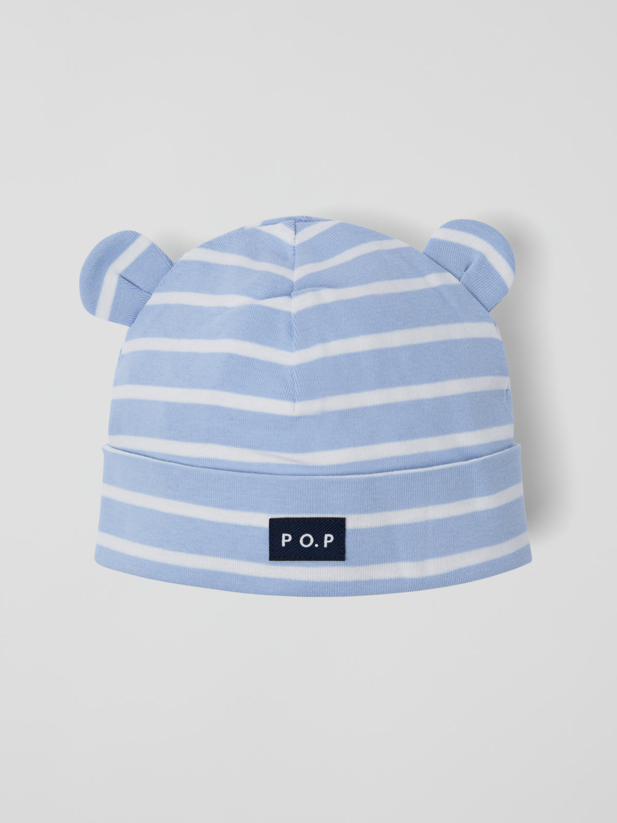 Vauvan raidallinen pipo 100 % luomupuuvillatrikoota. Pipossa on koristeena korvat. Taitoksen avulla pipon kokoa voi säätää vauvan pään koon mukaan.