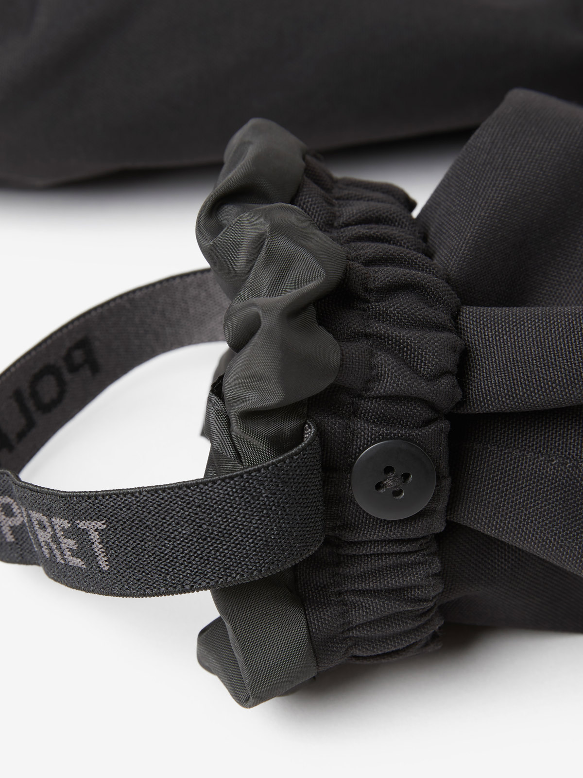 Irrotettavat, säädettävät olkaimet. Vyötäröä voi säätää sivuilla olevalla tarranauhalla. Muotoillut polviosat ja joustavat lahkeensuut takaavat hyvän liikkuvuuden ja istuvuuden. Edessä neppari ja vetoketju. Vaihdettavat joustavat jalkalenkit pitävät lahkeet paikoillaan.