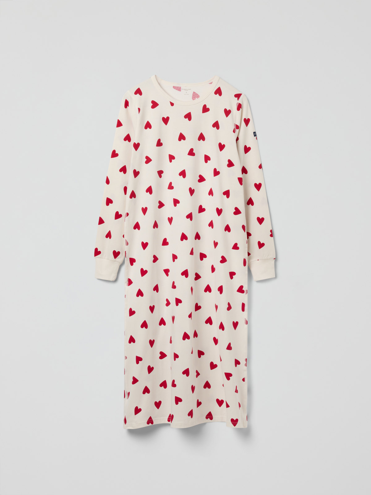 Aikuisten pehmeä ja kaunis yöpaita luomupuuvillaa. Yöpaita on ommeltu erityisen pehmeillä, litteillä saumoilla, jotka eivät hankaa, ja siinä on erityisen pitkät hihansuut.