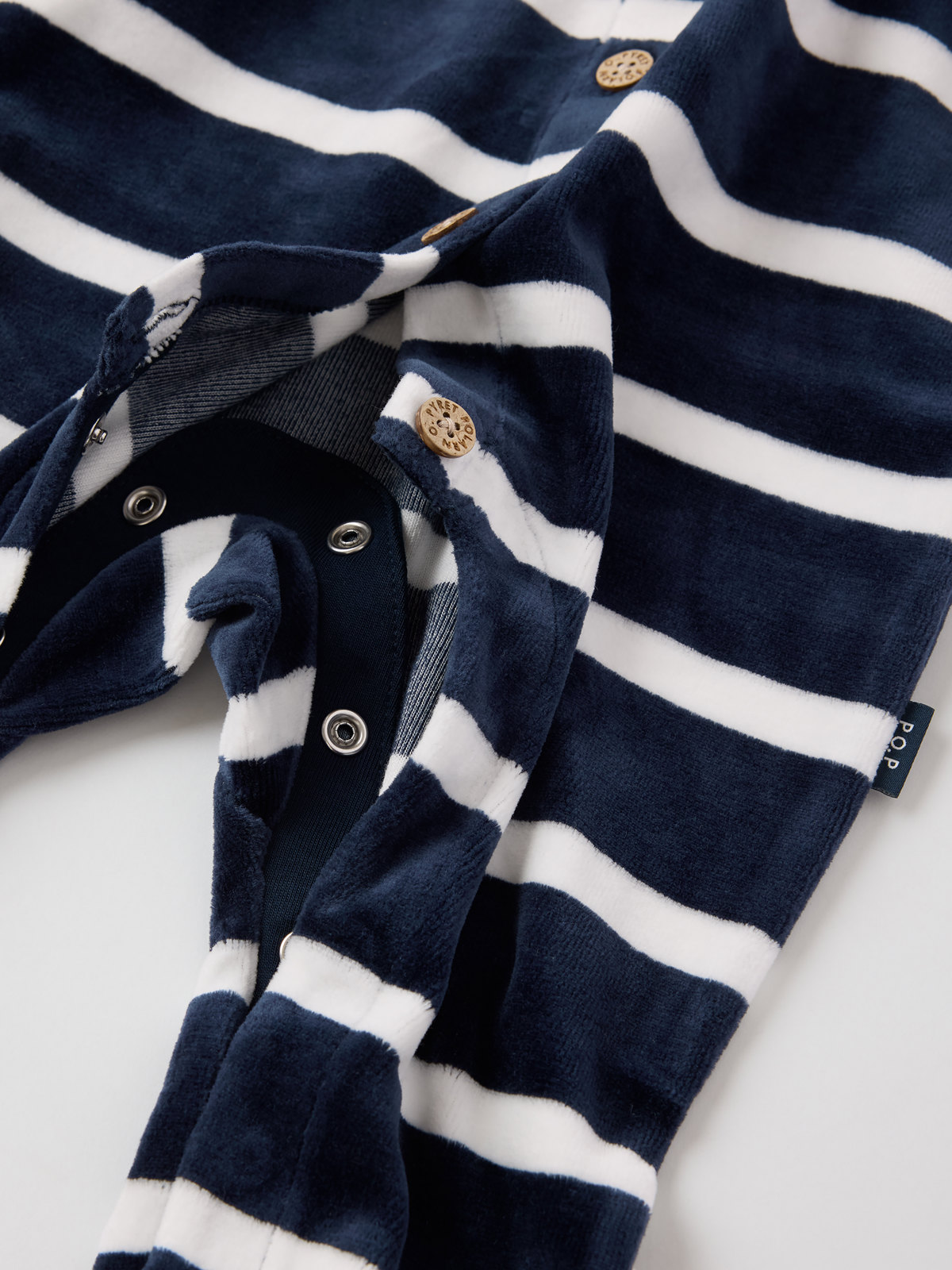 Haalari pehmeästä ja mukavasta luomupuuvillan ja kierrätetyn polyesterin sekoitteesta – suosikki viileisiin päiviin! Haalari suljetaan edestä napilla, resorit hihan- ja lahkeensuissa antavat mukavan istuvuuden. Haaran nepparit helpottavat vaipanvaihtoa.