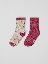 Kahden parin pakkaus sukkia. Pehmeää luomupuuvillaa. Koko on merkitty varren sisäpuolelle, jossa on myös tilaa lapsen nimelle – helppo pitää järjestyksessä!