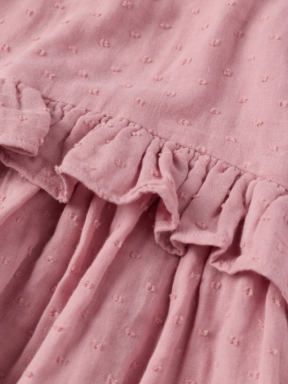 Suloinen vauvan musliinimekko 100 % luomupuuvillaa – sopii kaikkiin tilaisuuksiin! Mekossa on röyhelöitä vyötäröllä ja olkapäillä, ja se suljetaan nappilistalla takaa. Hihoissa on joustavat hihansuut.