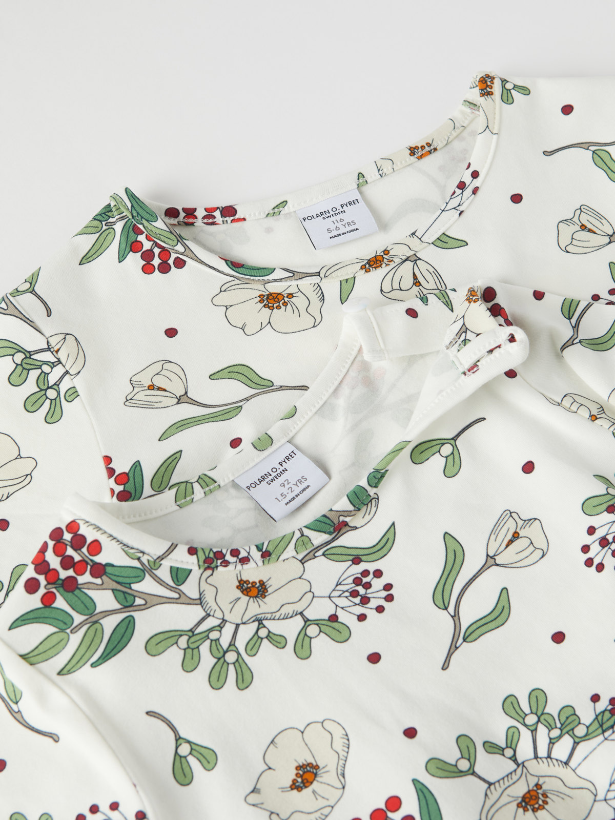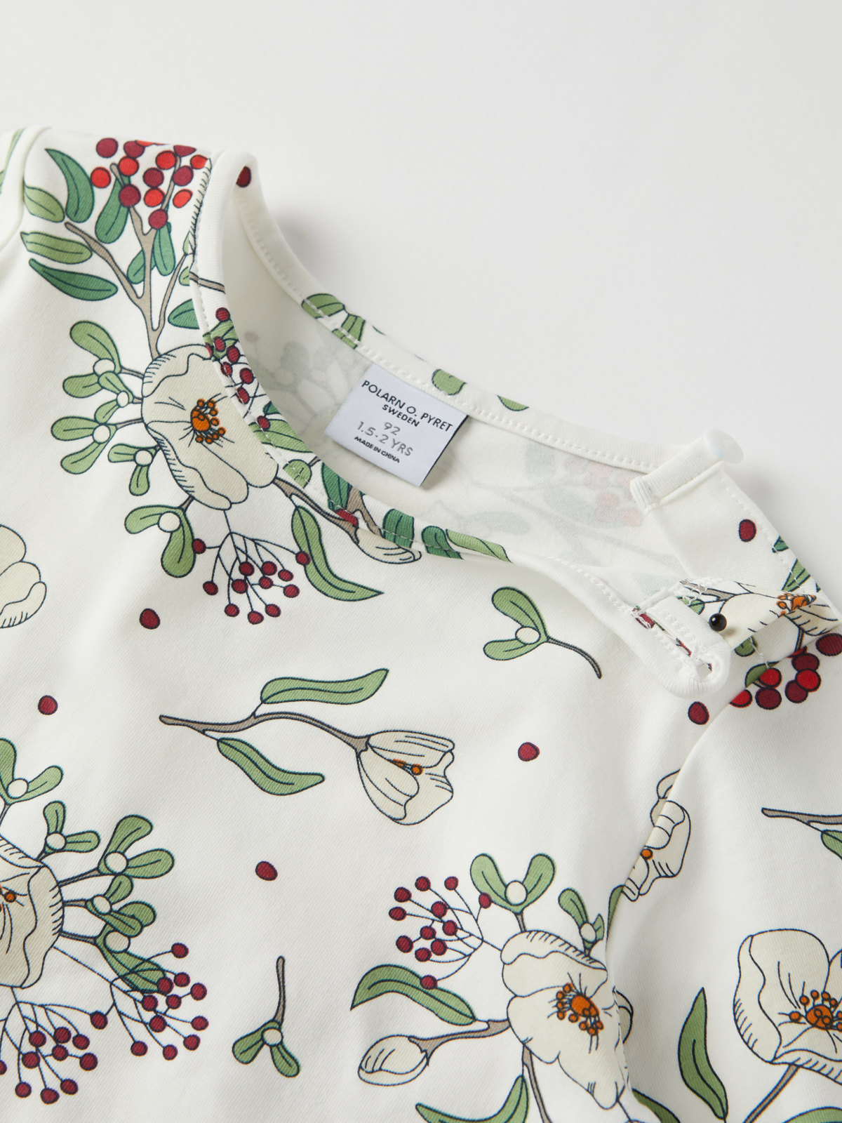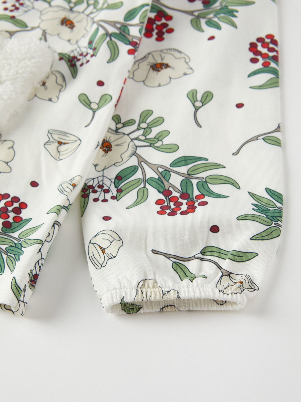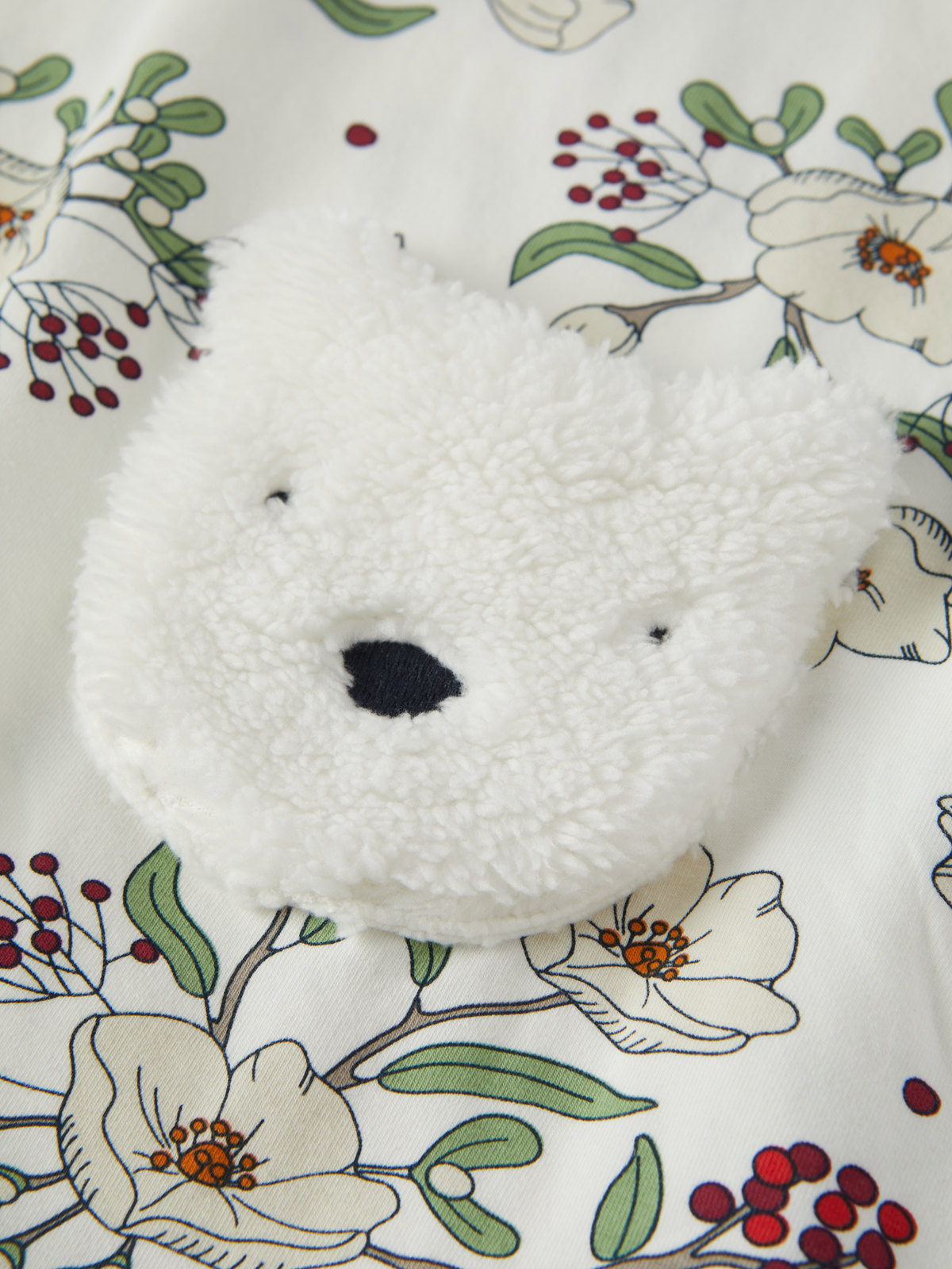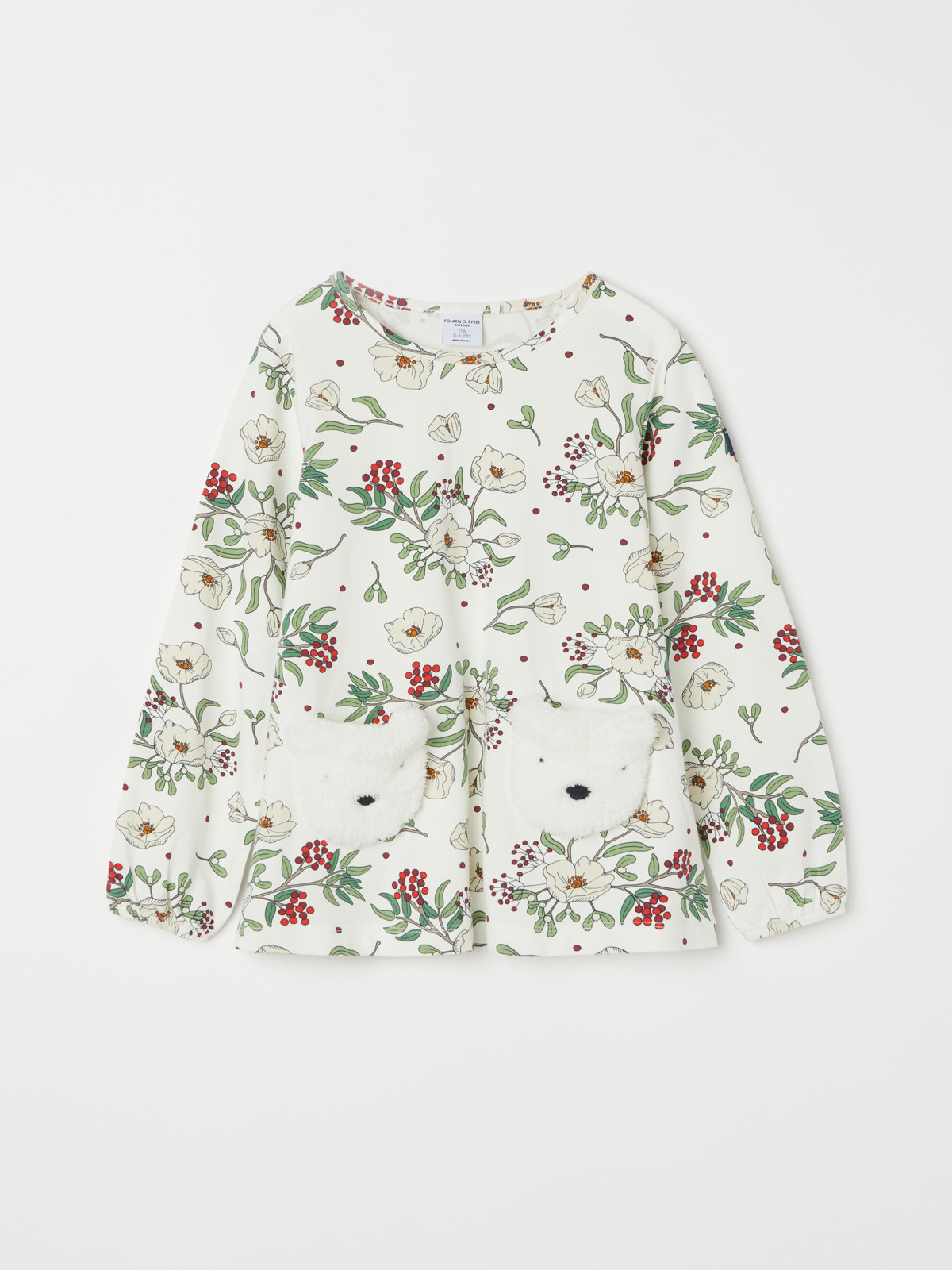 Kukkakuvioinen paita pehmeää luomupuuvillaa. Paidassa on kaksi hauskaa karhutaskua ja joustavat hihansuut.