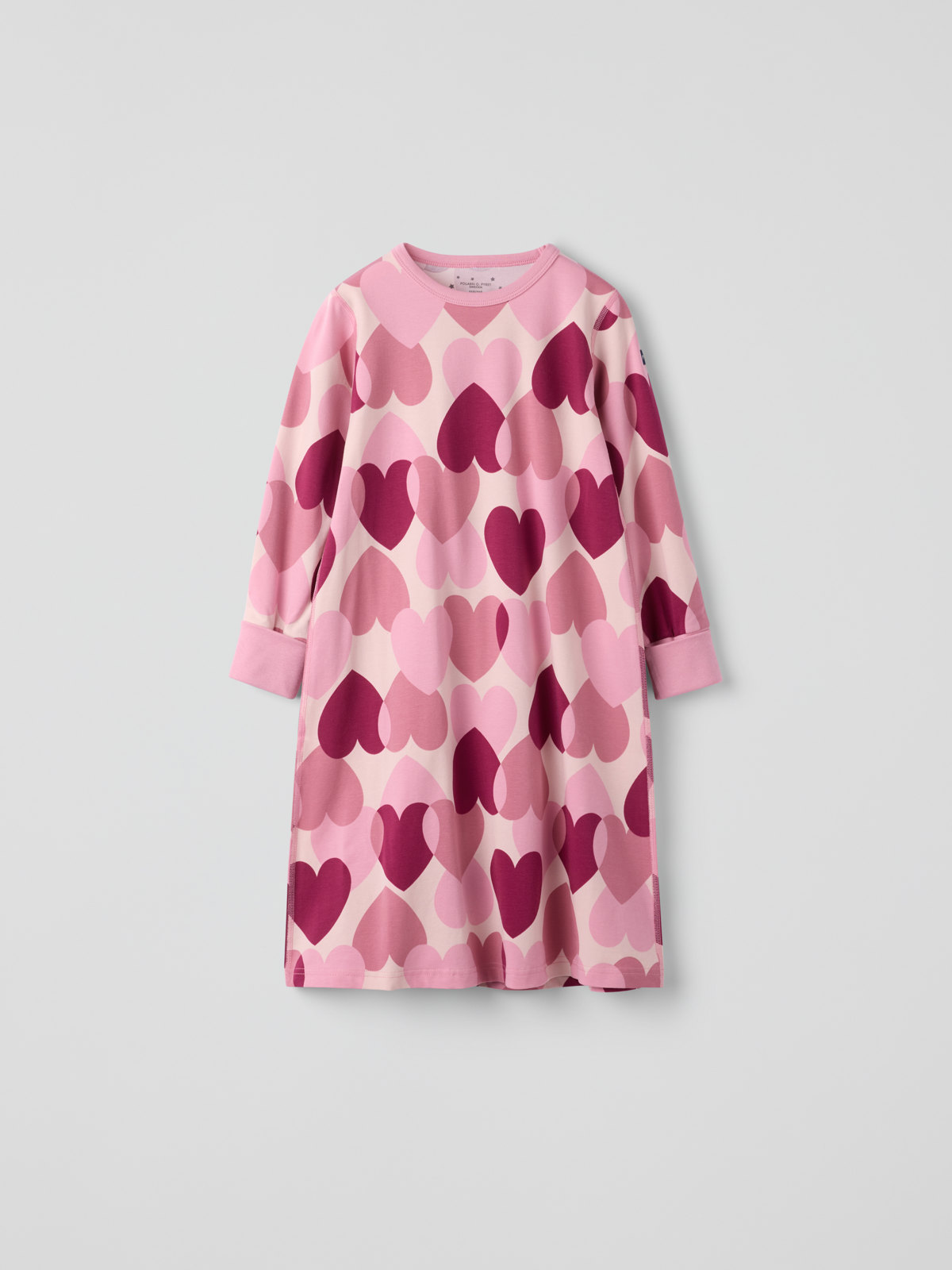 Pehmeä ja kaunis yöpaita 100 % luomupuuvillaa. Yöpaita on kuvioitu kokonaan marjakuviolla. Hihansuissa erityisen pitkät resorit.