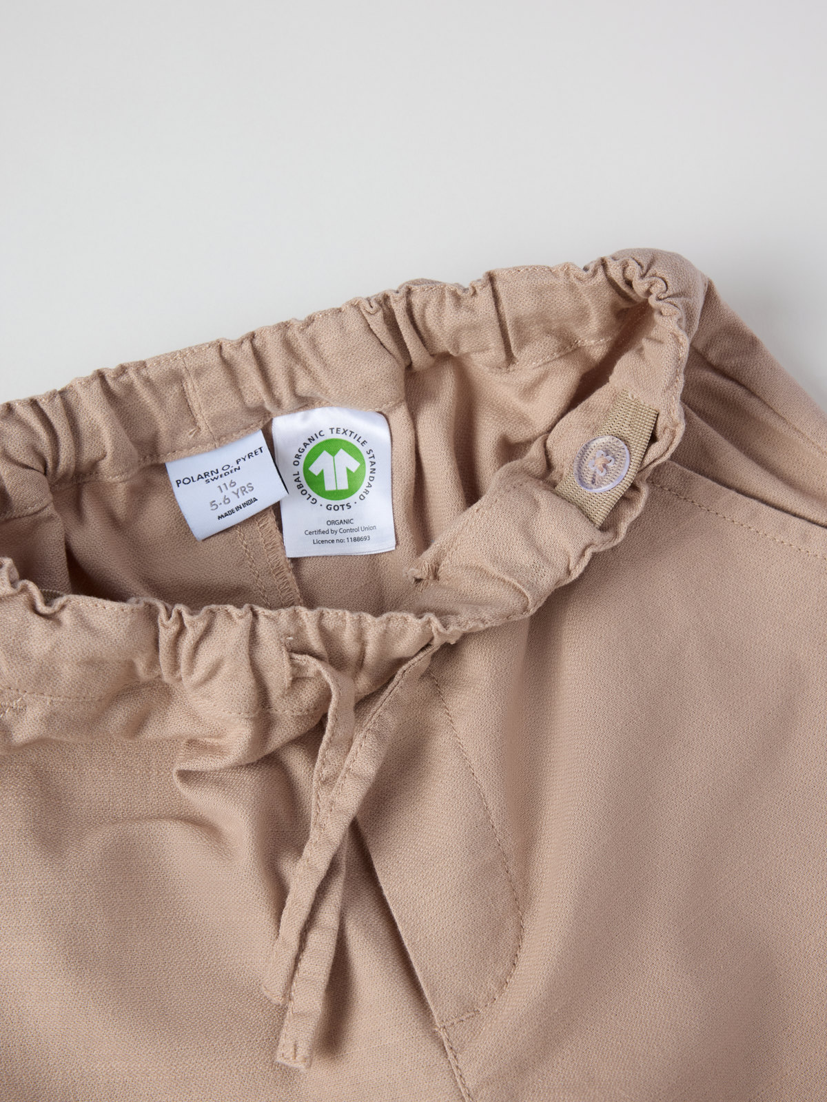 Yksiväriset housut ohutta, pellavalta tuntuvaa luomupuuvillaa – mukavat sekä arkeen että juhlaan! Housuissa on suorat lahkeet, kaksi etutaskua sekä joustava vyötärö, jota voi säätää kiristysnauhalla.