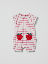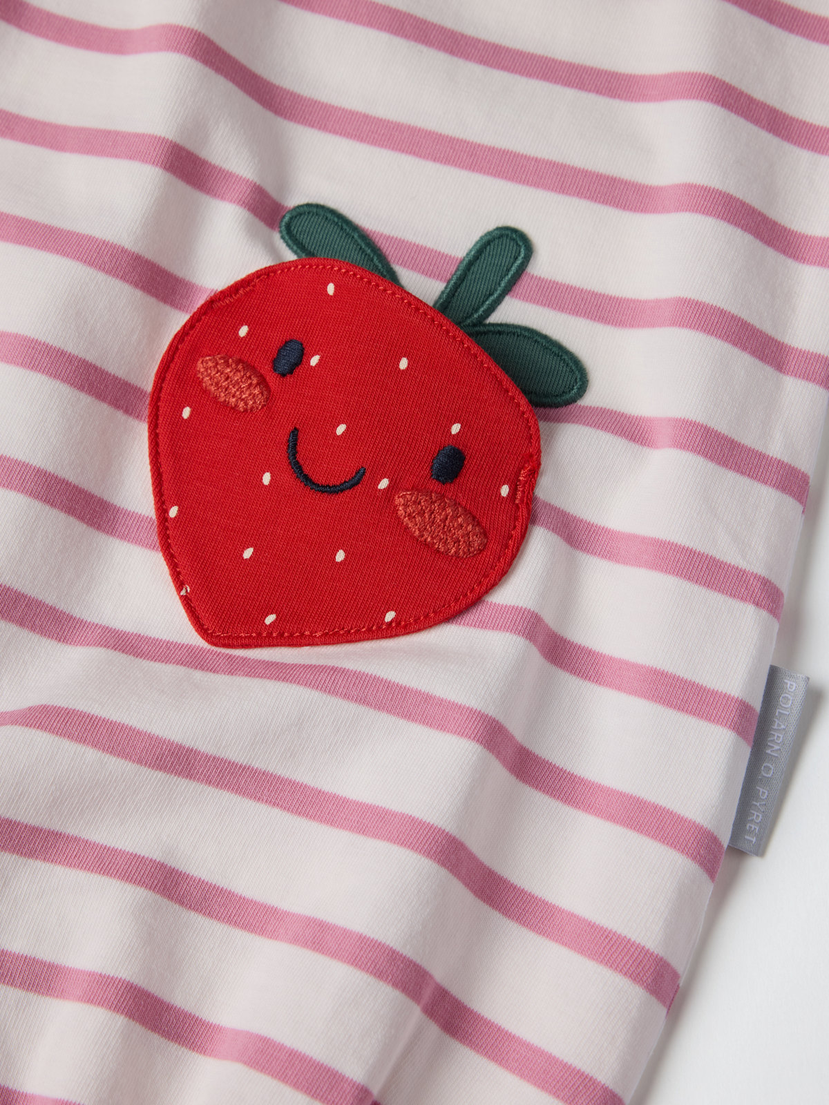 Vauvan raidallinen haalari luomupuuvillatrikoota. Hauskat mansikkataskut – pehmeä ja juhlava kesäsuosikki! Haalarissa on ilmava malli. Lyhyet perhoshihat, joissa on aaltoilevat hihansuut. Joustava pääntie ja joustavat lahkeensuut.