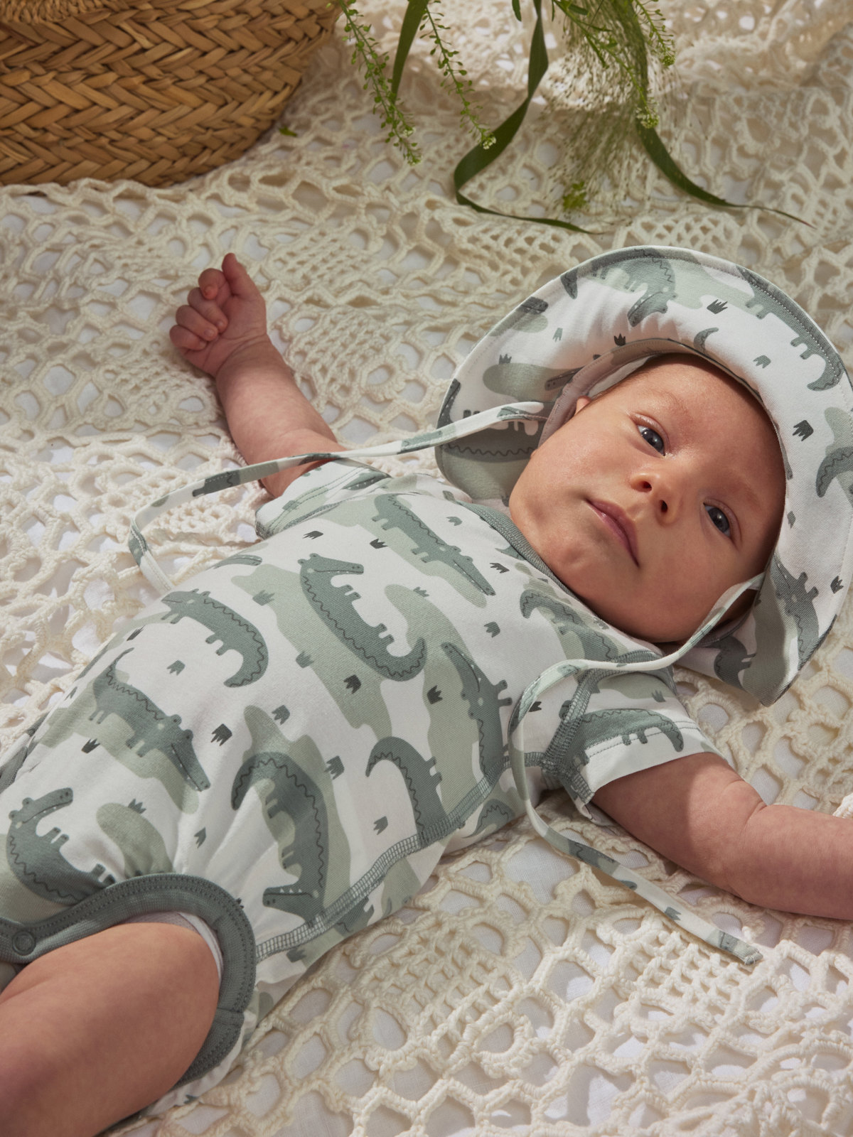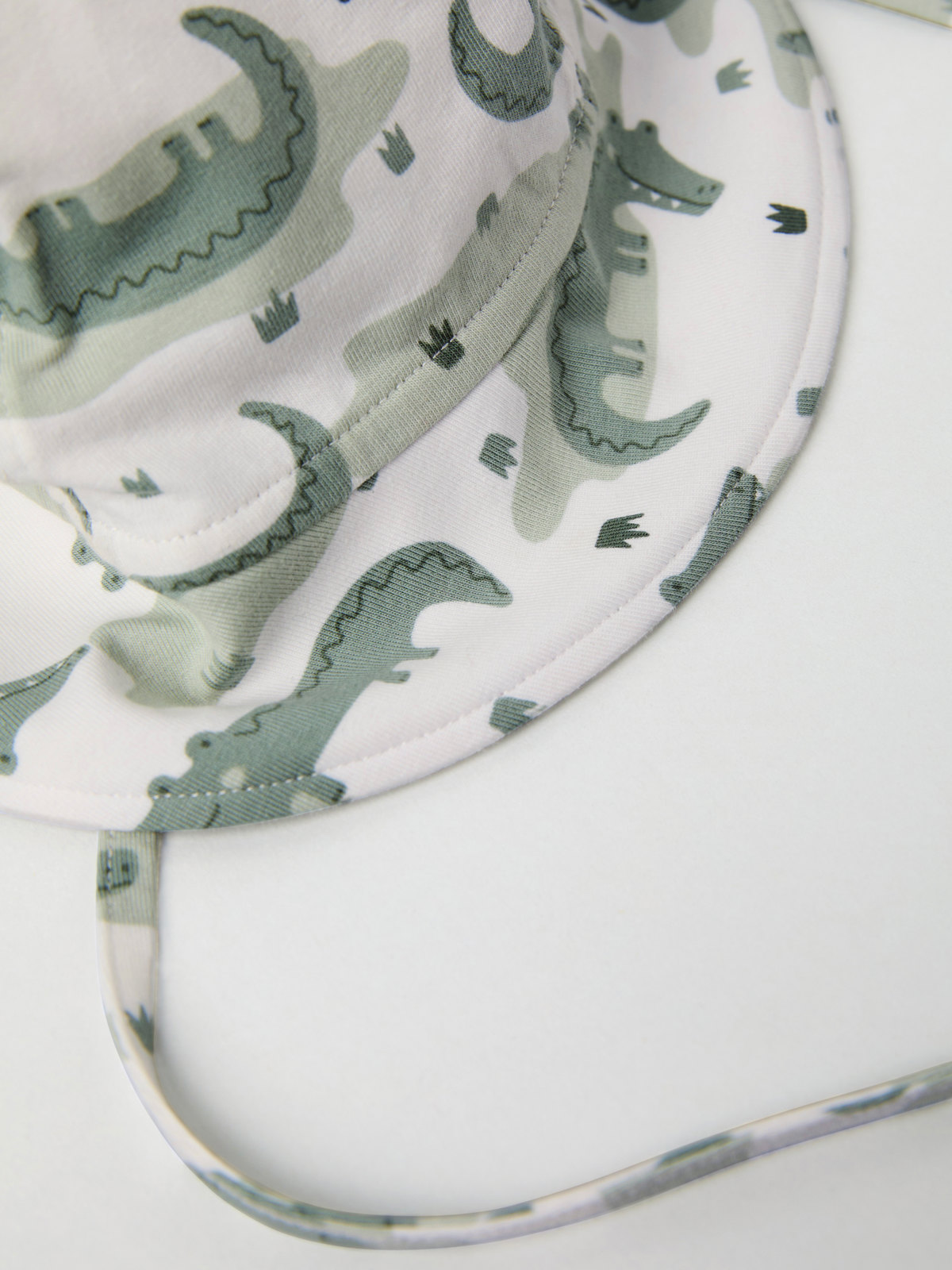 Aurinkohattu 100 % luomupuuvillaa – perheen pienimpien suosikki auringossa! Aurinkohattu on kuvioitu kokonaan krokotiilikuviolla. Pehmeät solmittavat nauhat pitävät hatun paikallaan.