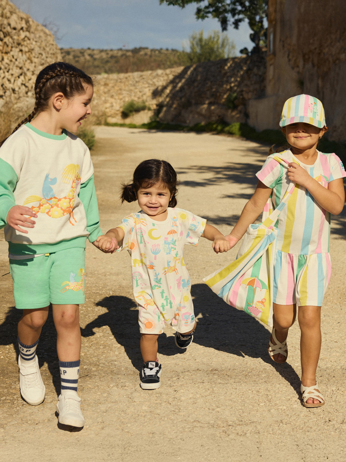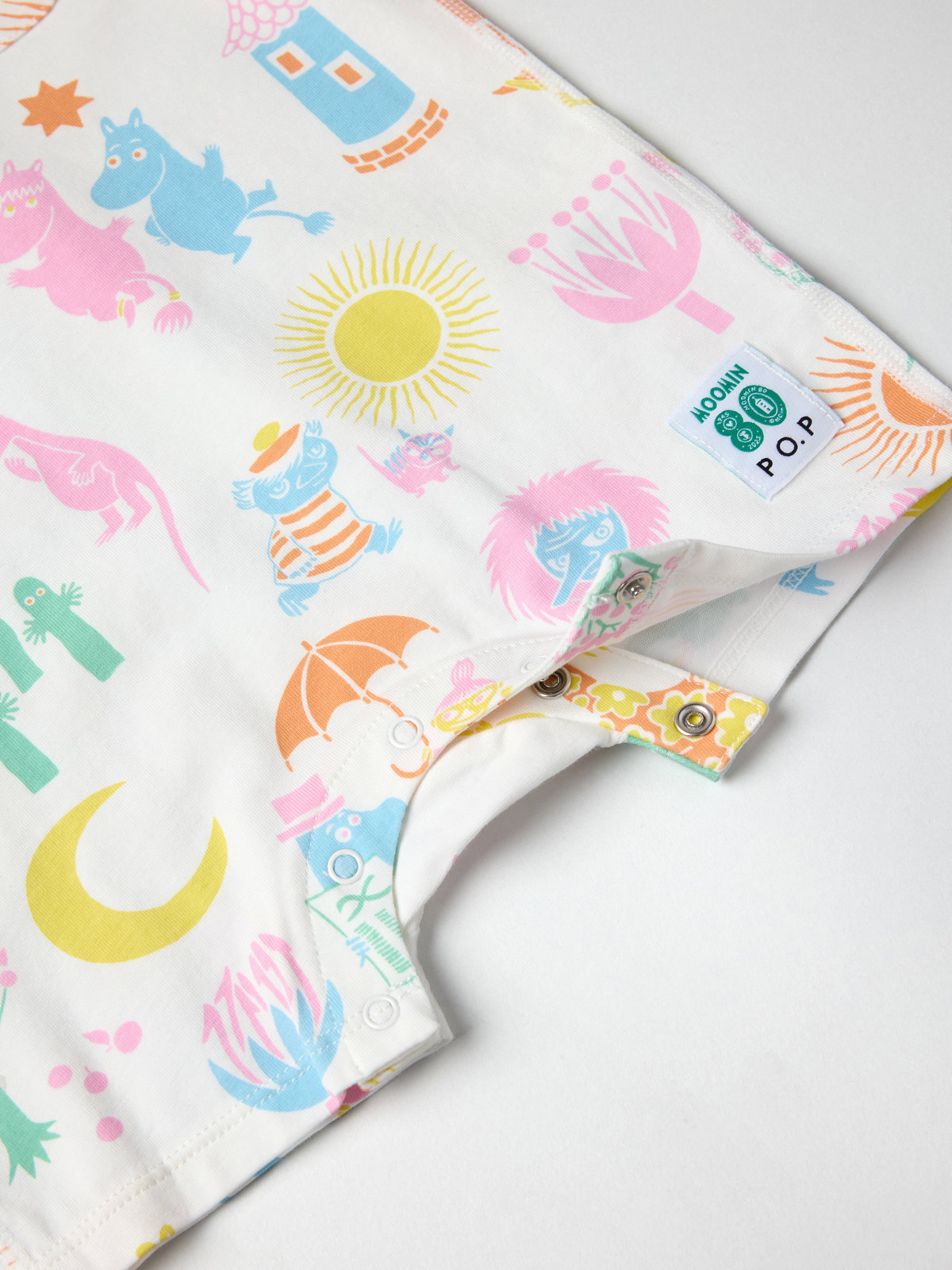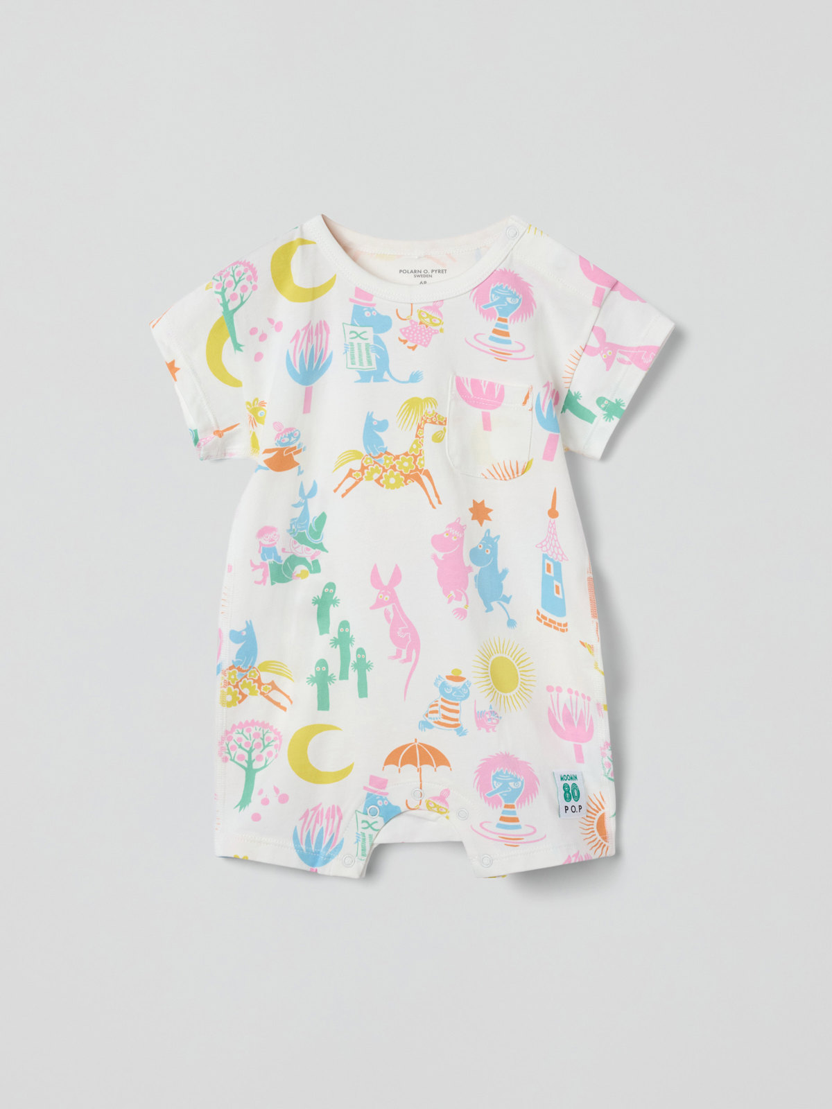 Vauvan lyhyt haalari pehmeää luomupuuvillaa – todellinen kesäsuosikki! Haalari on kuvioitu kokonaan Tove Janssonin muumitarinoiden hahmoilla. Erittäin pehmeät ja litteät saumat, jotka tuntuvat pehmeältä herkkää ihoa vasten.