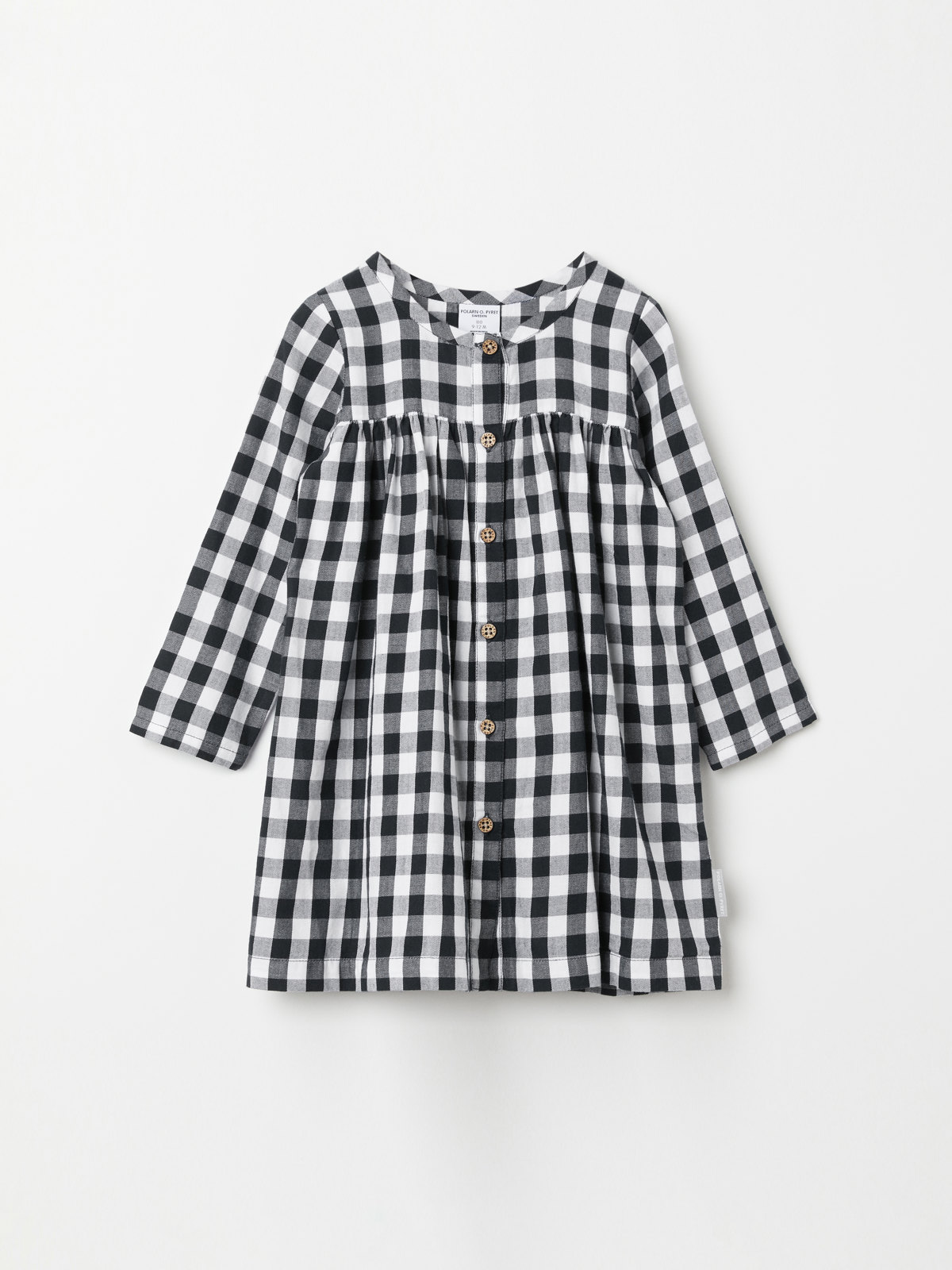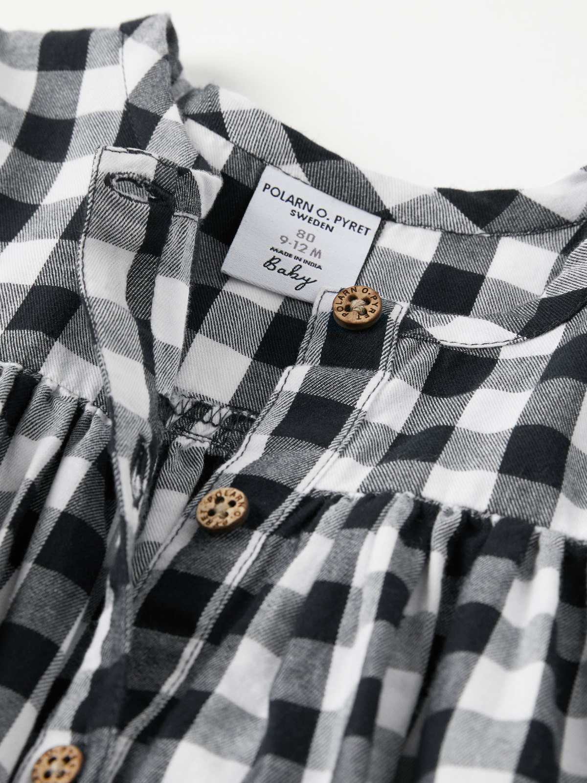 Vauvan pitkähihainen, ruudullinen mekko kudottua kangasta. Täydellinen kaikkiin juhlaviin tilanteisiin! Mekko on valmistettu 100 % luomupuuvillasta. Edessä nappikiinnitys.