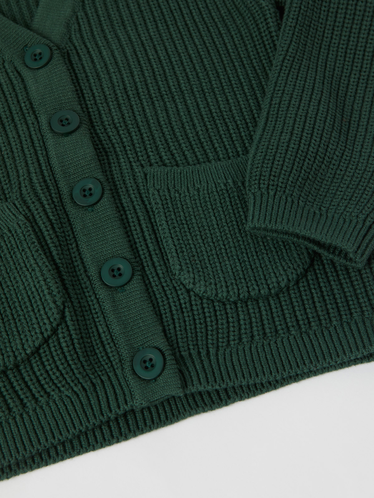 Neuletakissa on V-pääntie ja pehmeät resorit hihansuissa ja helmassa.