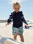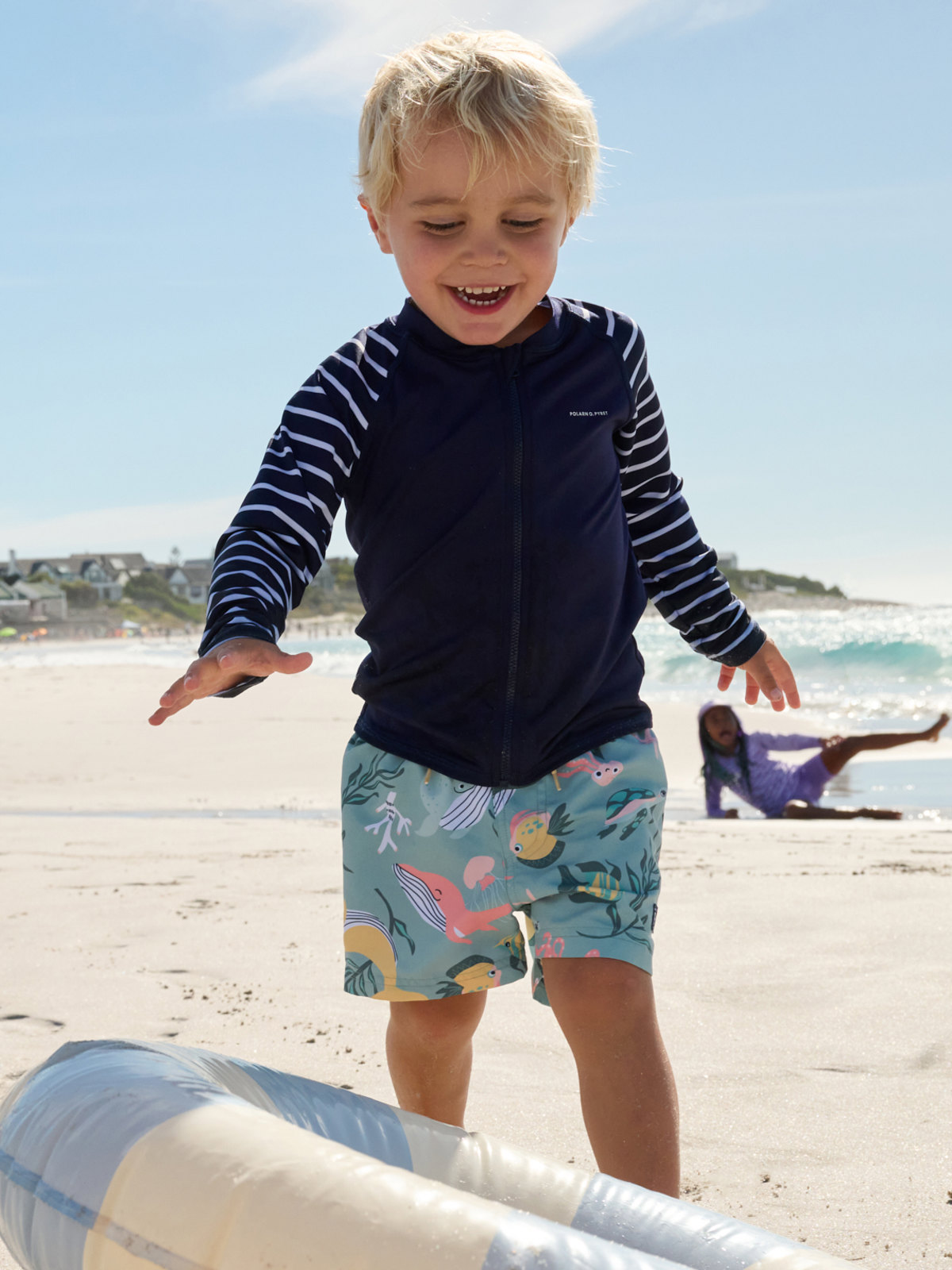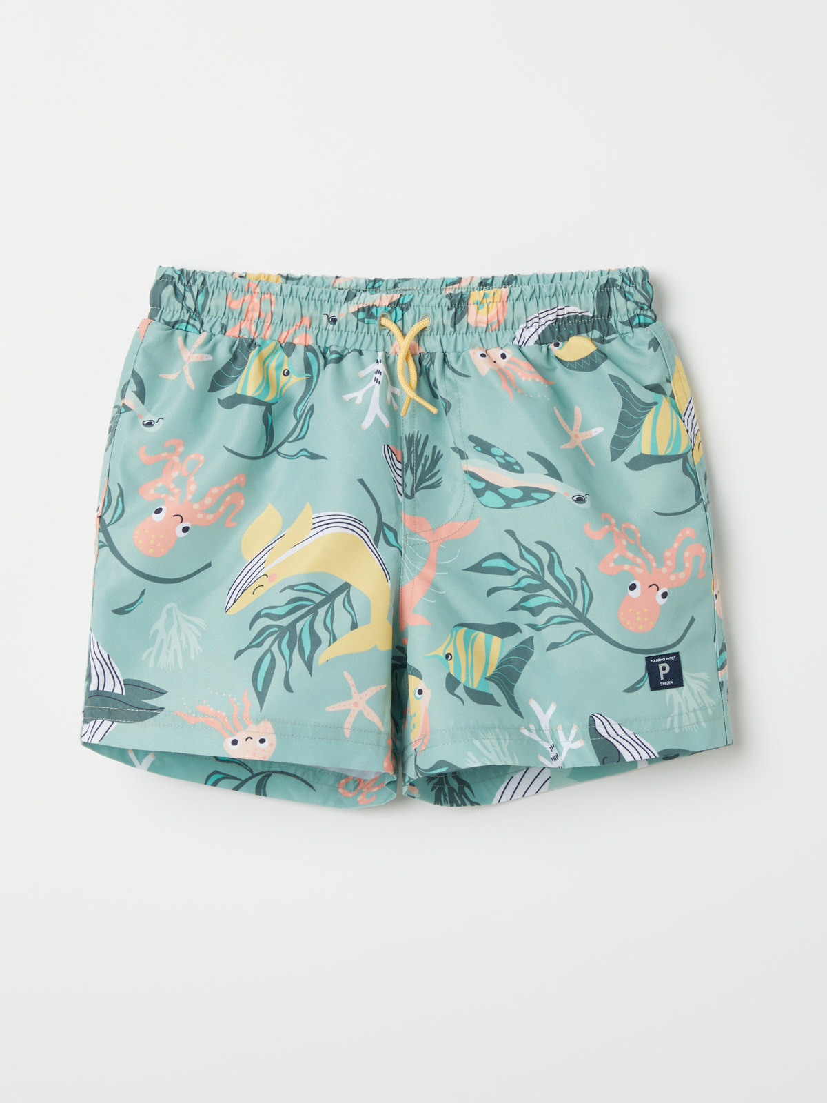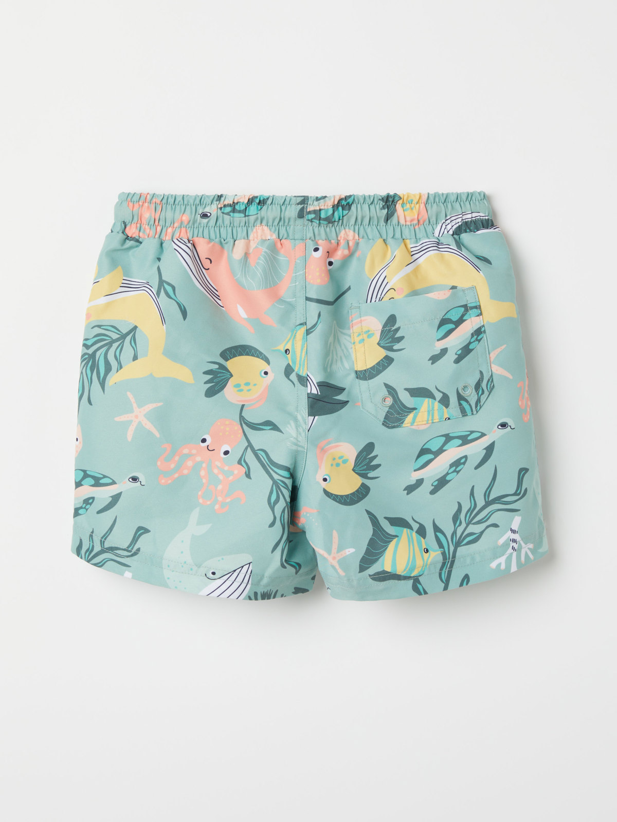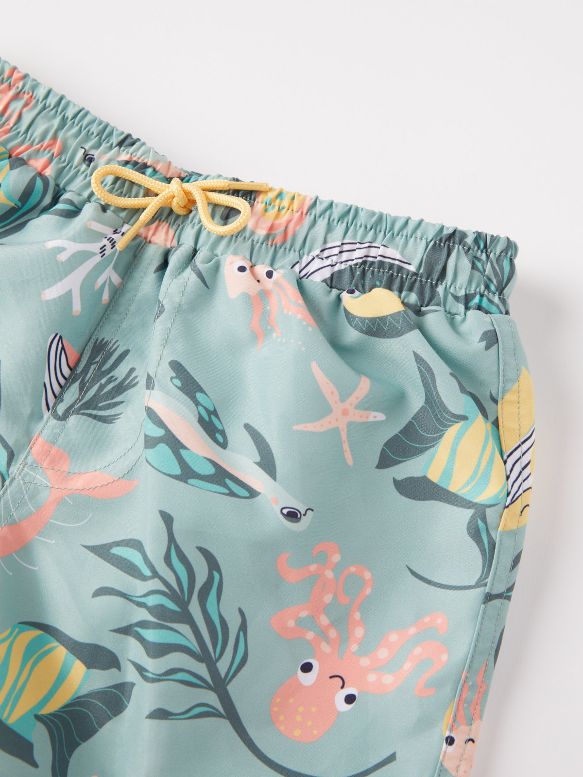 Uimashortsit, joissa on joustava vyötärö ja kiristysnauha. Kuvioitu kokonaan vedenalaisilla eläimillä.