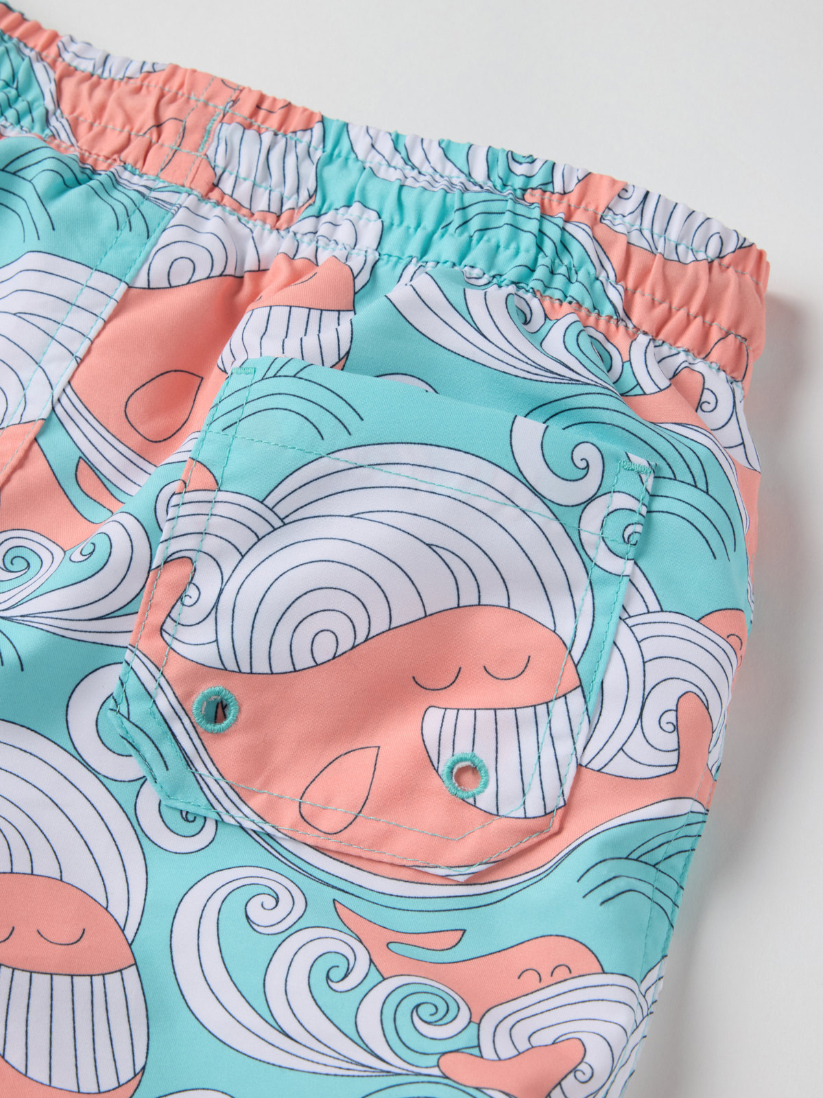 Uimashortsit, joissa on joustava vyötärö ja kiristysnauha. Kuvioitu kokonaan valaskuviolla. Shortseissa on pehmeä verkkovuori ja takatasku. Valmistettu kierrätetystä polyesteristä.