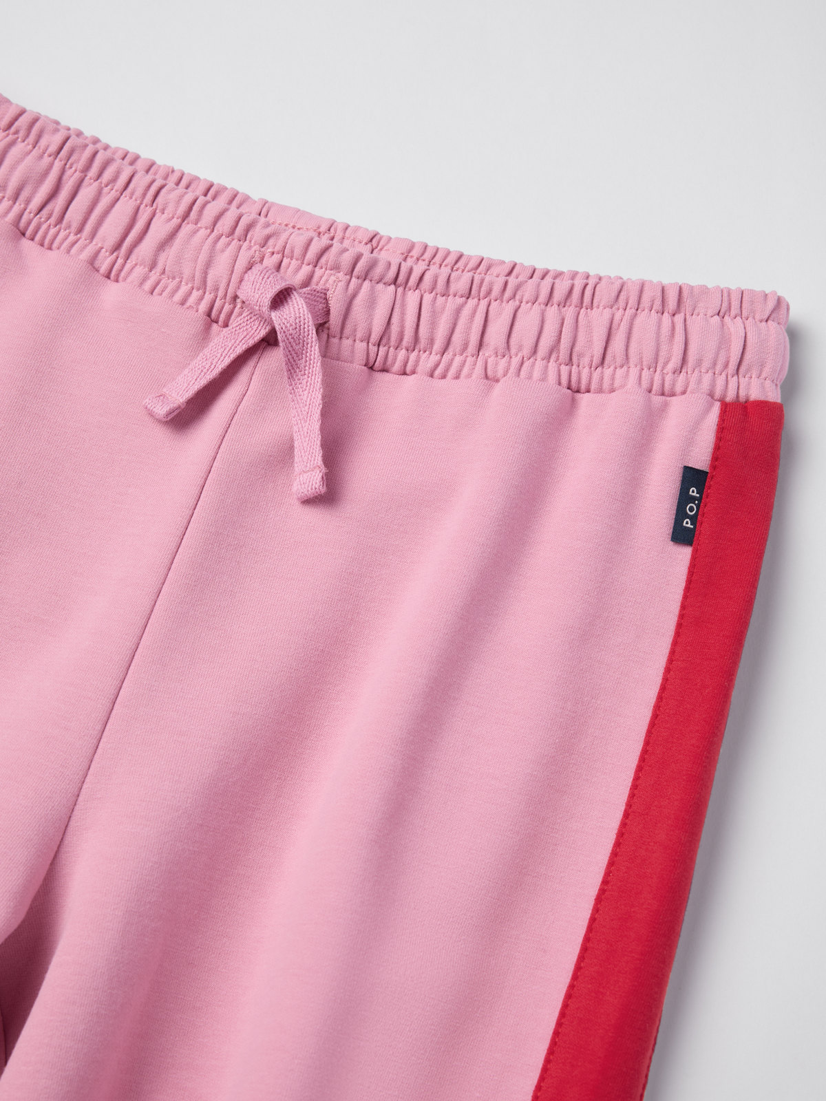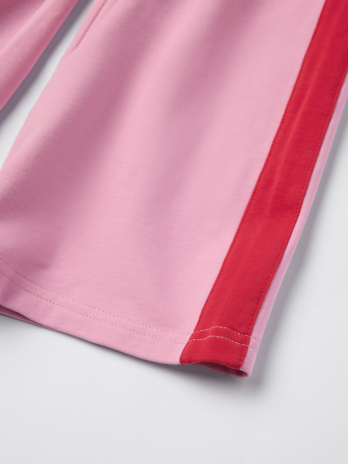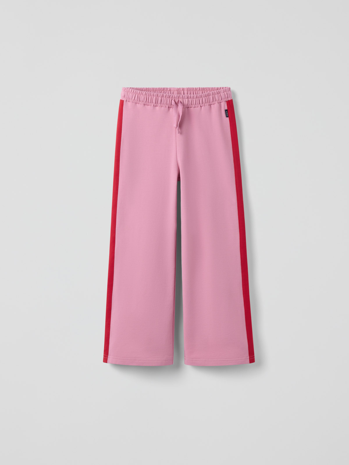 Housut 100 % luomupuuvillaa, pehmeää collegekangasta. Housuissa on kontrastiväriset raidat sivuilla ja suorat lahkeet. Joustava vyötärö on säädettävissä kiristysnyörillä.