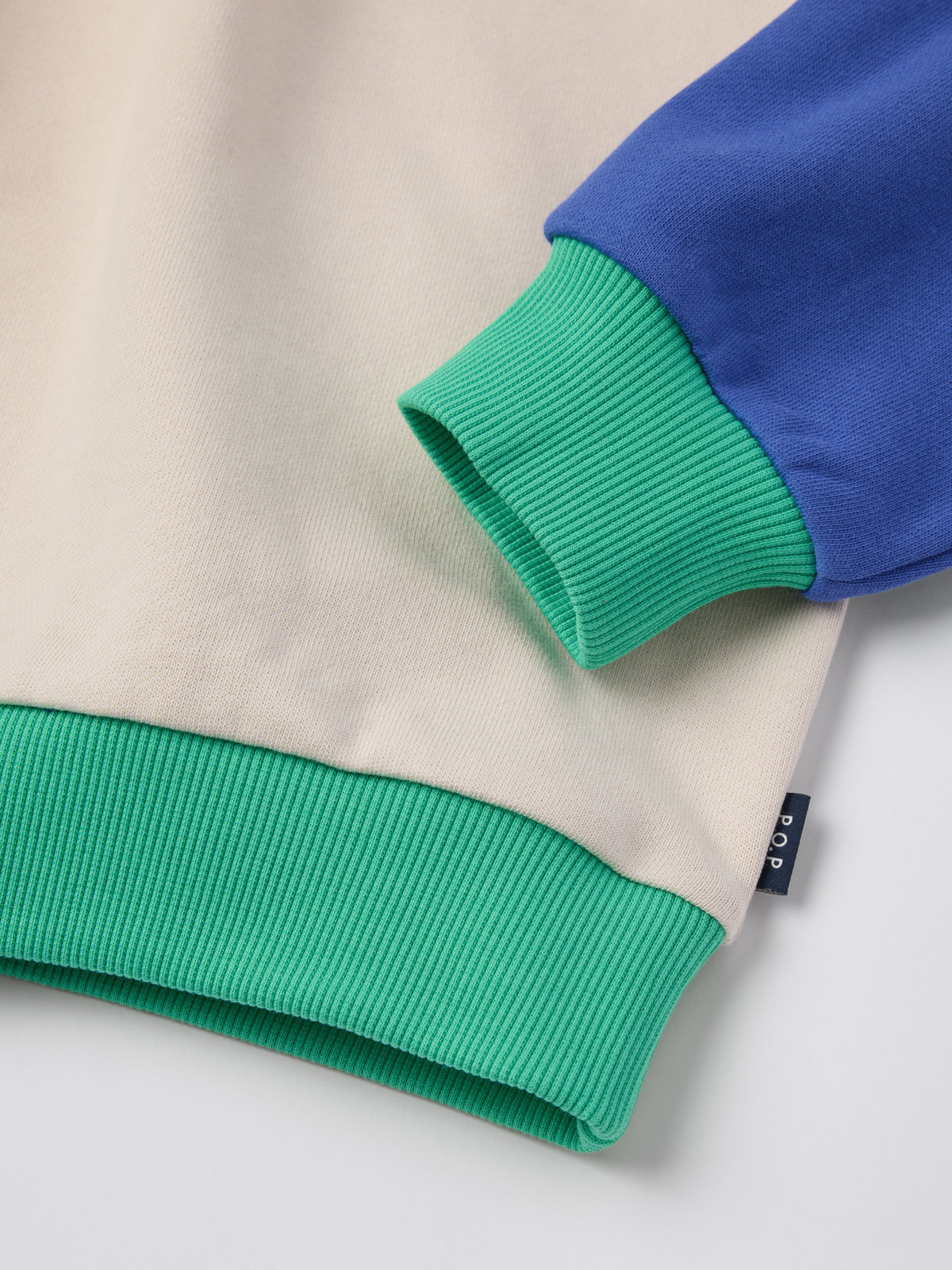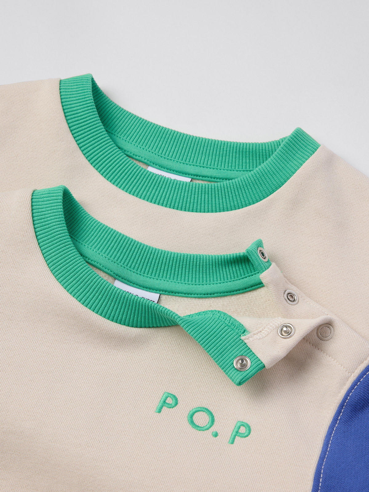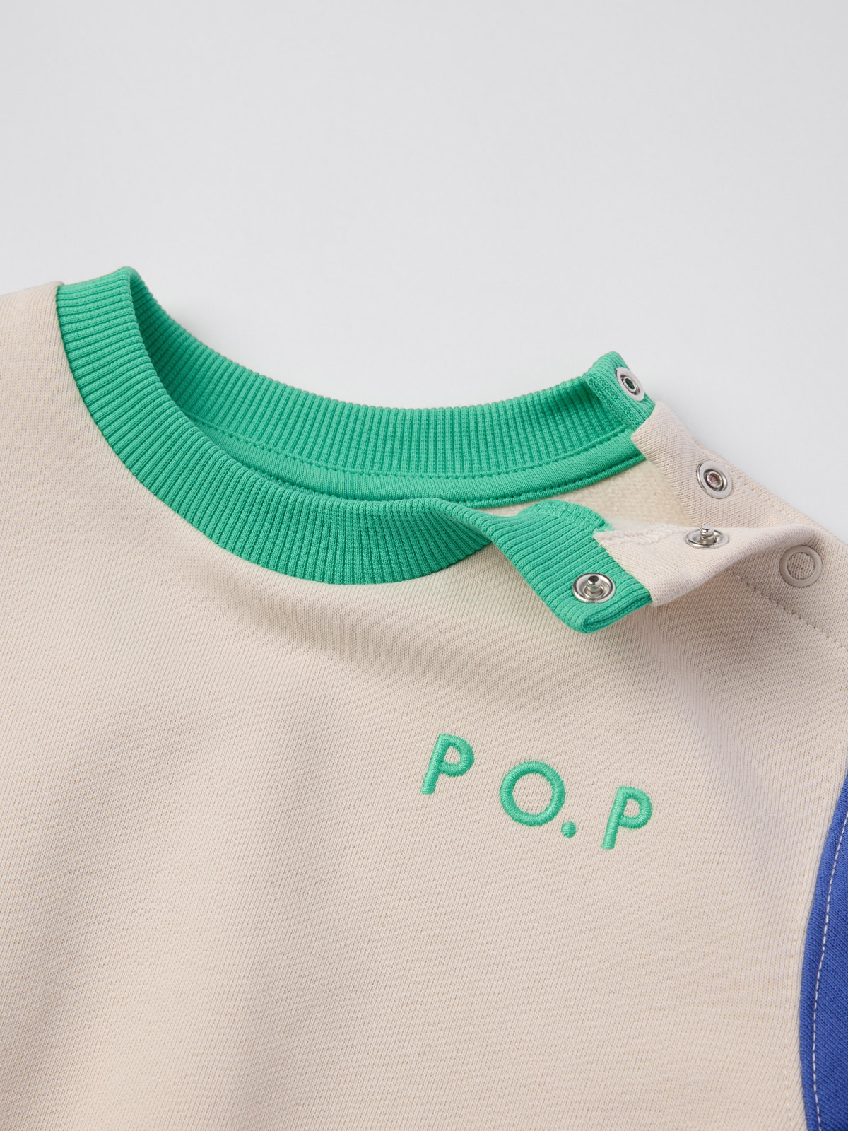 Paita 100 % luomupuuvillaa, pehmeää collegekangasta. Paidassa on kontrastivärisiä yksityiskohtia, pieni PO.P-brodeeraus rinnassa sekä pehmeät resorit pääntiessä, hihansuissa ja helmassa mukavaa istuvuutta varten.