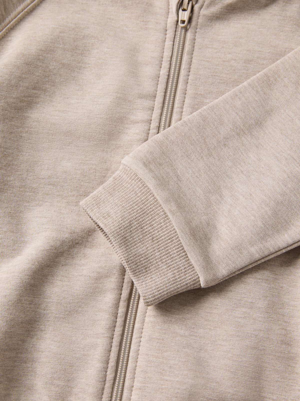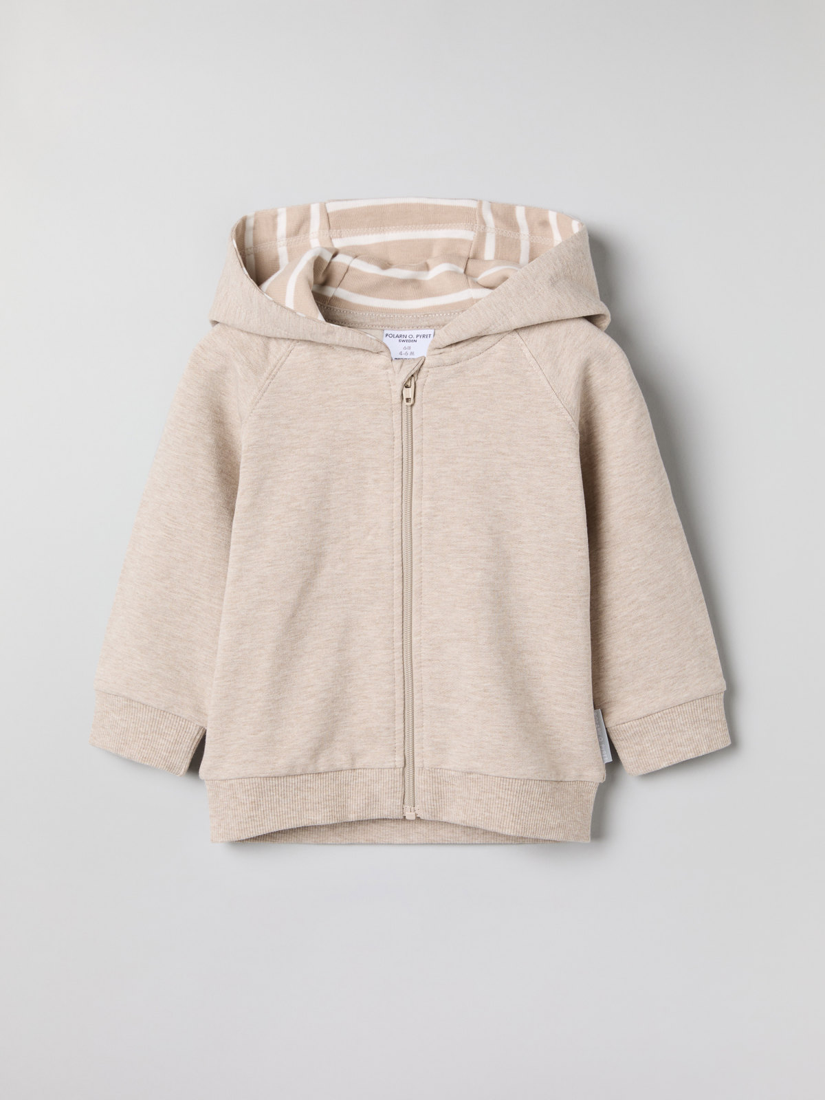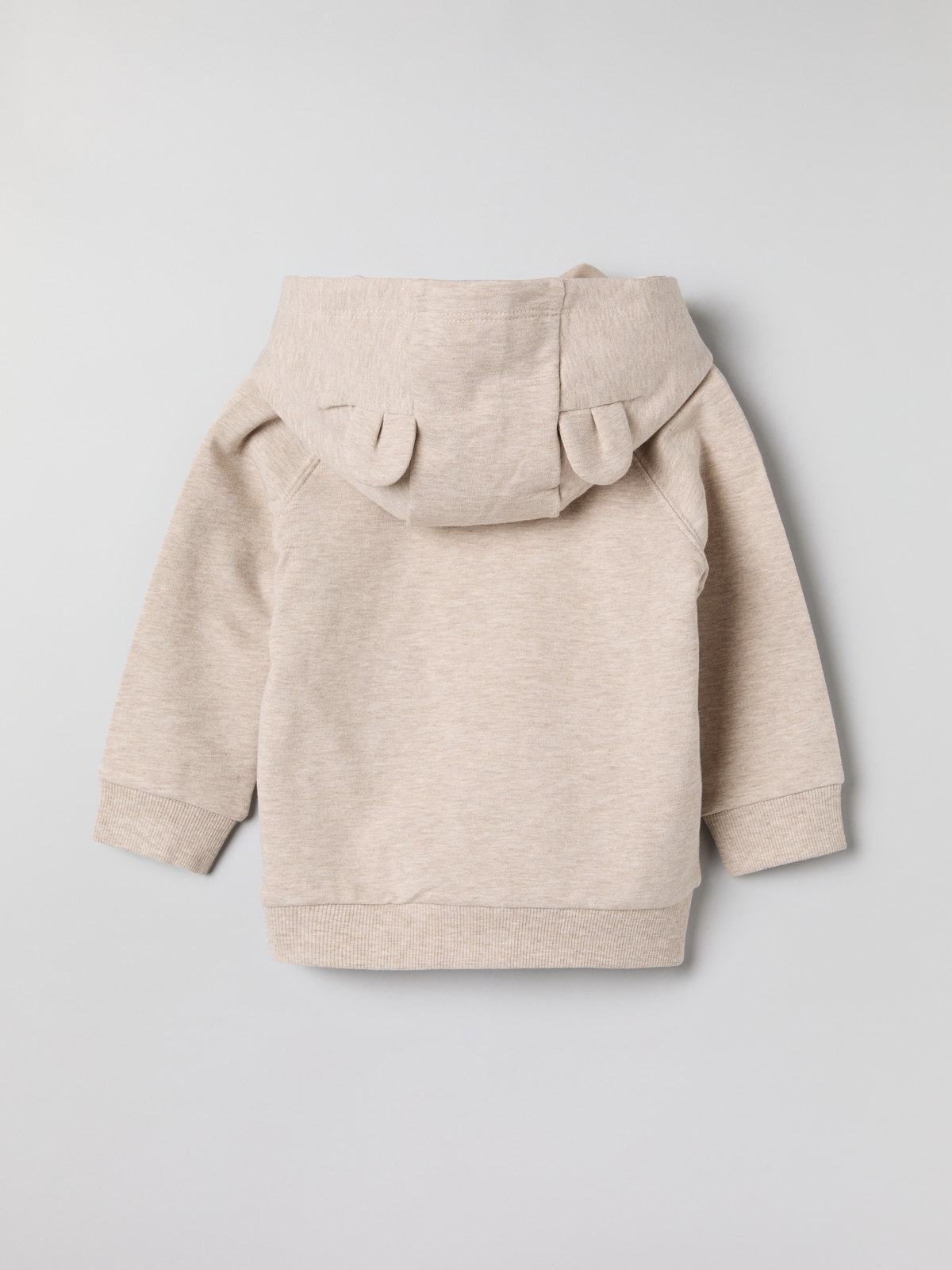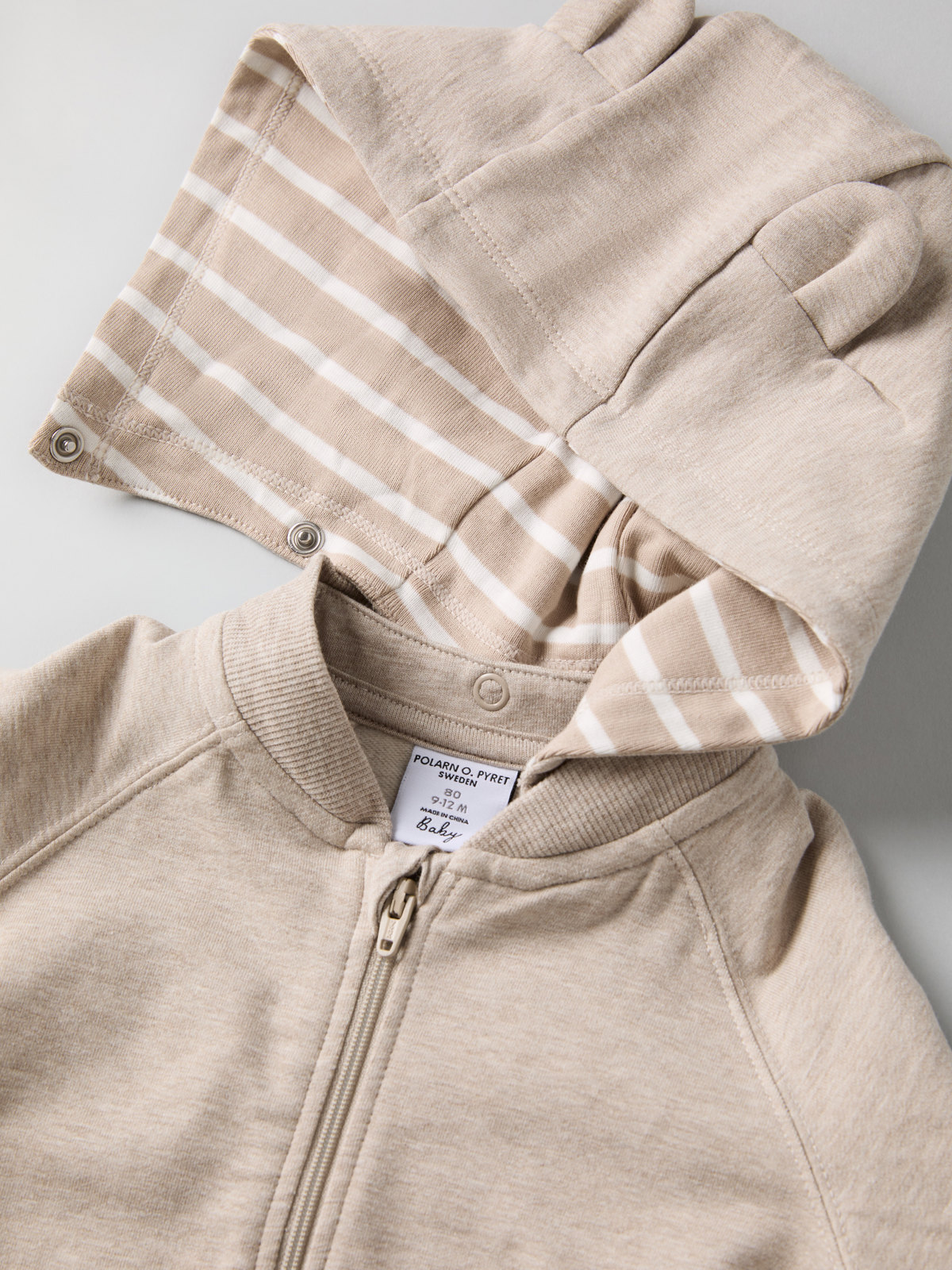 Vauvan meleerattu huppari collegemateriaalia. 100 % luomupuuvillaa. Hupparin sisäpuoli on harjattu pehmeäksi. Kiinteässä hupussa on trikoovuori, jossa on klassinen raitakuosimme. Koristeena korvat. Vetoketjussa on suoja, jotta se ei hankaa leukaa ja poskia. Koossa 80 on irrotettava huppu.