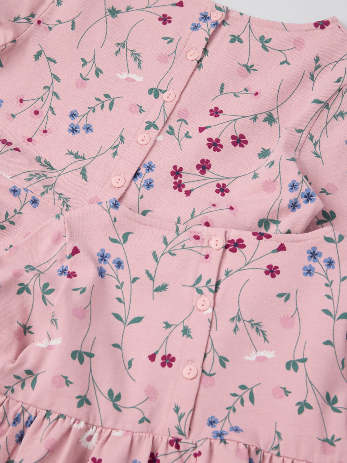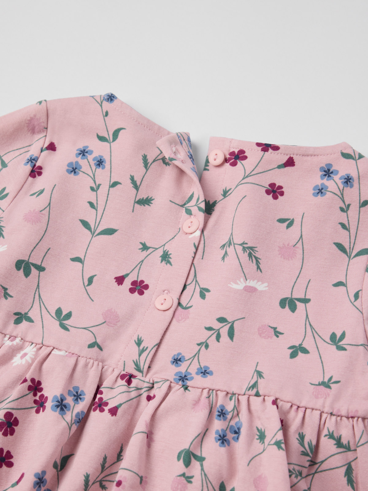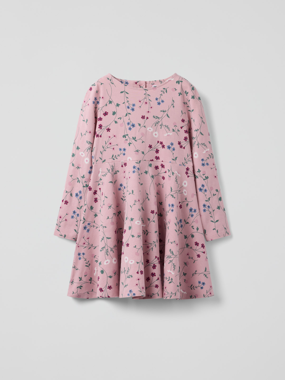 Tämä mekko on lapsen vaatekaapin suosikki! Valmistettu pehmeästä luomupuuvillatrikoosta. Erityisen leveä hameosa, joka näyttää hienolta pyöriessä. Nappilista takana.