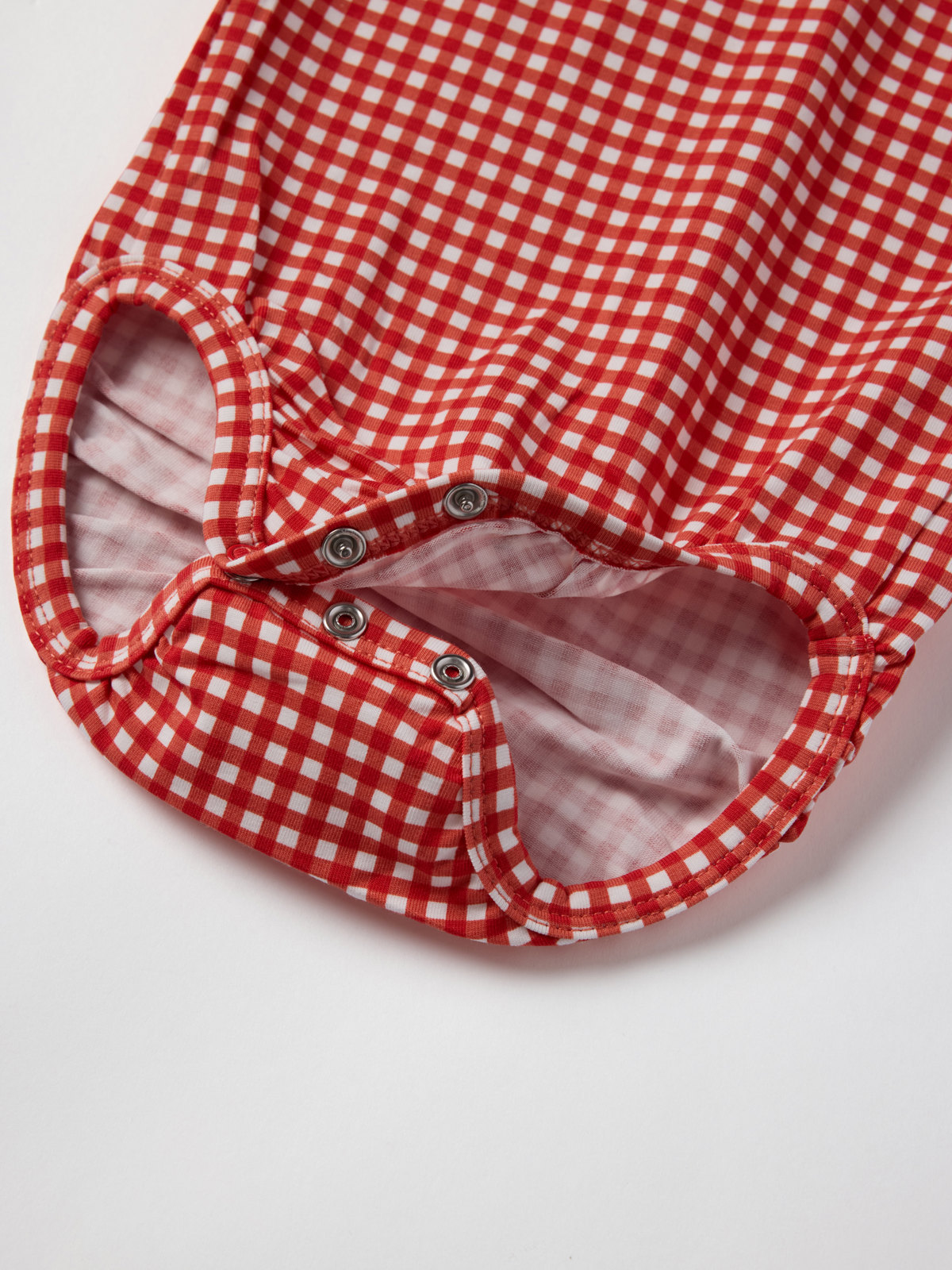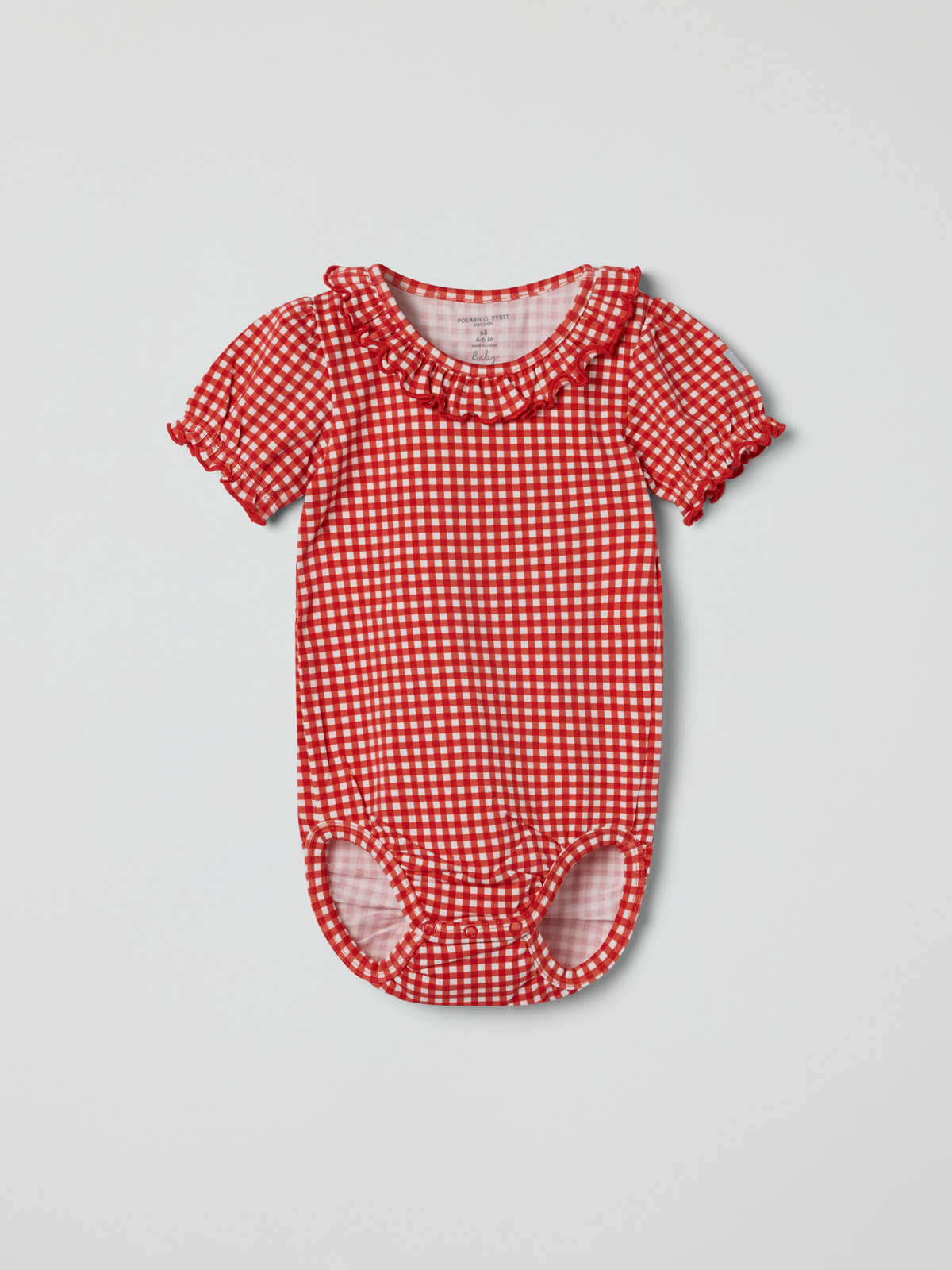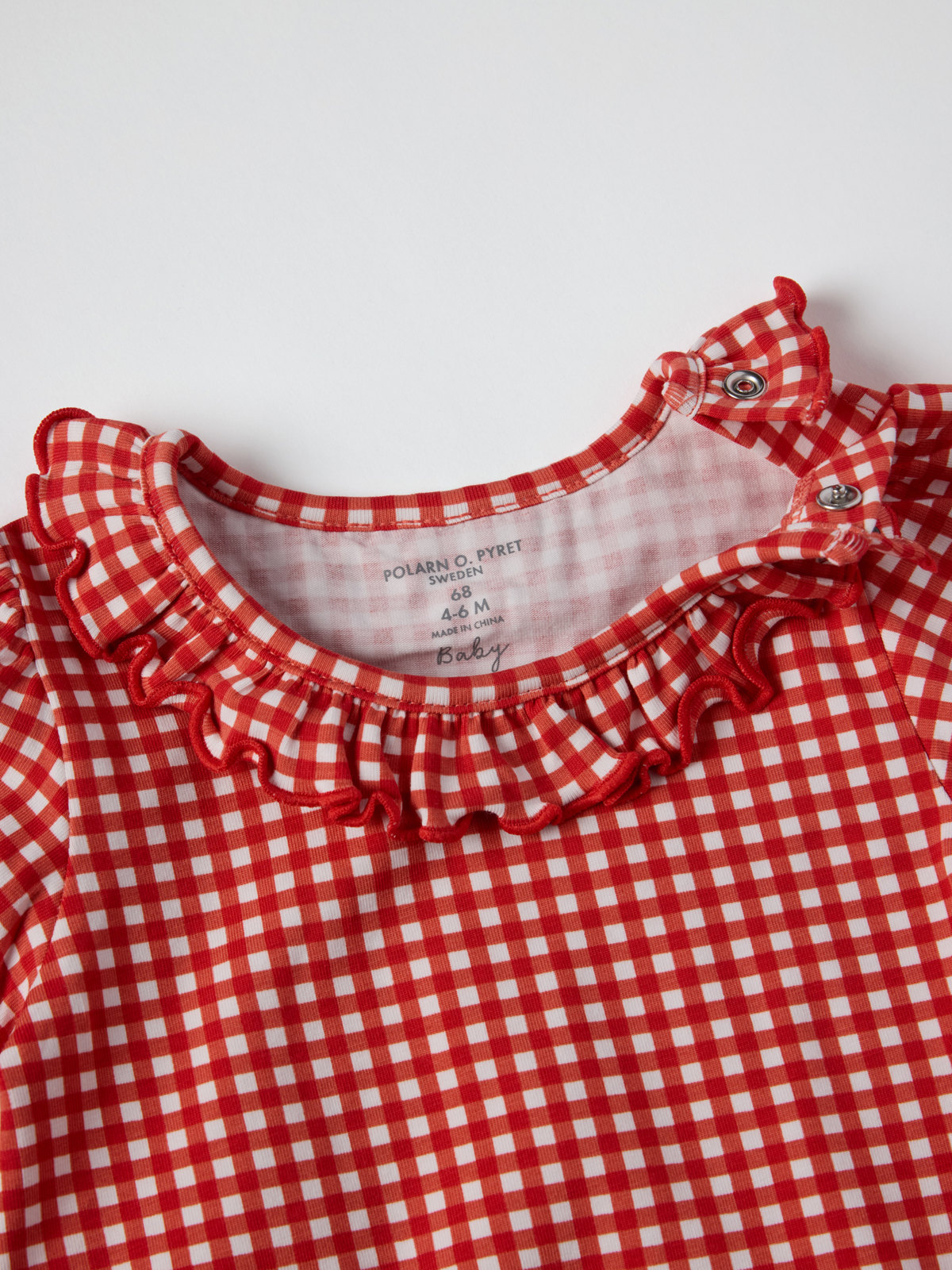 Ruudullinen lyhythihainen body pehmeää luomupuuvillatrikoota. Kauniita yksityiskohtia – ihana ja pehmeä kesäsuosikki! Röyhelöt bodyn pääntiessä sekä joustavissa hihansuissa. Nepparit haarassa helpottavat pukemista.