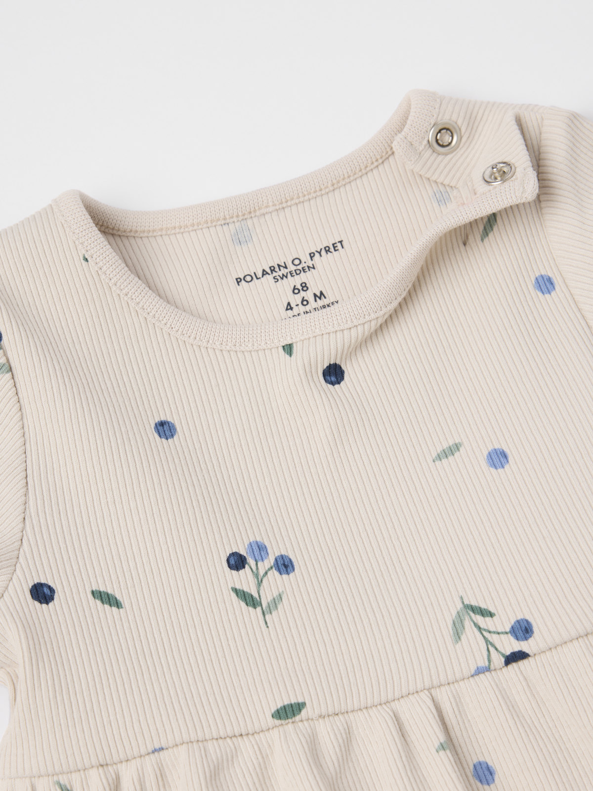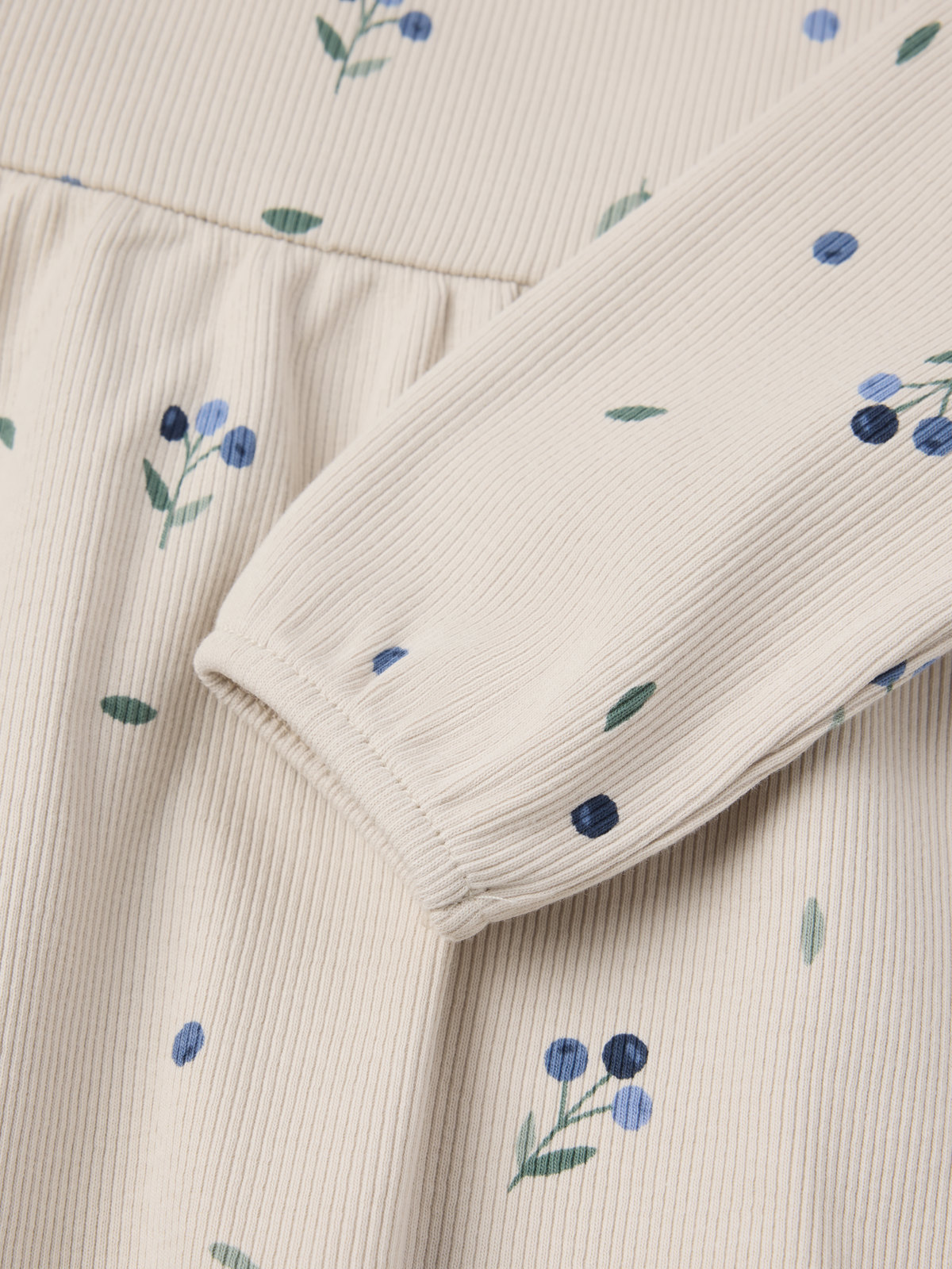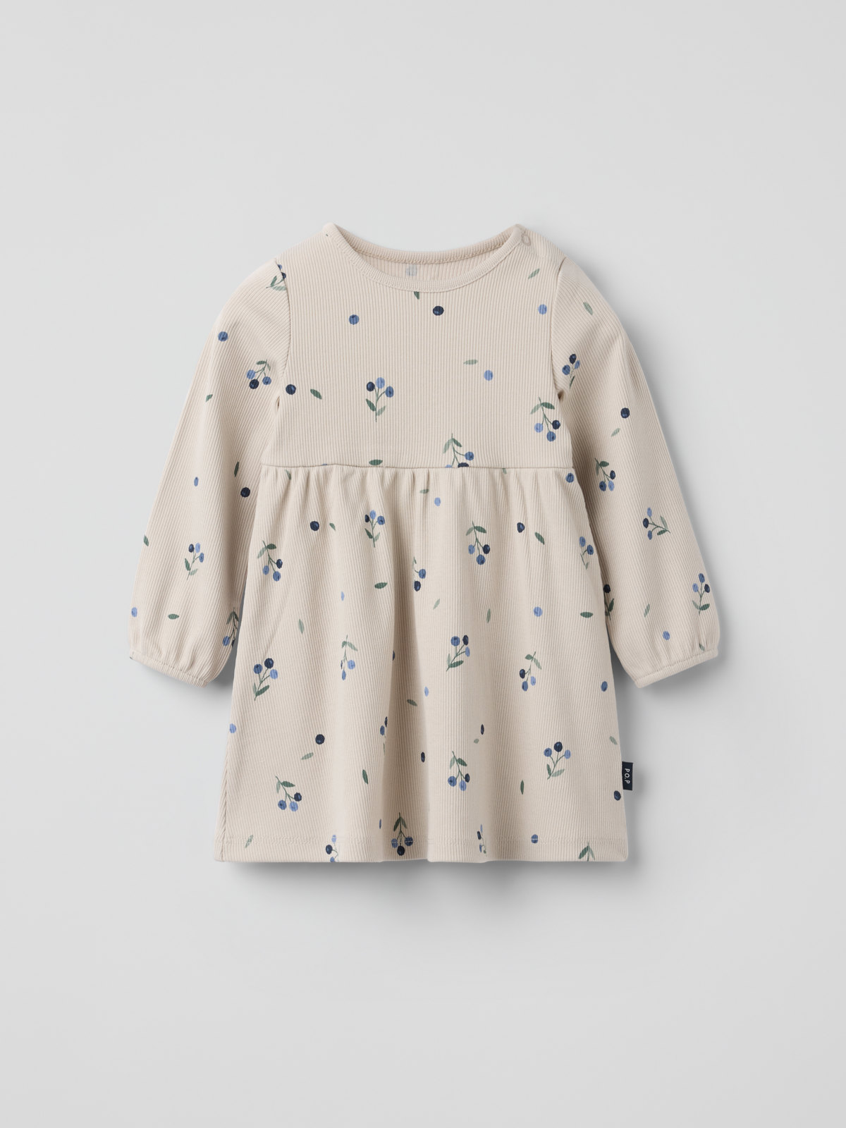 Suloinen mekko pehmeästä ribatusta luomupuuvillatrikoosta – mukava joka tilanteeseen! Olkapäillä röyhelöt.