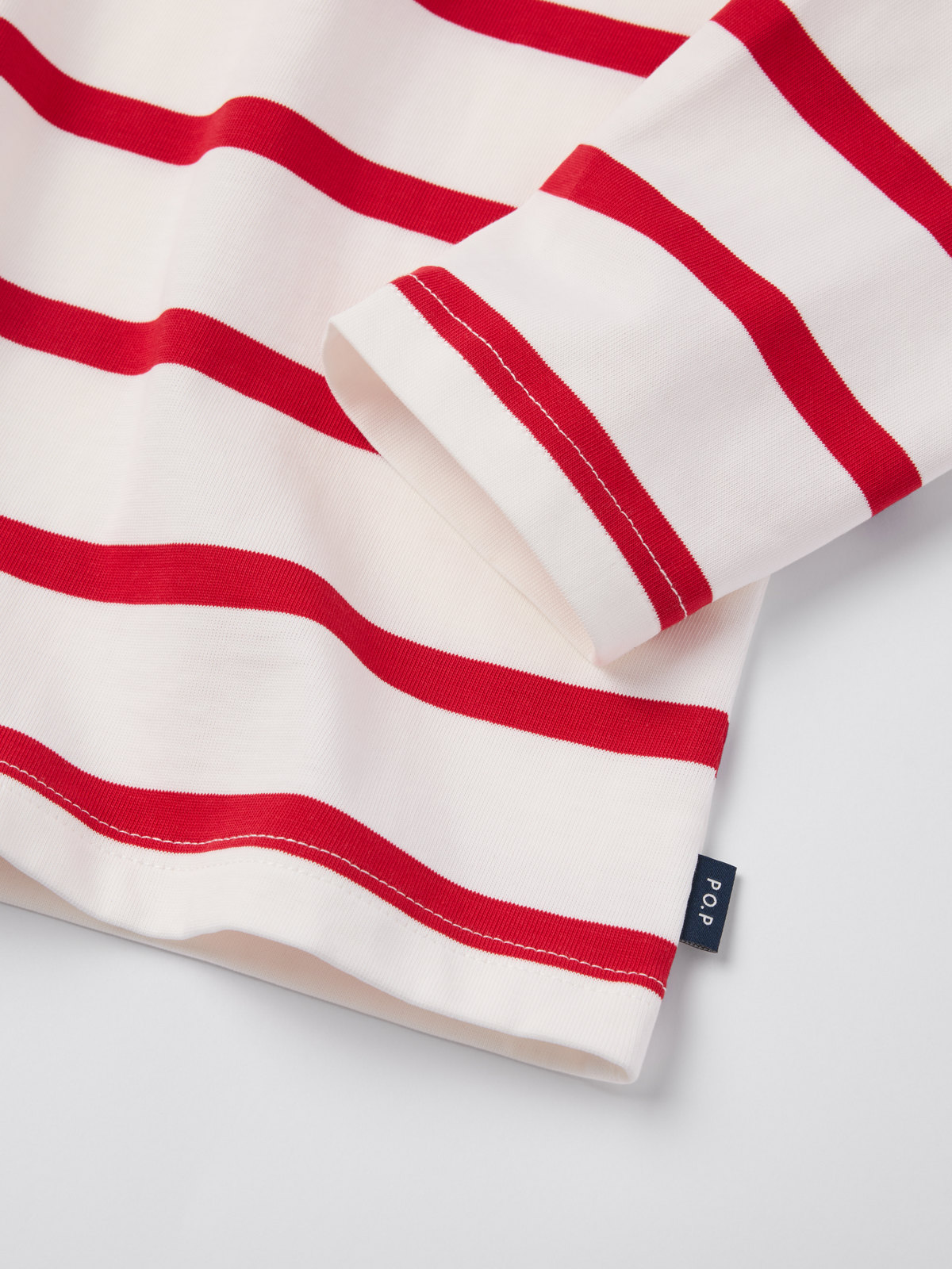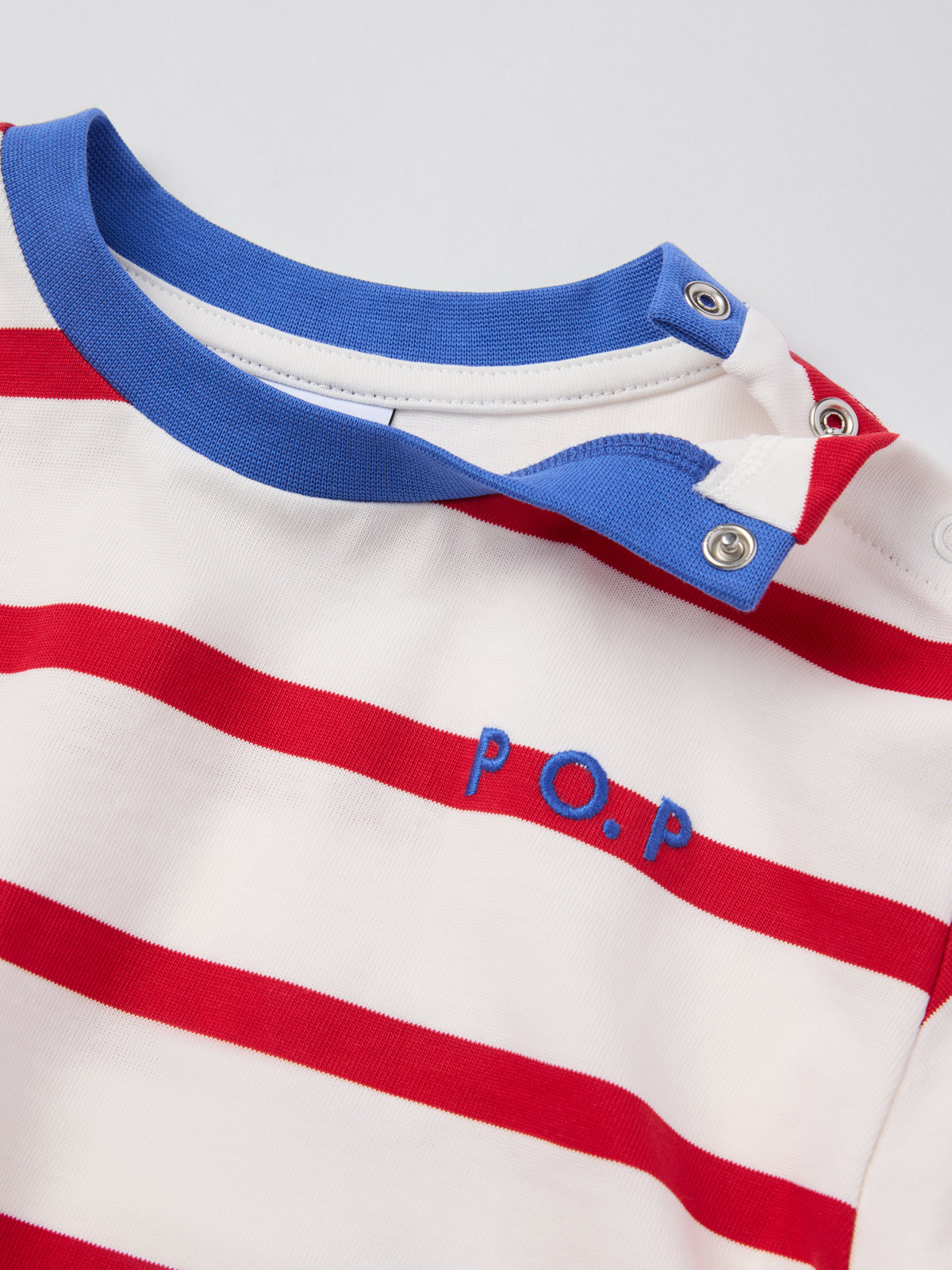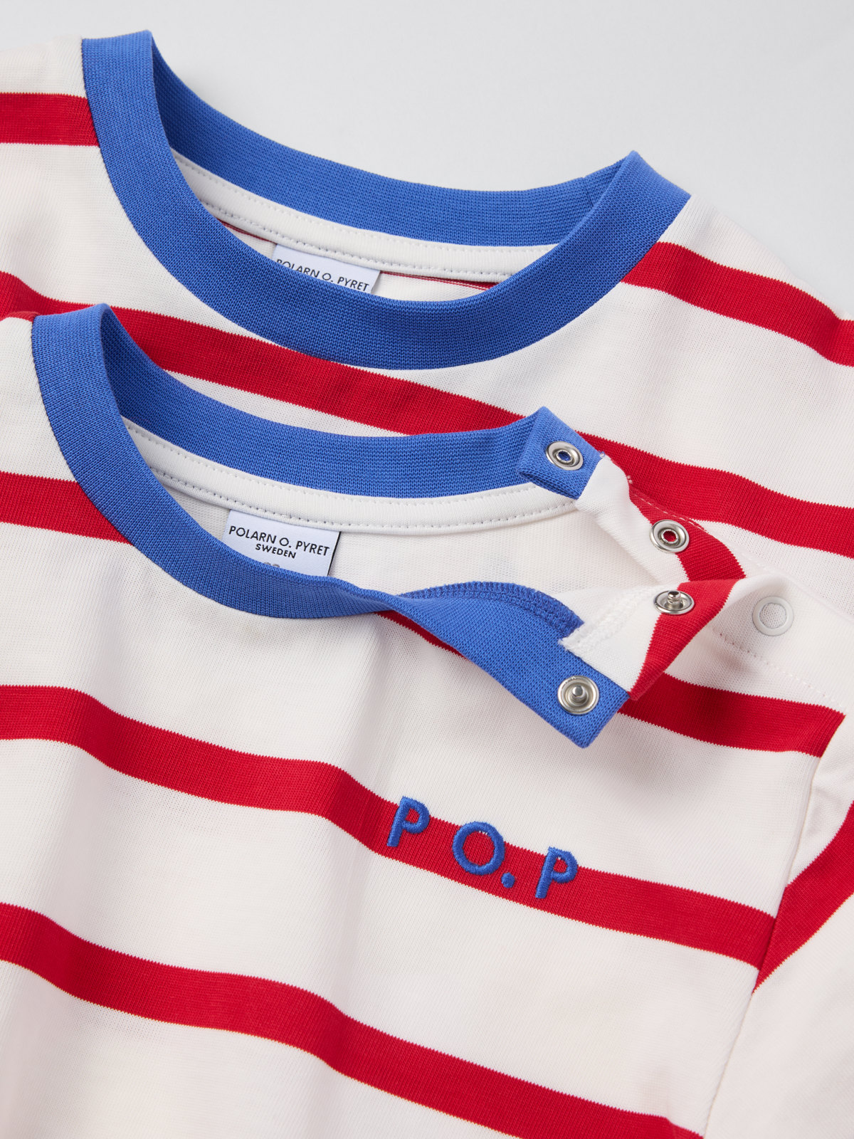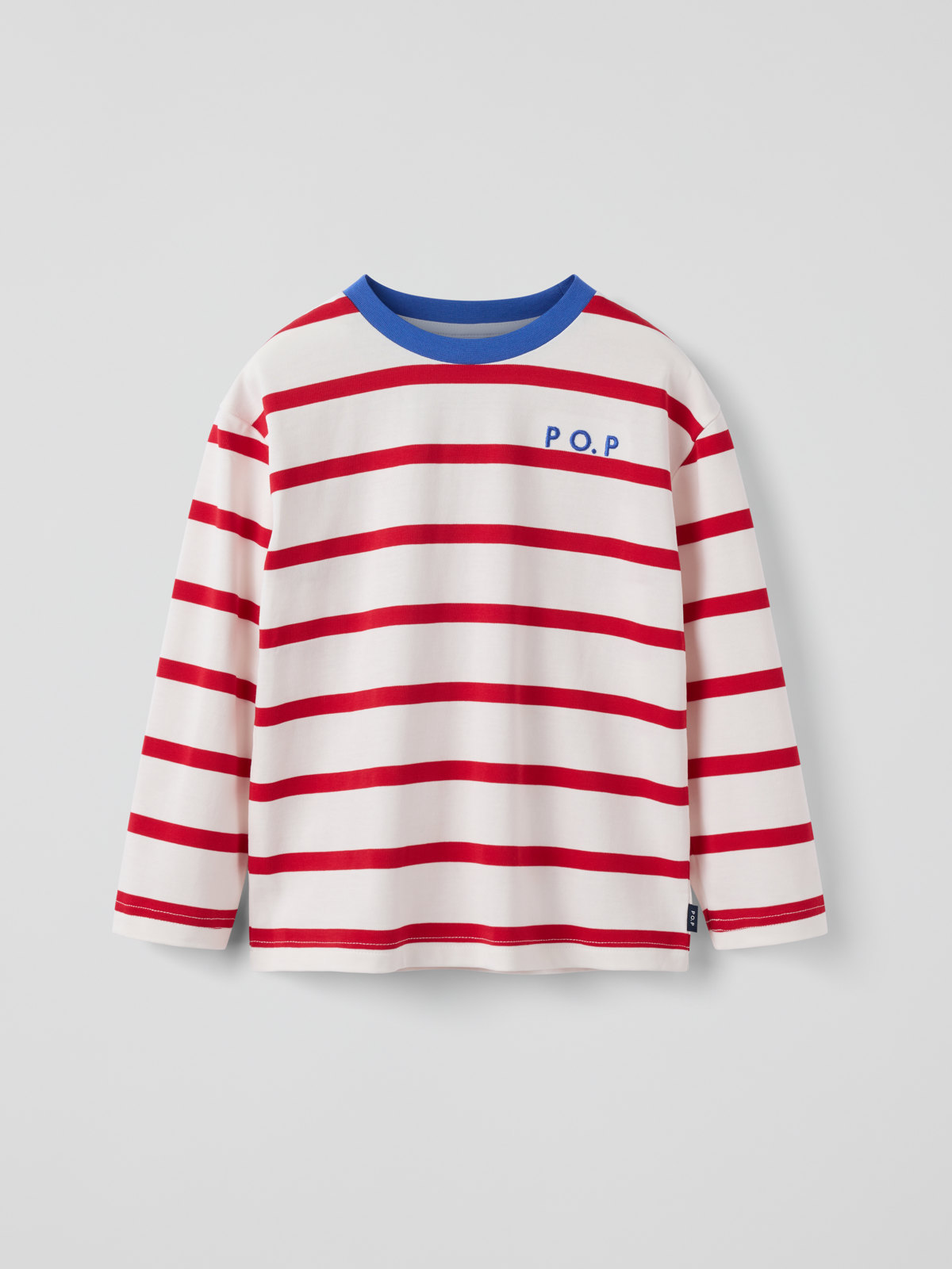 Pitkähihainen t-paita pehmeästä trikoosta, joka on valmistettu 100 % luomupuuvillasta. Paita on raidallinen ja siinä on kontrastivärinen ribbiresori pääntiellä sekä pieni PO.P-brodeeraus rinnassa.
