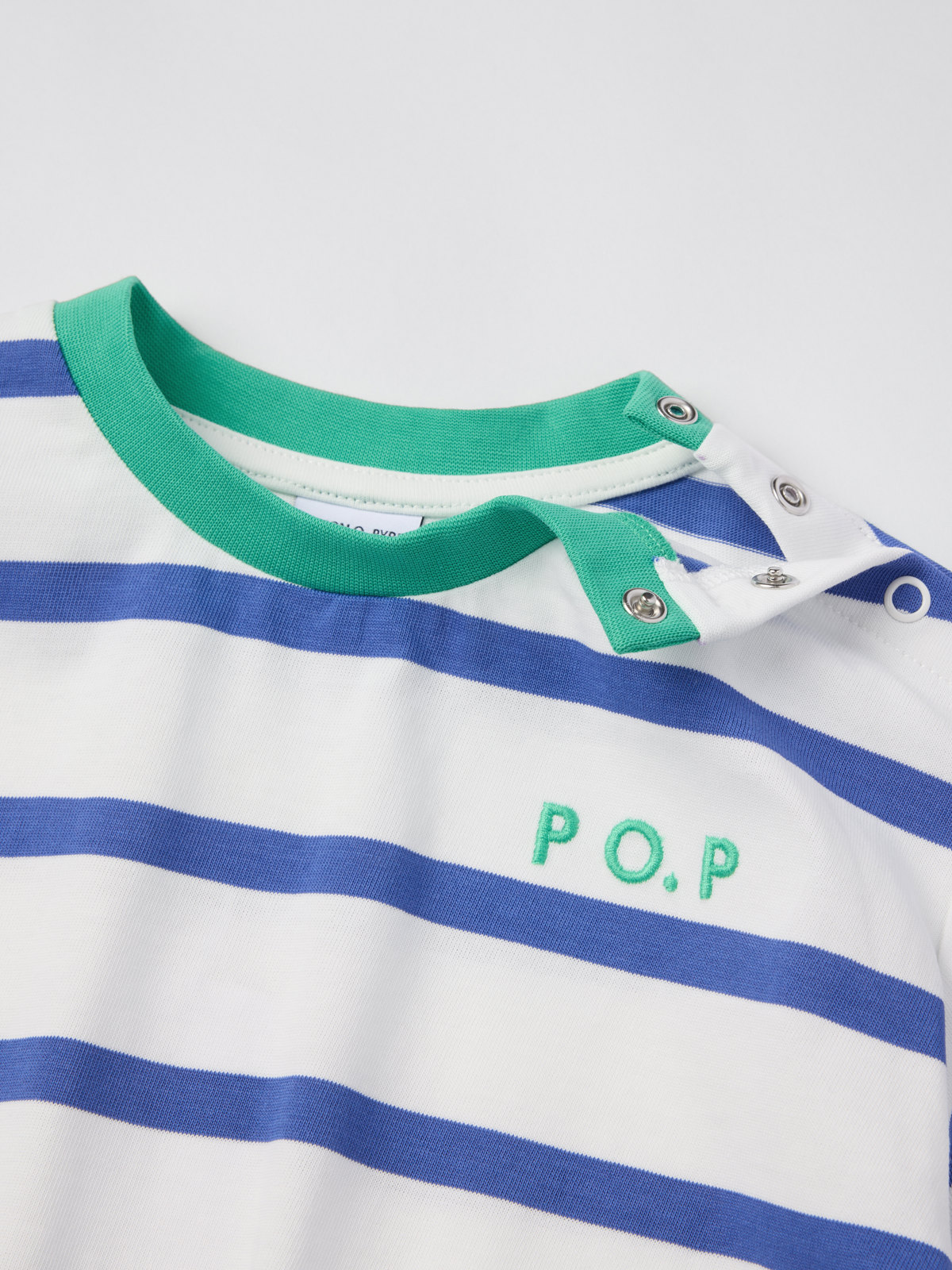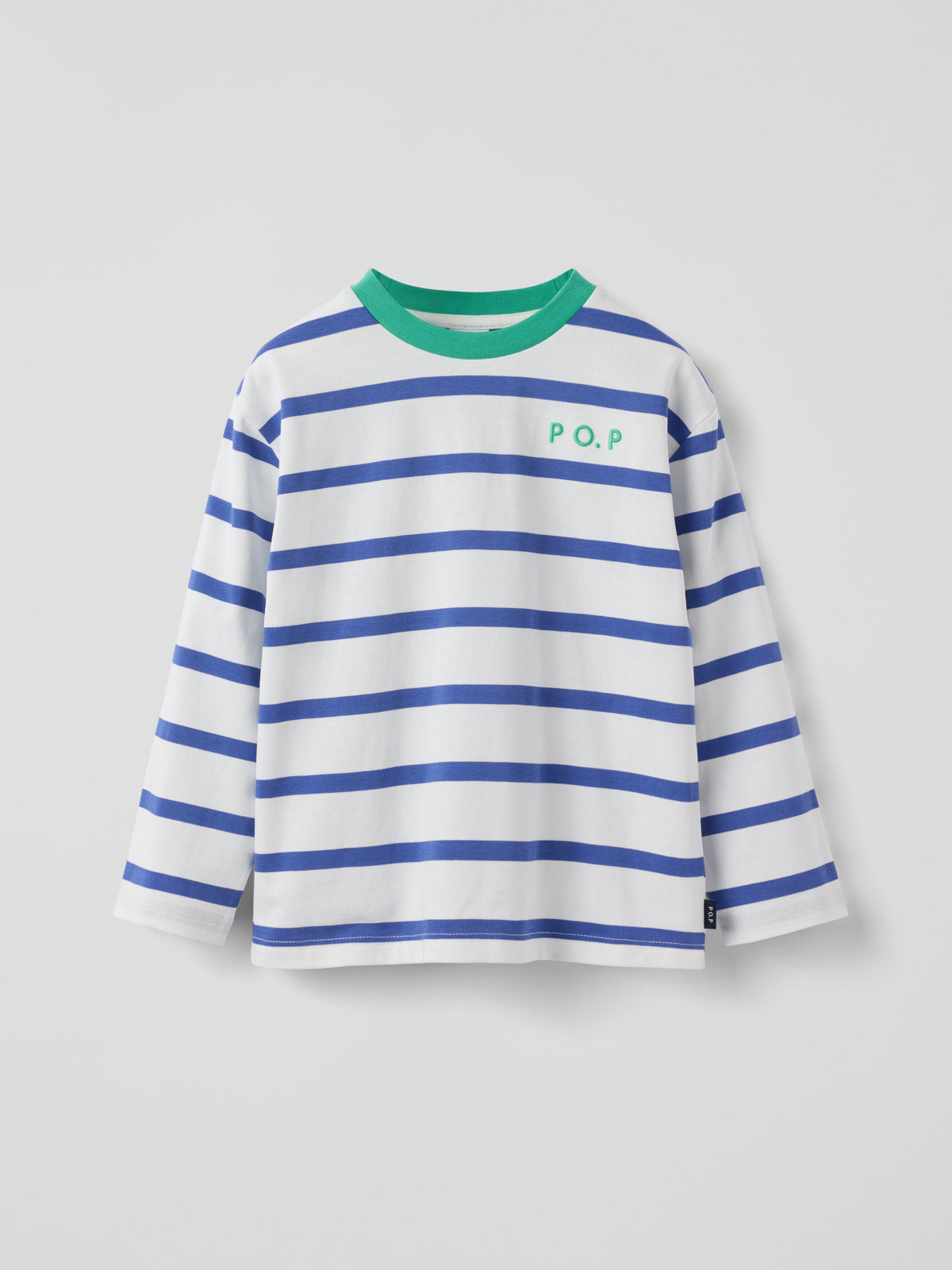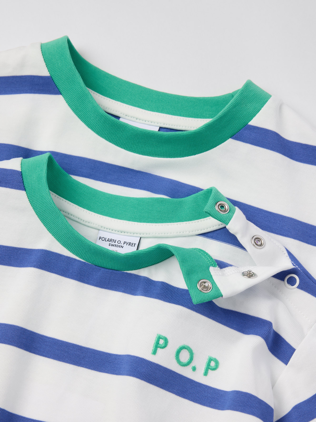 Pitkähihainen t-paita pehmeästä trikoosta, joka on valmistettu 100 % luomupuuvillasta. Paita on raidallinen ja siinä on kontrastivärinen ribbiresori pääntiellä sekä pieni PO.P-brodeeraus rinnassa.
