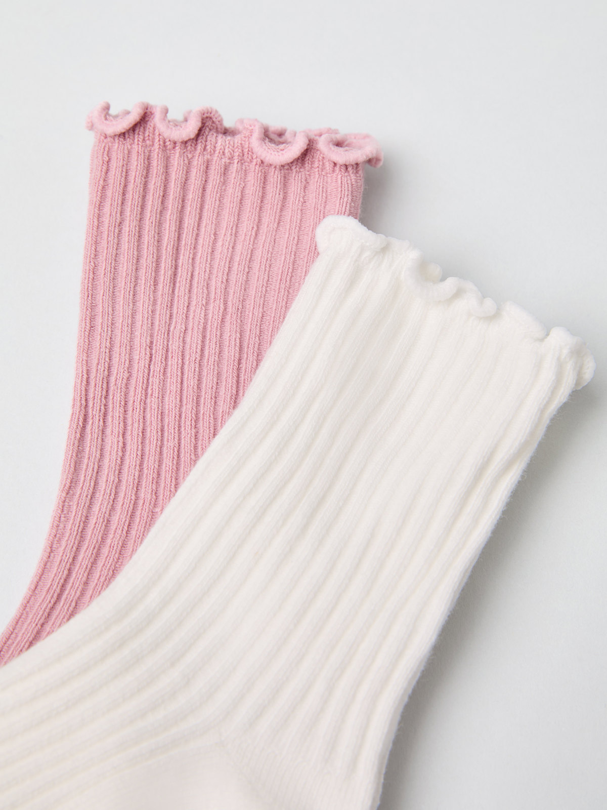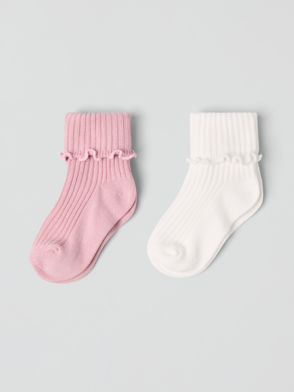 Kahden parin pakkaus vauvan sukkia. Pehmeää luomupuuvillaa. Kaunis pykäreuna. Sukissa on pitkä taitettava resori hyvän istuvuuden takaamiseksi. Ne sopivat hyvin yhteen koko vauvojen malliston kanssa.