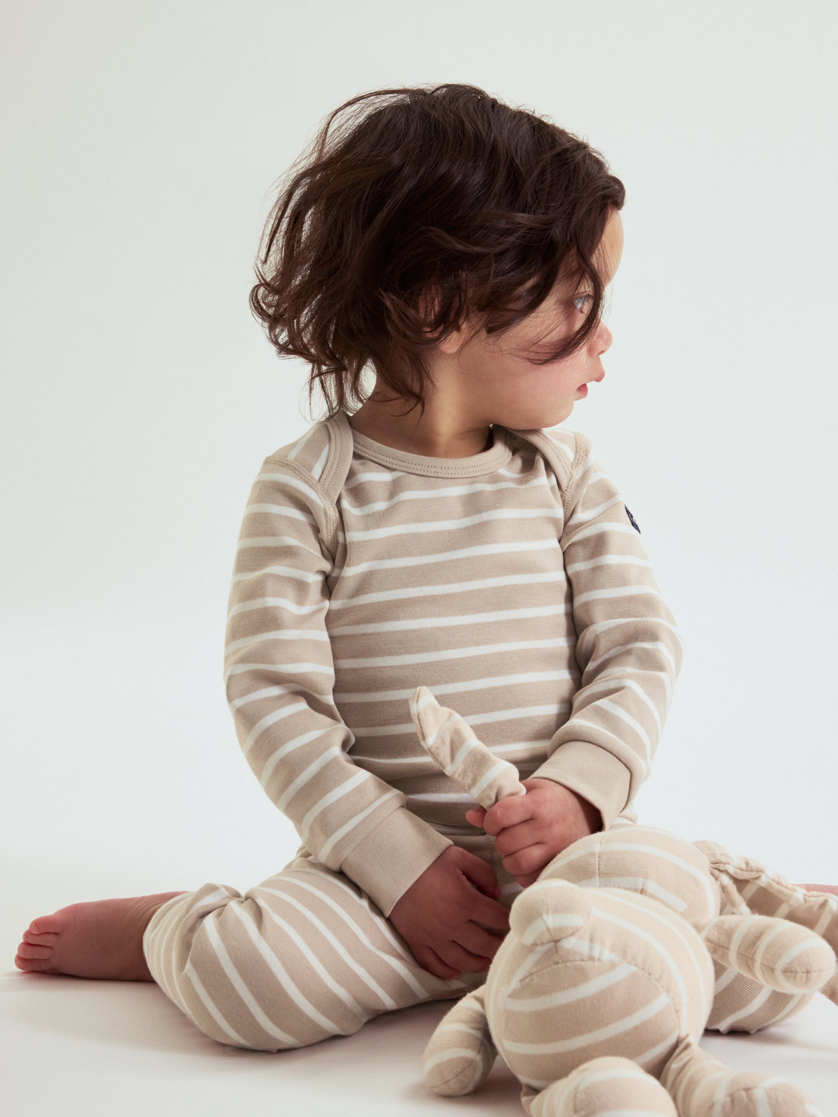 Ribbihousut pehmeää luomupuuvillaa. Täydellinen perusvaate, joka sopii sekä kotiin että päiväkotiin! Housuissa on klassinen raitakuosimme. Joustava vyötärö, jota voi säätää sisäpuolelta reikäkuminauhalla. Pehmeä ribbiresori lahkeensuissa.