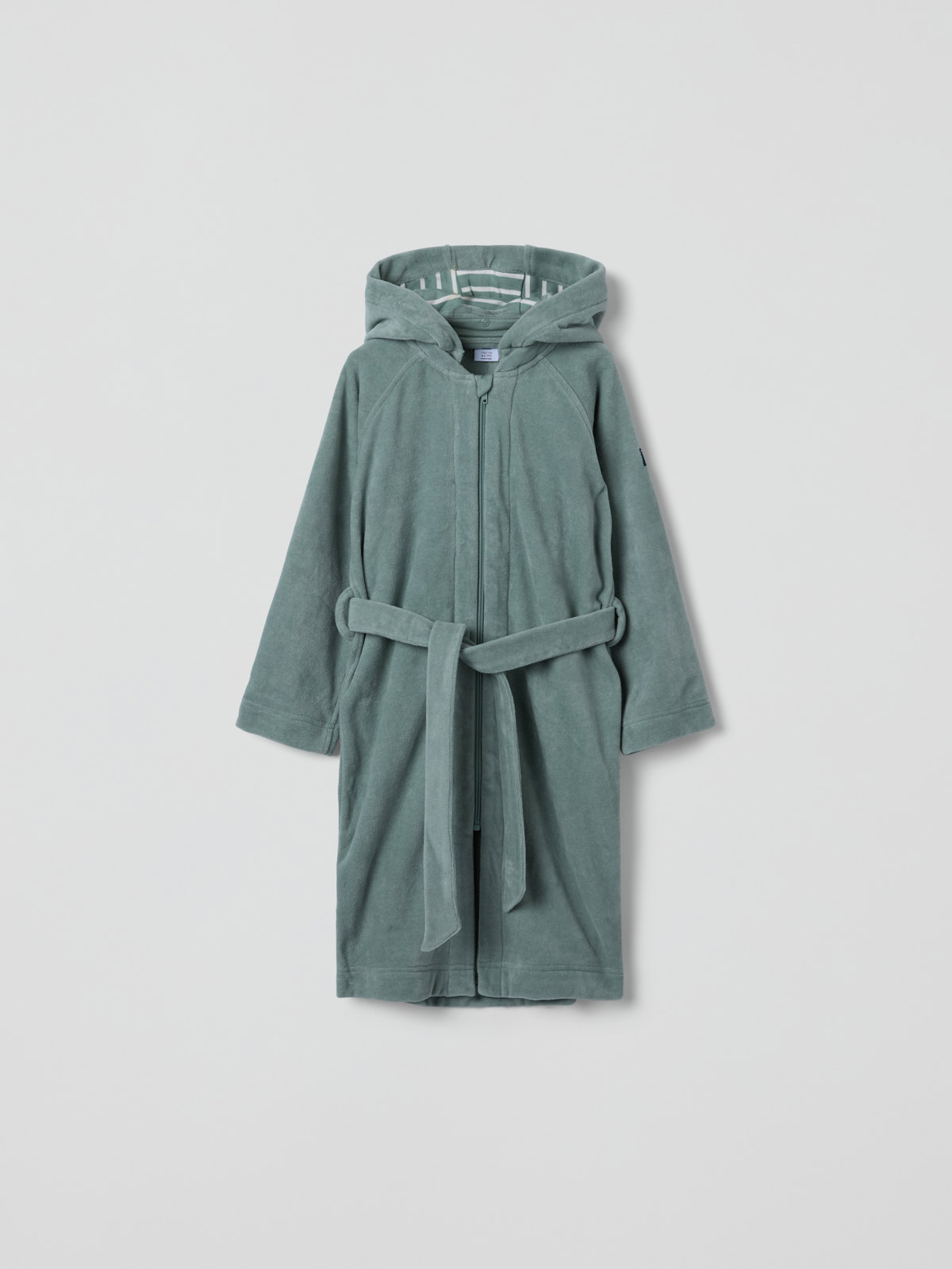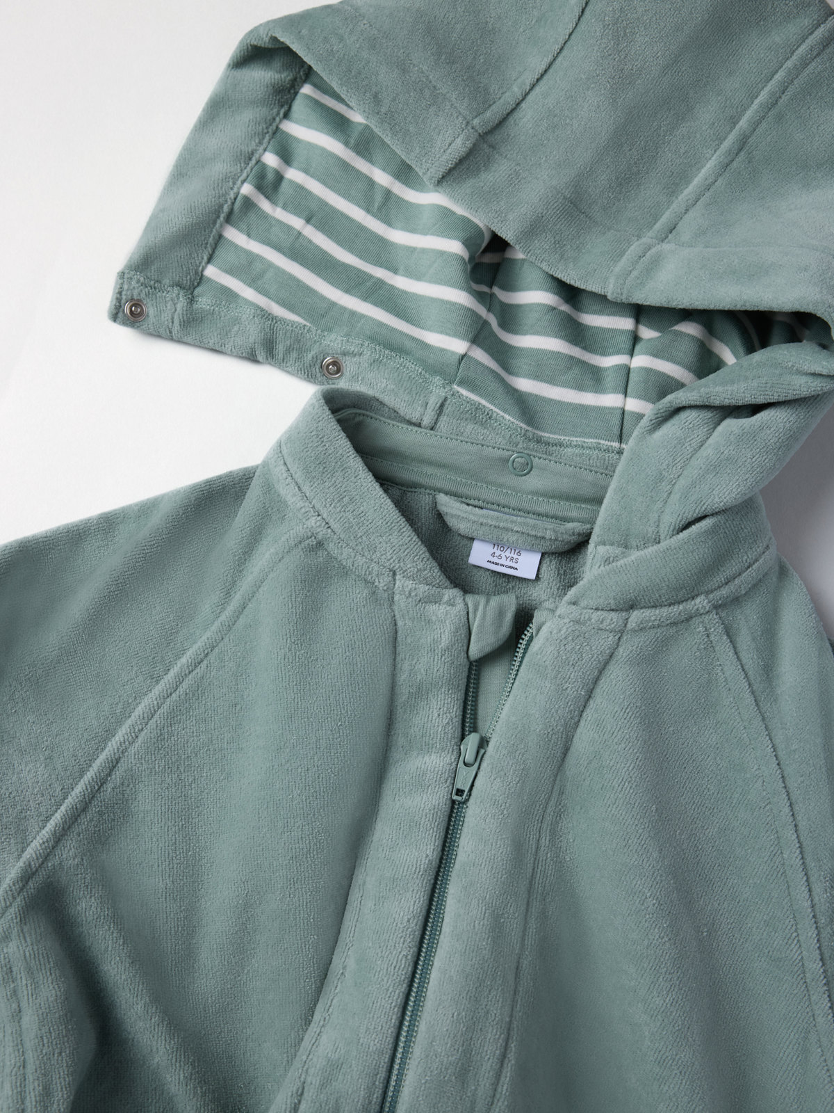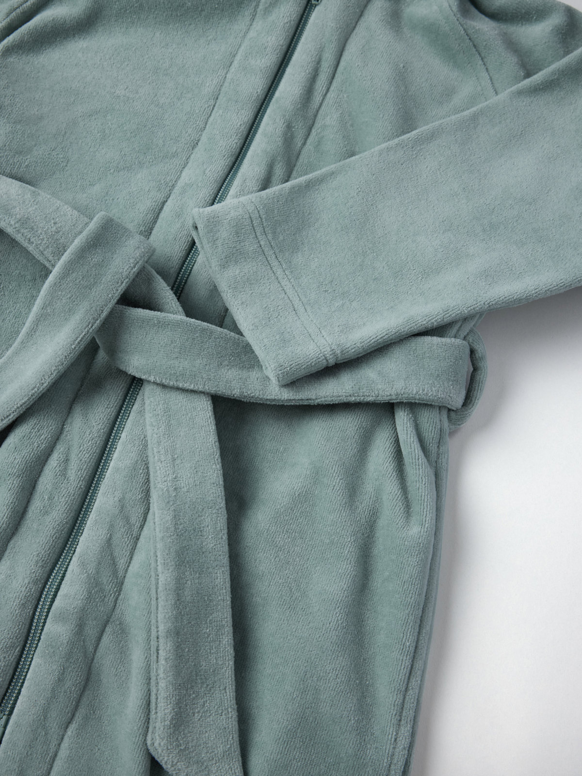 Yksivärinen kylpytakki pehmeää ja mukavaa luomupuuvillaa ja kierrätettyä polyesteriä. Irrotettavassa hupussa on puuvillatrikoovuori, jossa on klassinen raitakuosimme. Aamutakki ulottuu pohkeeseen asti. Kiinnitetään vetoketjulla ja solmimisnauhalla.