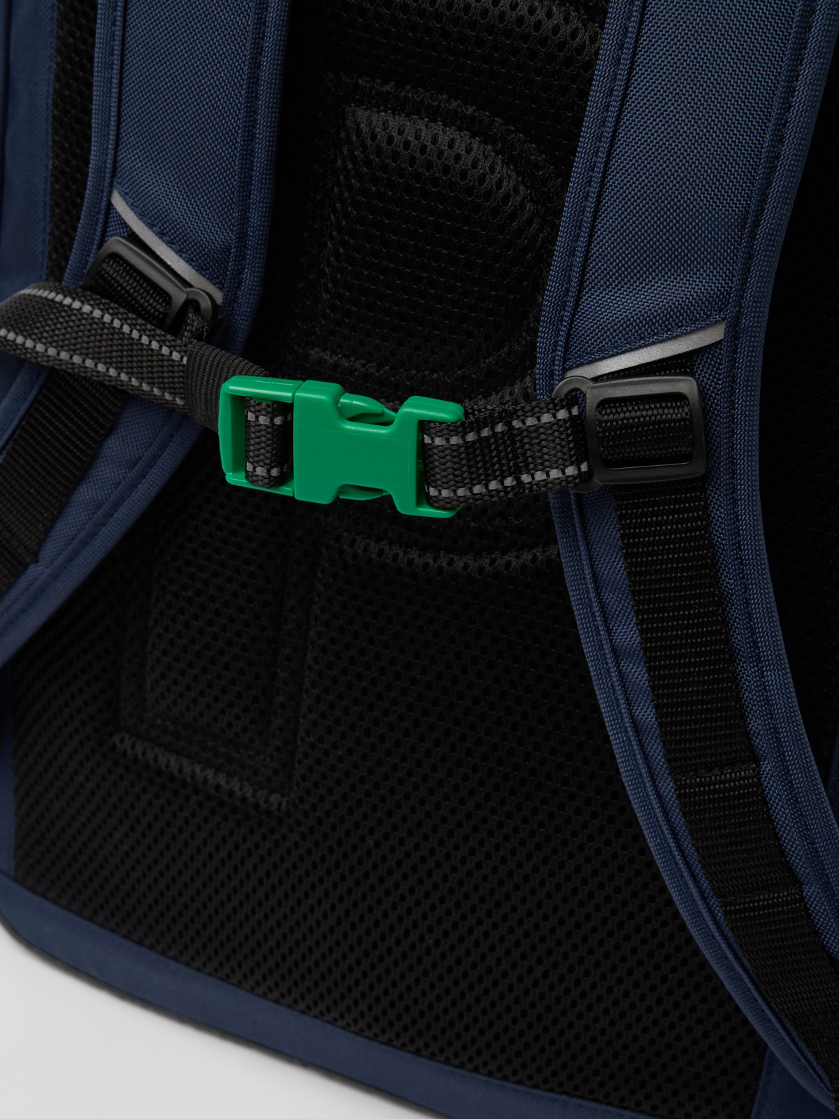 Repussa on pehmeä verkkoselkäpaneeli ja säädettävä rintaremmi turvalukolla siltä varalta, että jää johonkin kiinni. Rintaremmi auttaa jakamaan painoa tasaisesti. Reppu sopii täydellisesti A4-kokoisille papereille ja sisältää useita käteviä ulko- ja sisätaskuja tärkeille tavaroille sekä heijastimia näkyvyyden takaamiseksi. Tilavuus on 18 litraa, ja se sopii erinomaisesti lapsille päiväkoti-iästä alkaen. Mukaan kuuluu repun kokoon sovitettu istuinalusta!