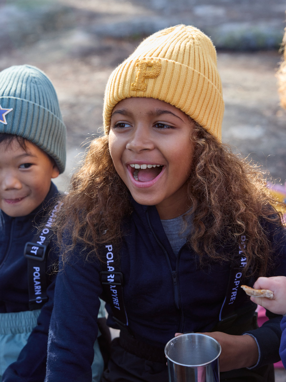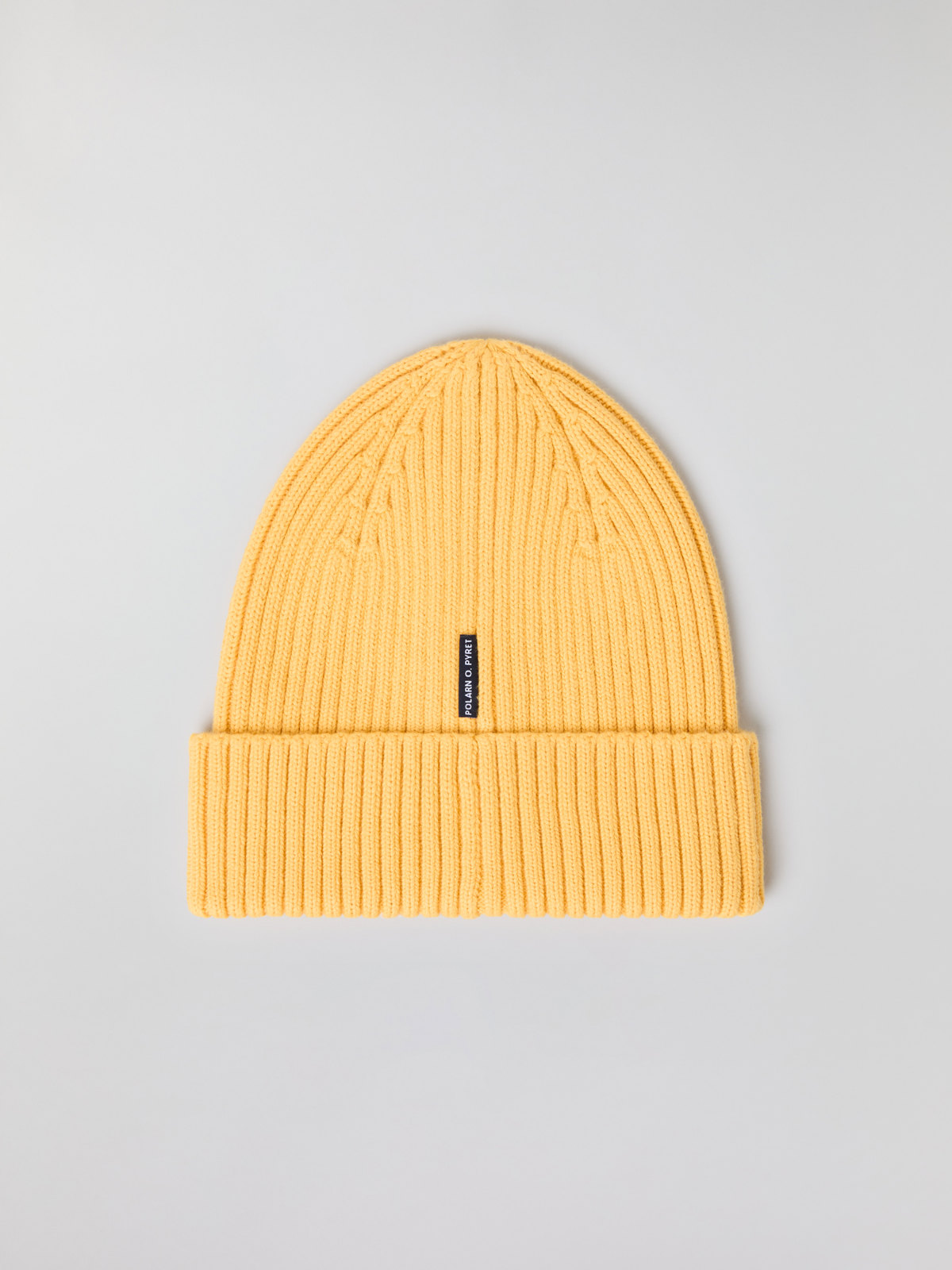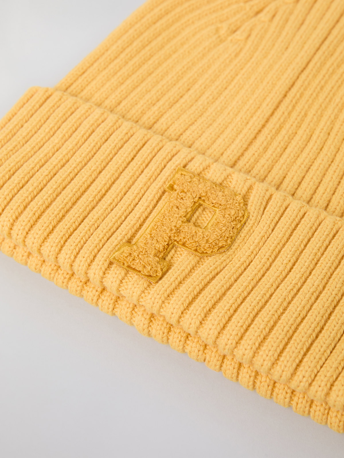 Ribbipipo luomupuuvillaa – täydellinen viileisiin syys- ja kevätpäiviin. Pipossa on taite ja edessä P-applikointi.