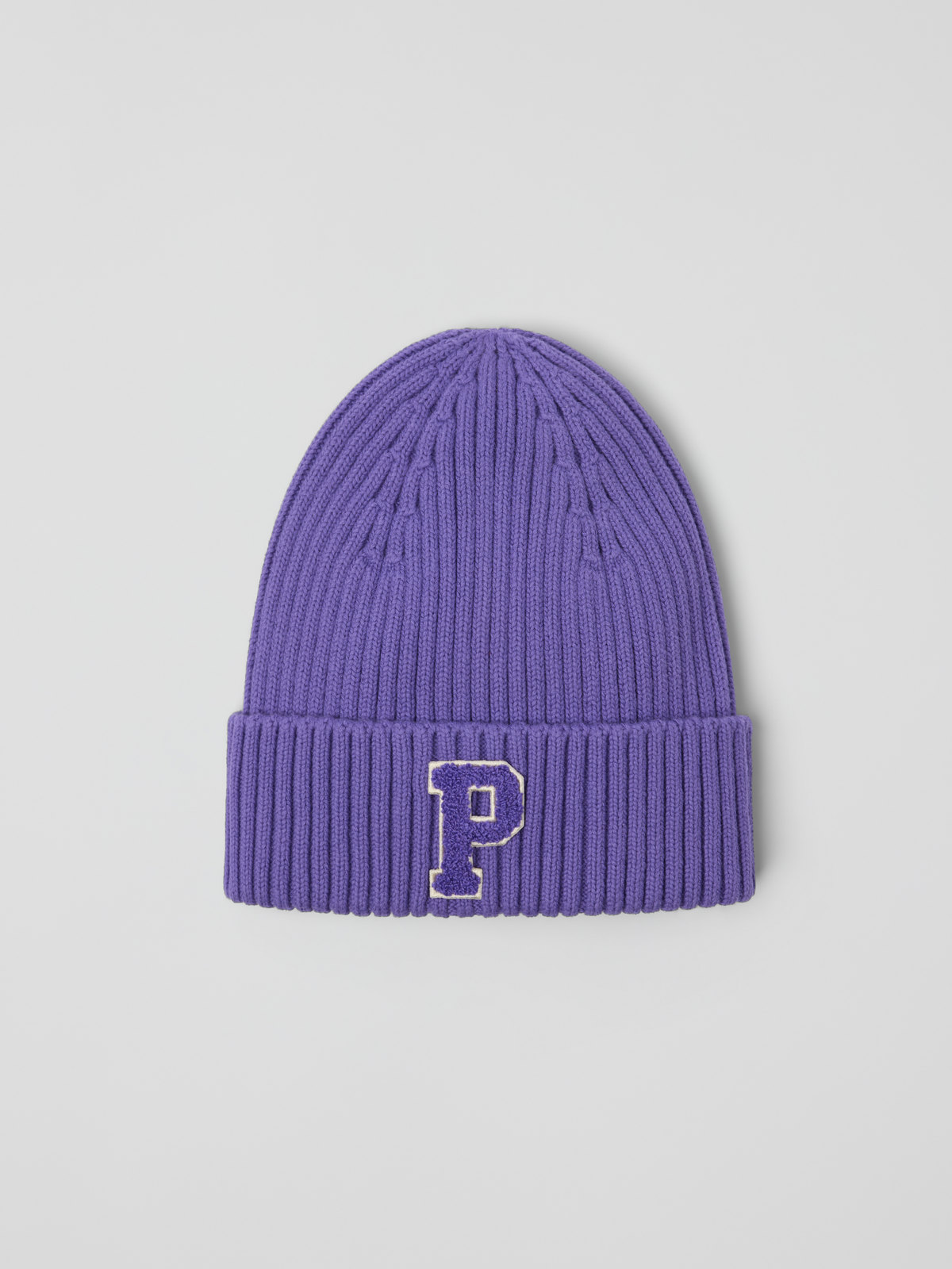 Ribbipipo luomupuuvillaa – täydellinen viileisiin syys- ja kevätpäiviin. Pipossa on taite ja edessä P-applikointi.