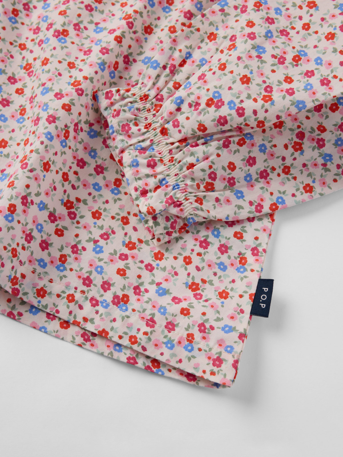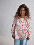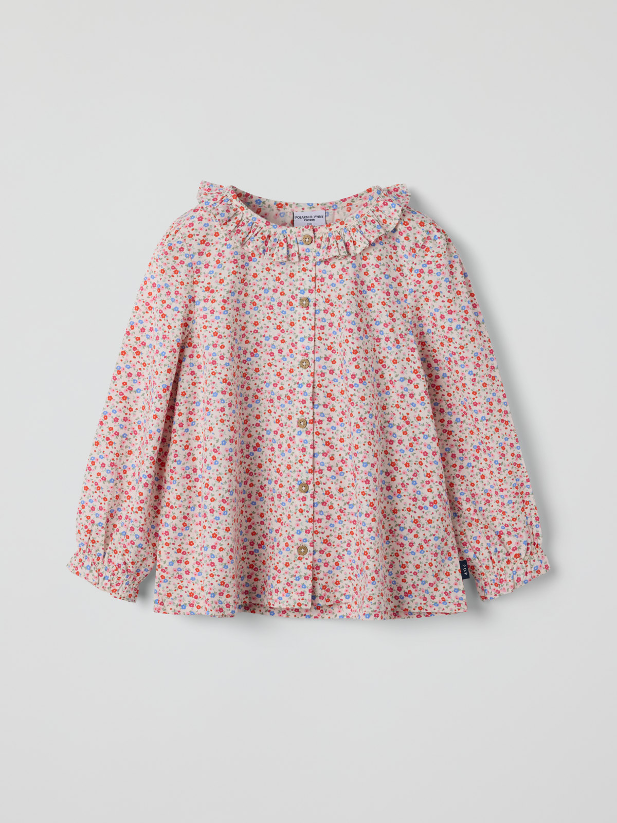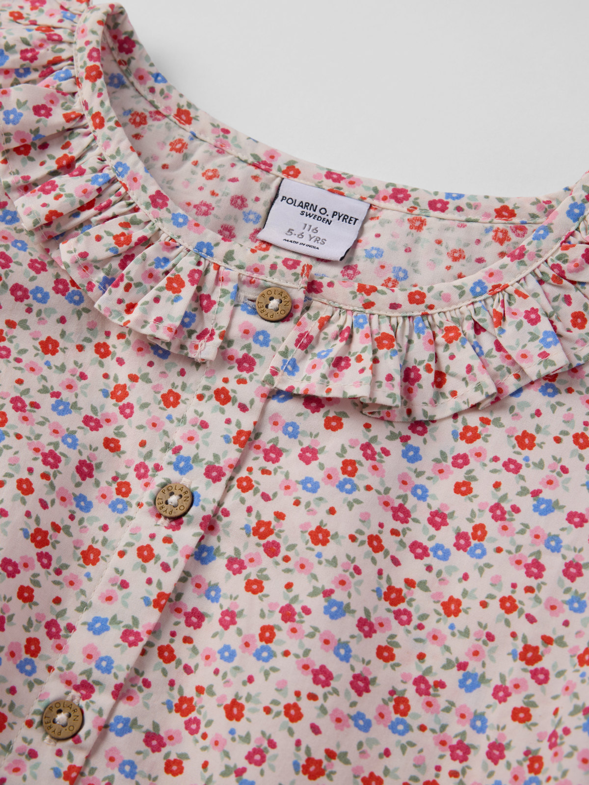 Pusero kevyestä musliinista, 100 % luomupuuvillaa. Puserossa on rypytetty helma ja suloiset röyhelöt pääntiessä ja hihansuissa. Suljetaan edestä napeilla.