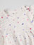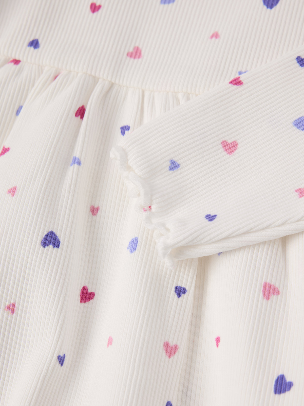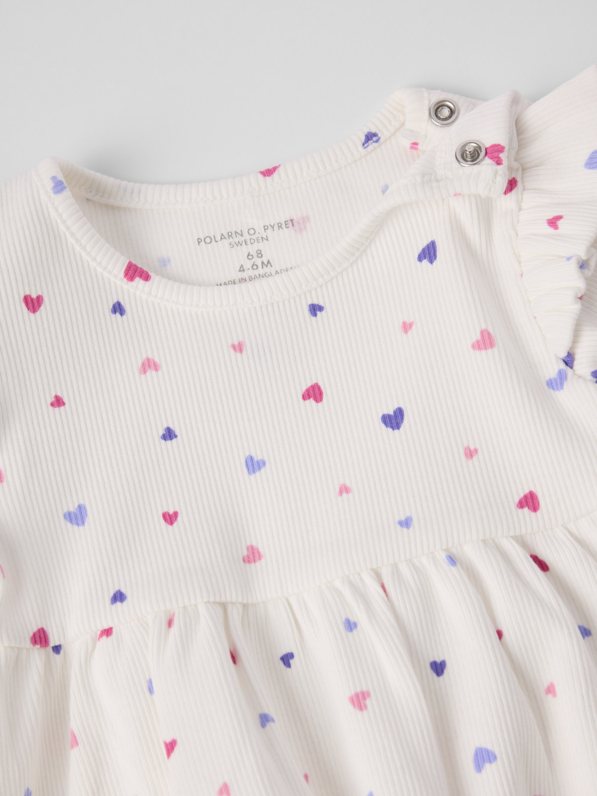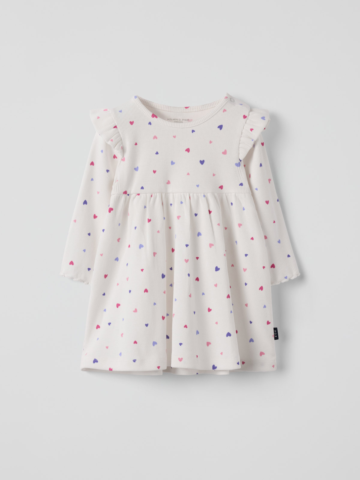 Pehmeä ribbimekko vauvalle, valmistettu luomupuuvillasta. Mekko on kuvioitu pienillä sydämillä ja olkapäillä on pienet röyhelöt.