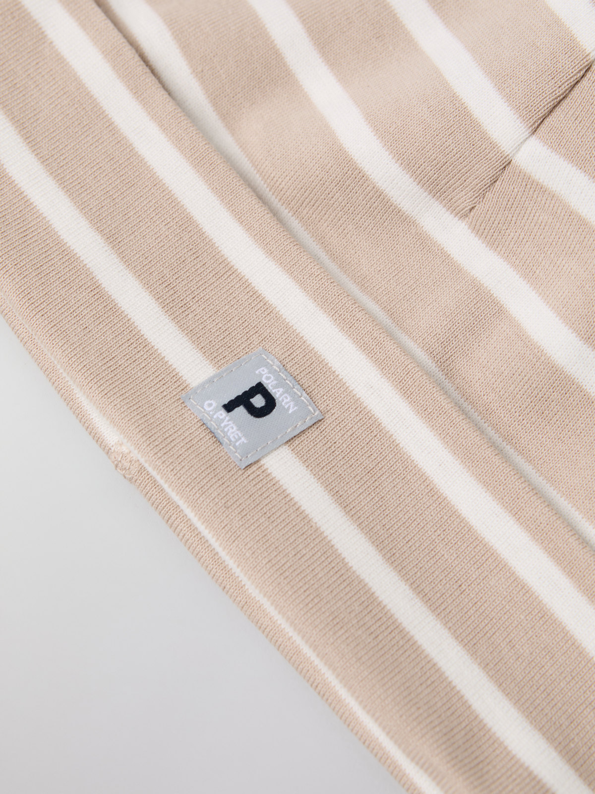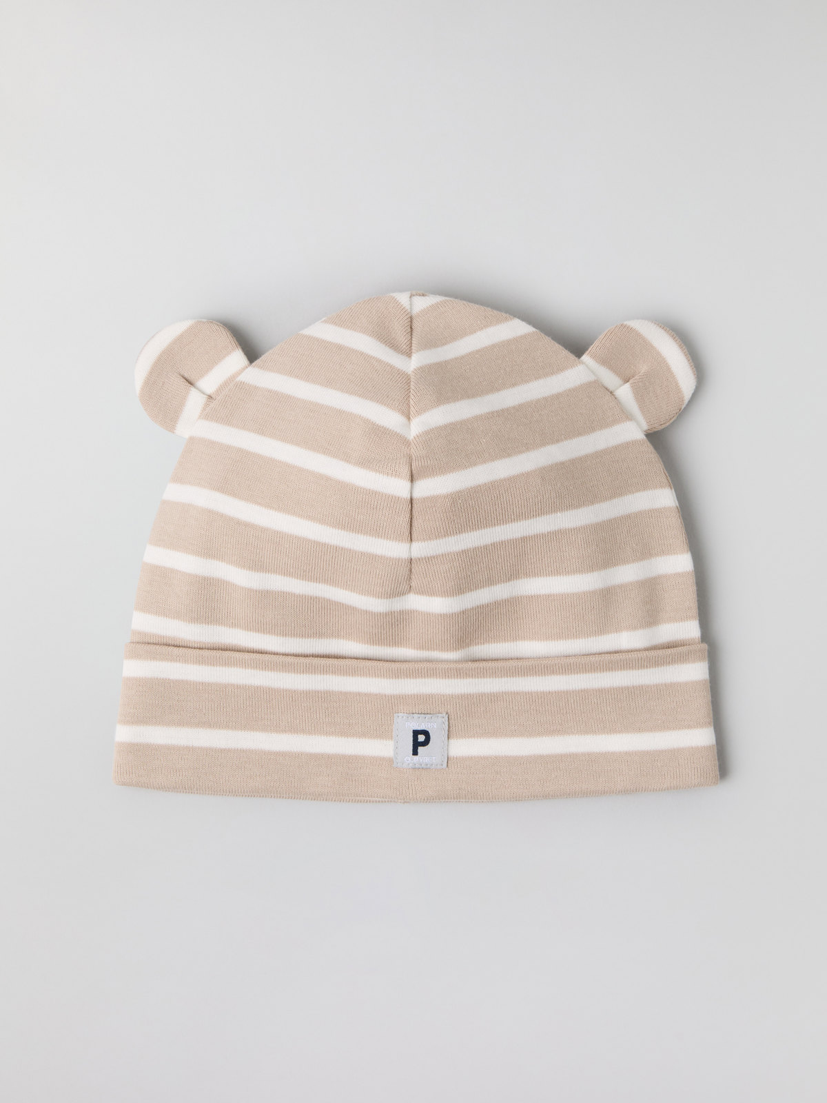 Vauvan raidallinen pipo 100 % luomupuuvillatrikoota. Pipossa on koristeena korvat. Taitoksen avulla pipon kokoa voi säätää vauvan pään koon mukaan.
