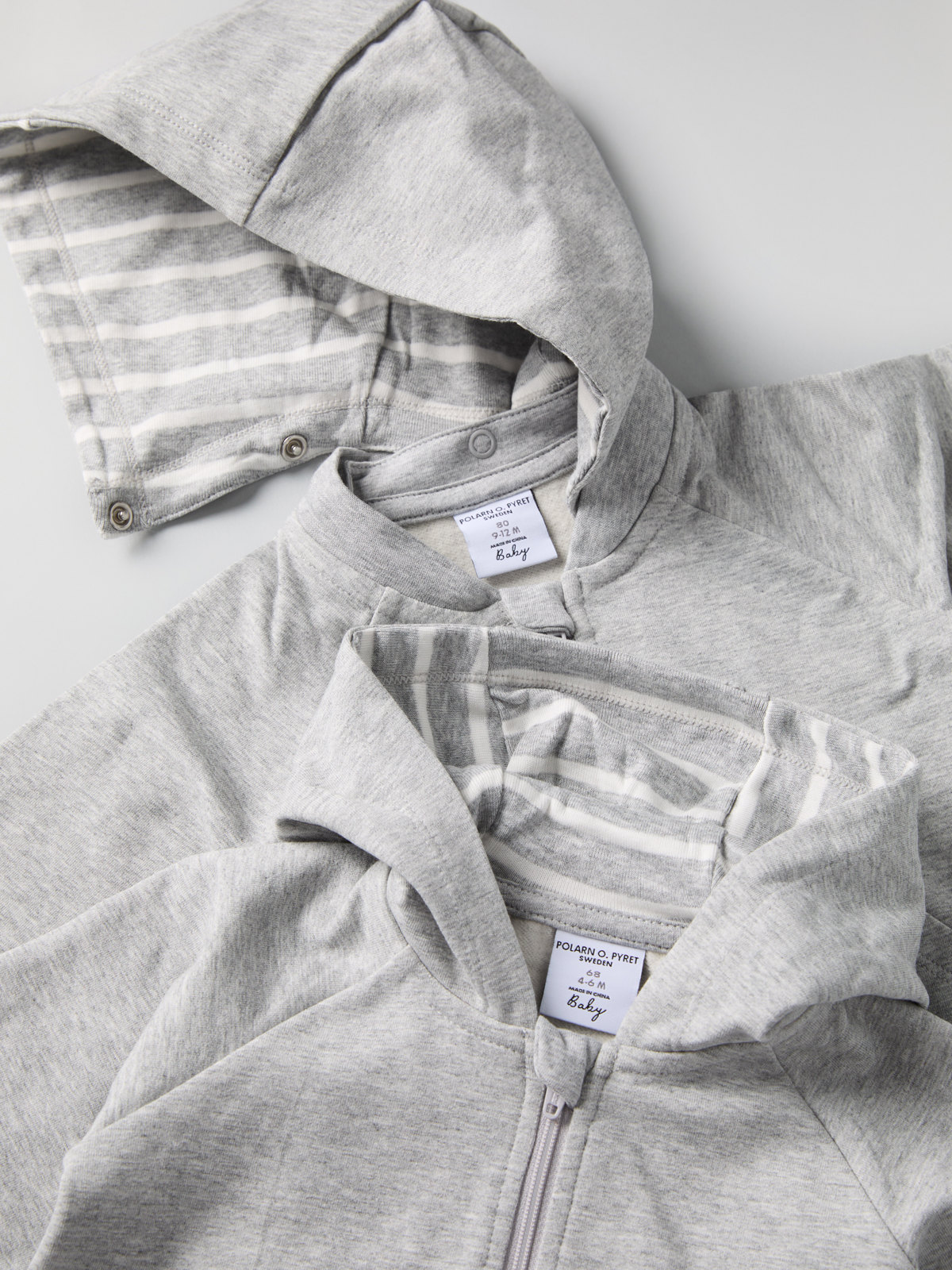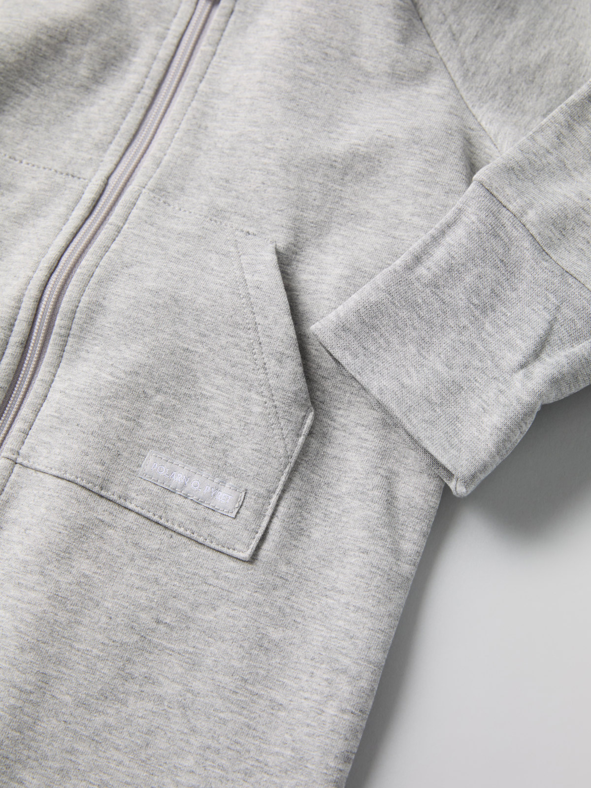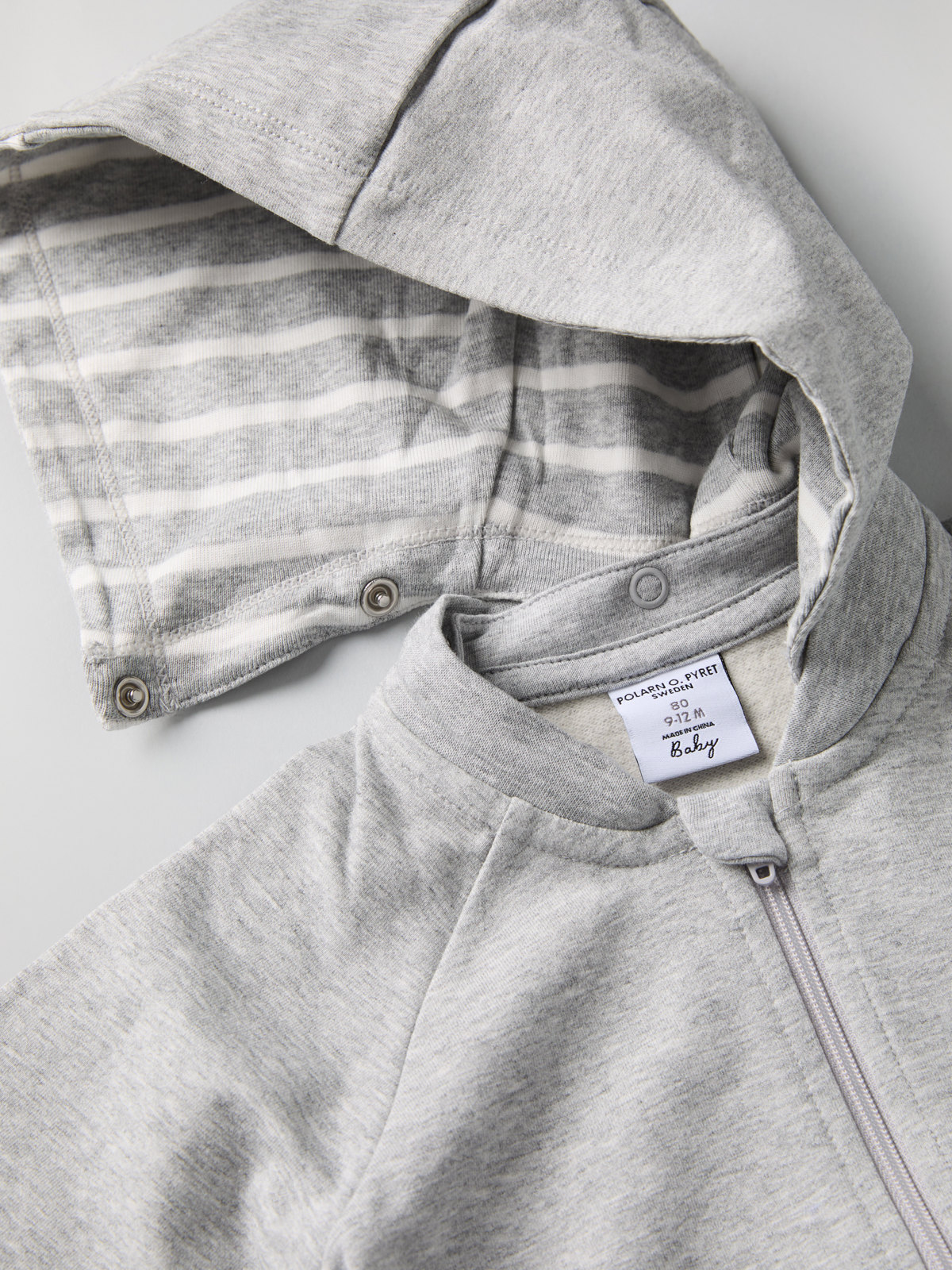 Vauvan pehmeä haalari luomupuuvillaa. Kaunista collegemateriaalia harjatulla sisäpinnalla.