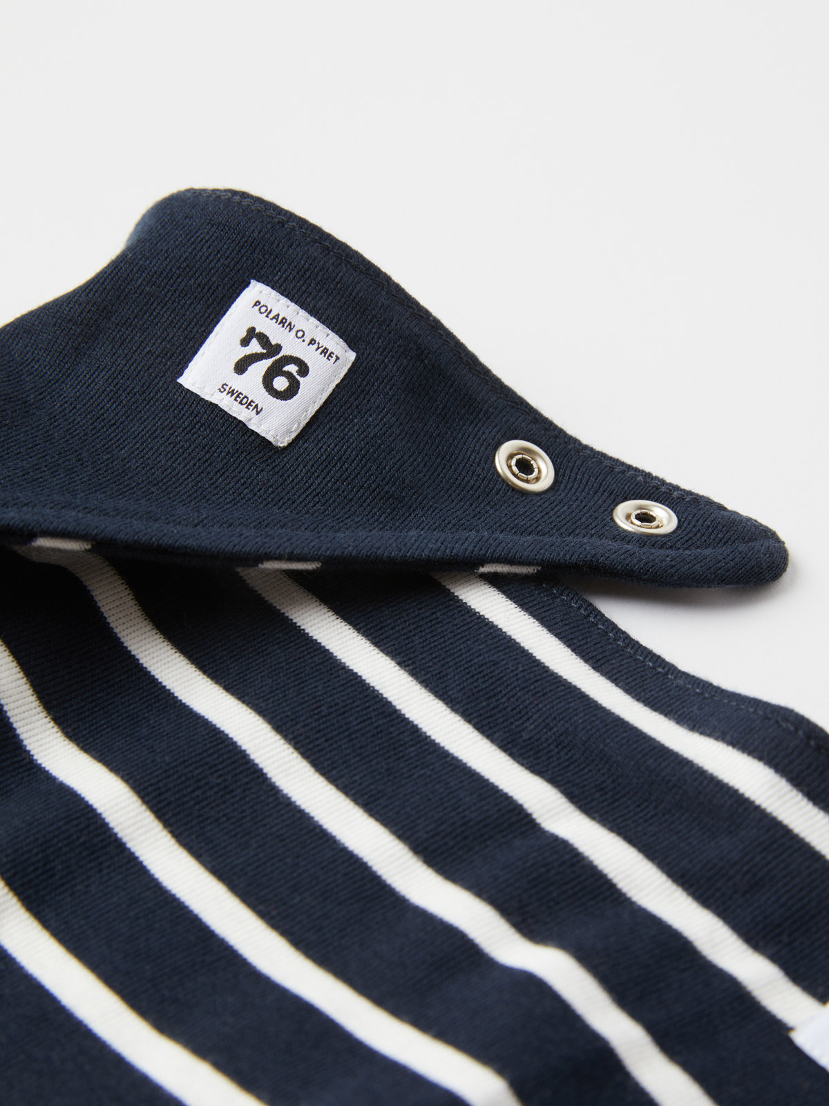 Vauvan käännettävä kaulalappu pehmeää trikoota. Kaulalappu suojaa vaatteita ja on valmistettu 100 % luomupuuvillasta. Toisella puolella on klassinen raitakuosimme, toinen puoli on yksivärinen. Kaulalapun kokoa voi säätää neppareilla.