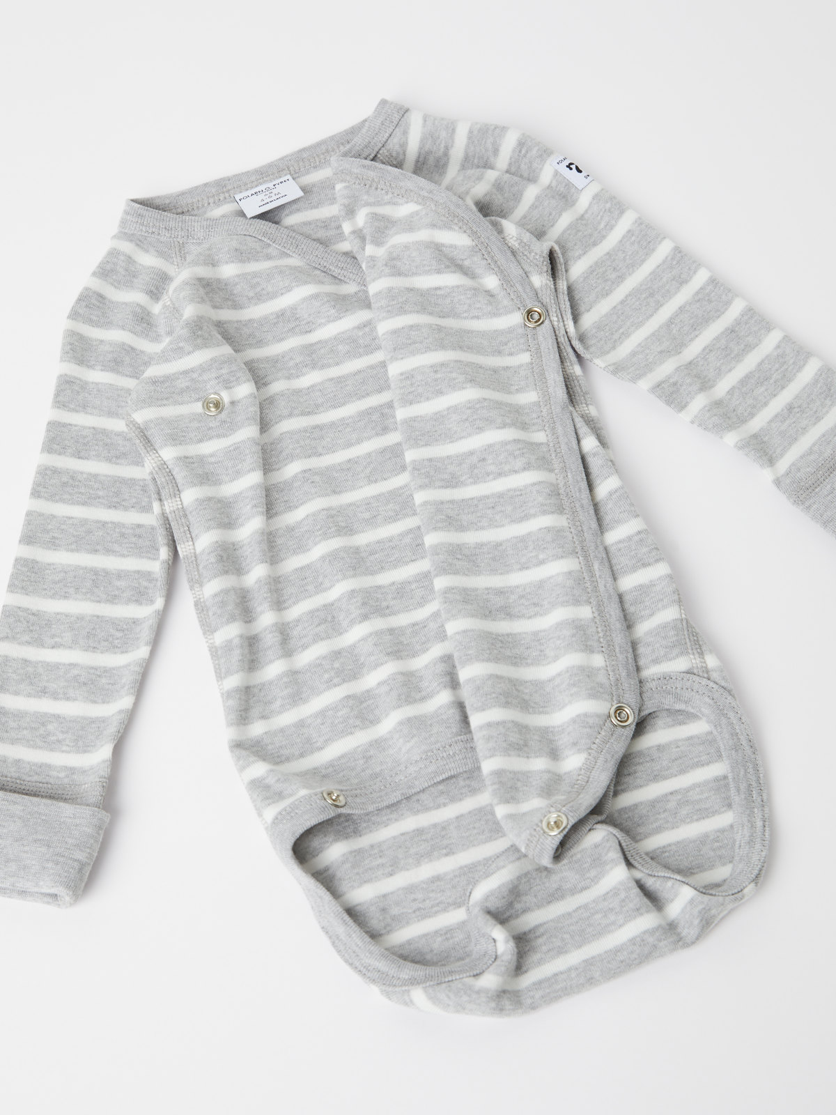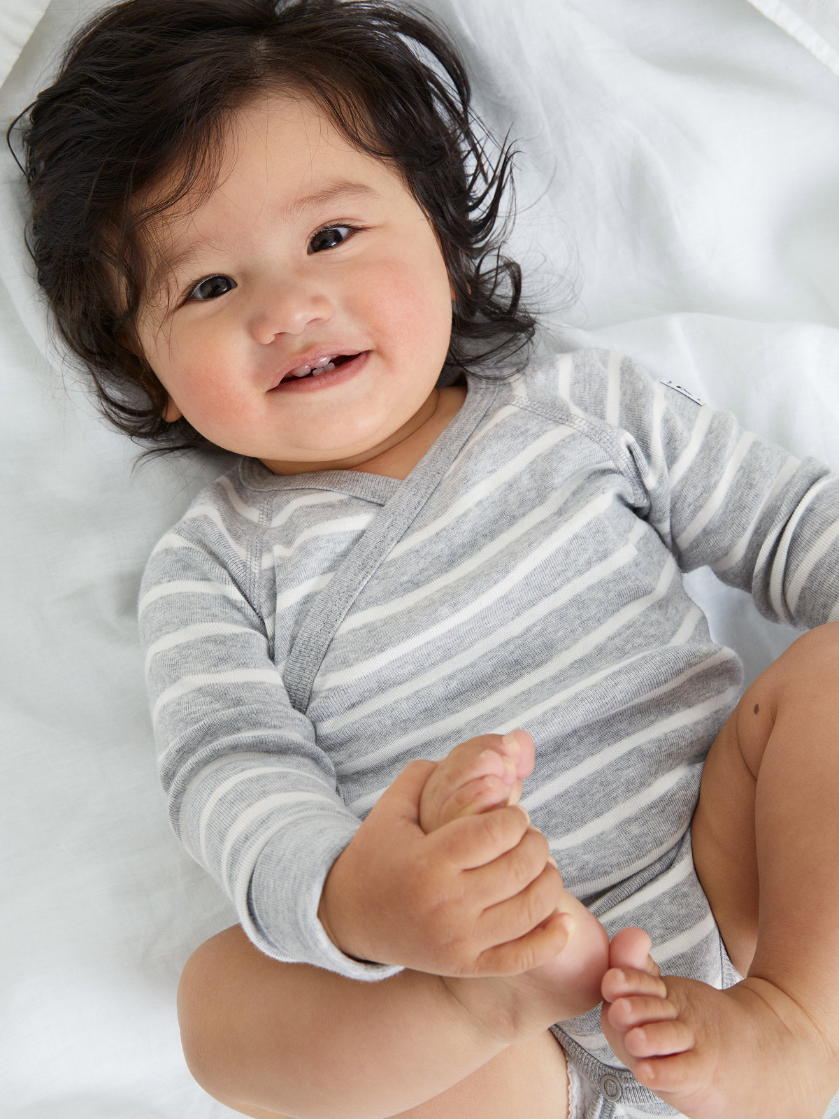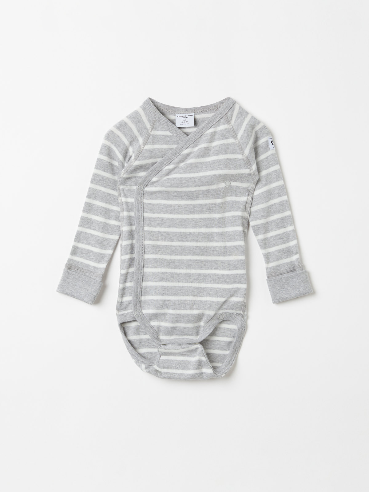 Vastasyntyneen kietaisubody luomupuuvillaa. Bodyssa on klassinen raitakuosimme. Hihansuissa pehmeät ribbiresorit, jotka voi taittaa alas lapsen kasvaessa. Nepparit kietaisuaukossa ja haarassa helpottavat pukemista ja vaipanvaihtoa.