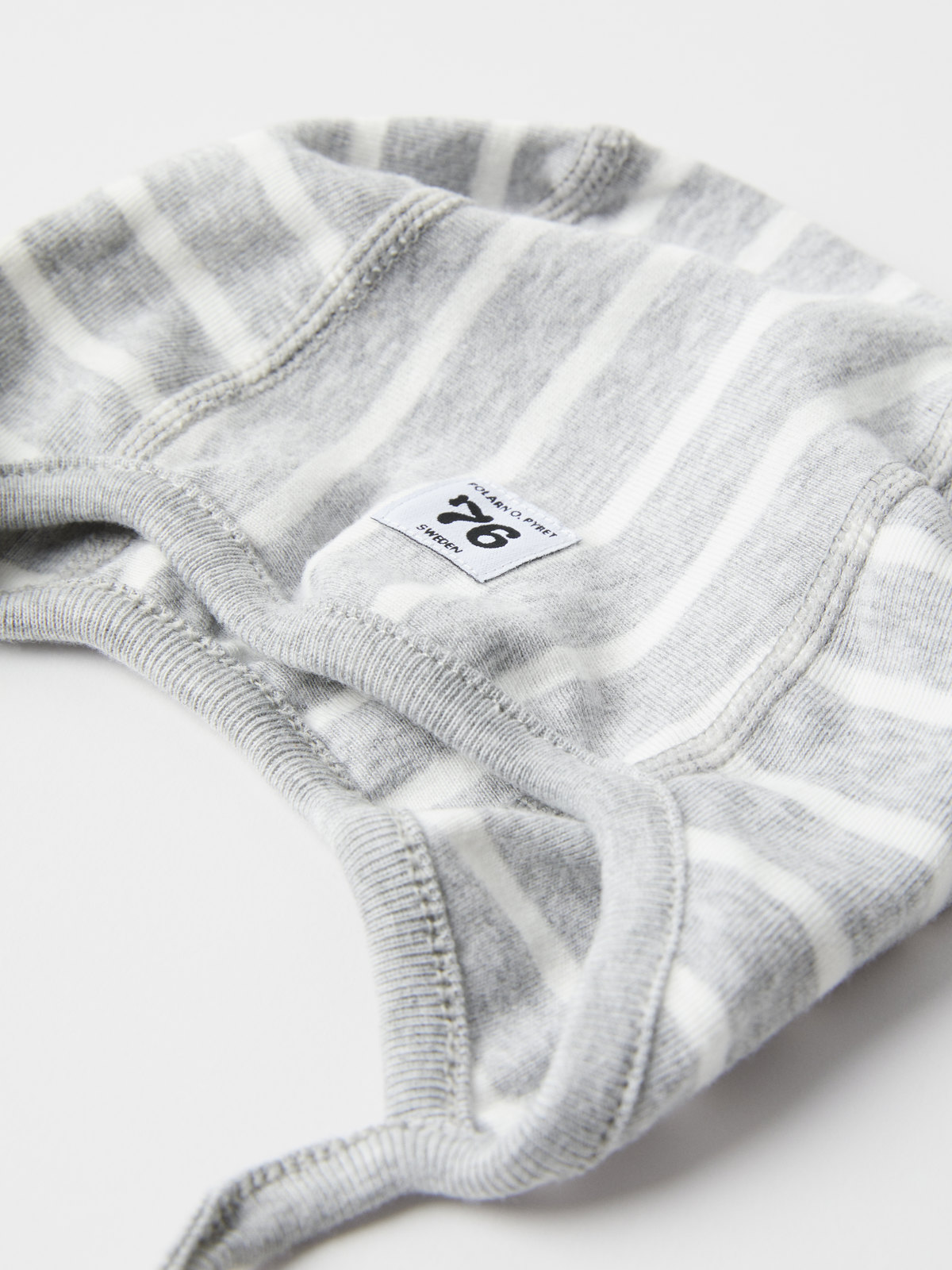 Raidallinen kypärämyssy 100 % luomupuuvillaa perheen pienimmille. Kypärämyssyssä on klassinen raitakuosimme. Leuan alta solmittavien nauhojen avulla se pysyy hyvin paikoillaan.