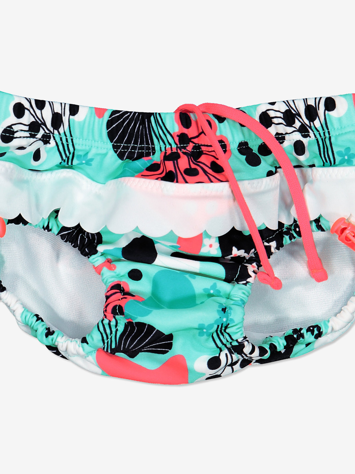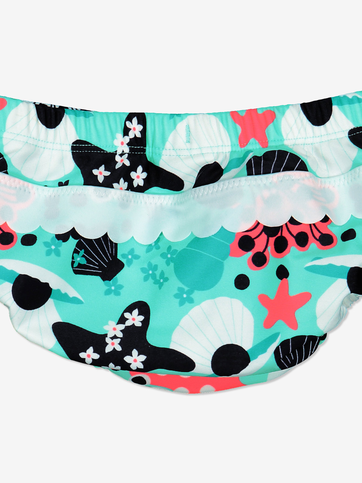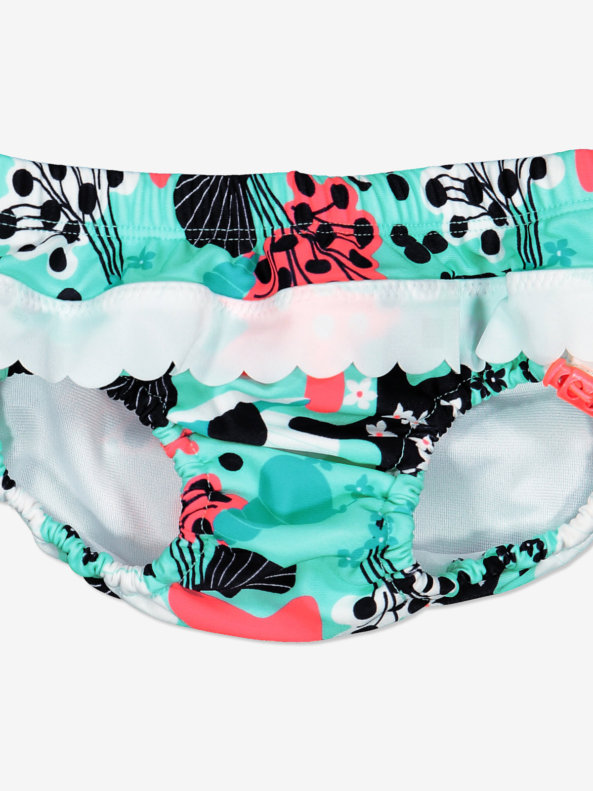 Vauvan kuviollinen uimahousut kierrätettyä kangasta UV-suojalla. UPF 50 (Ultraviolet Protection Factor) suojaa 98-prosenttisesti haitallisilta UV-säteiltä. Housuissa on kaksinkertainen röyhelö ja resori vyötäröllä. Vyötärö säädettävissä myös sisäpuolelta kiristysnauhalla. Housut sopivat täydellisesti myös vauvauintiin, sillä housujen sisäpuolella on lisävuoraus, joka estää pienten vahinkojen pääsyn housujen ulkopuolelle.
