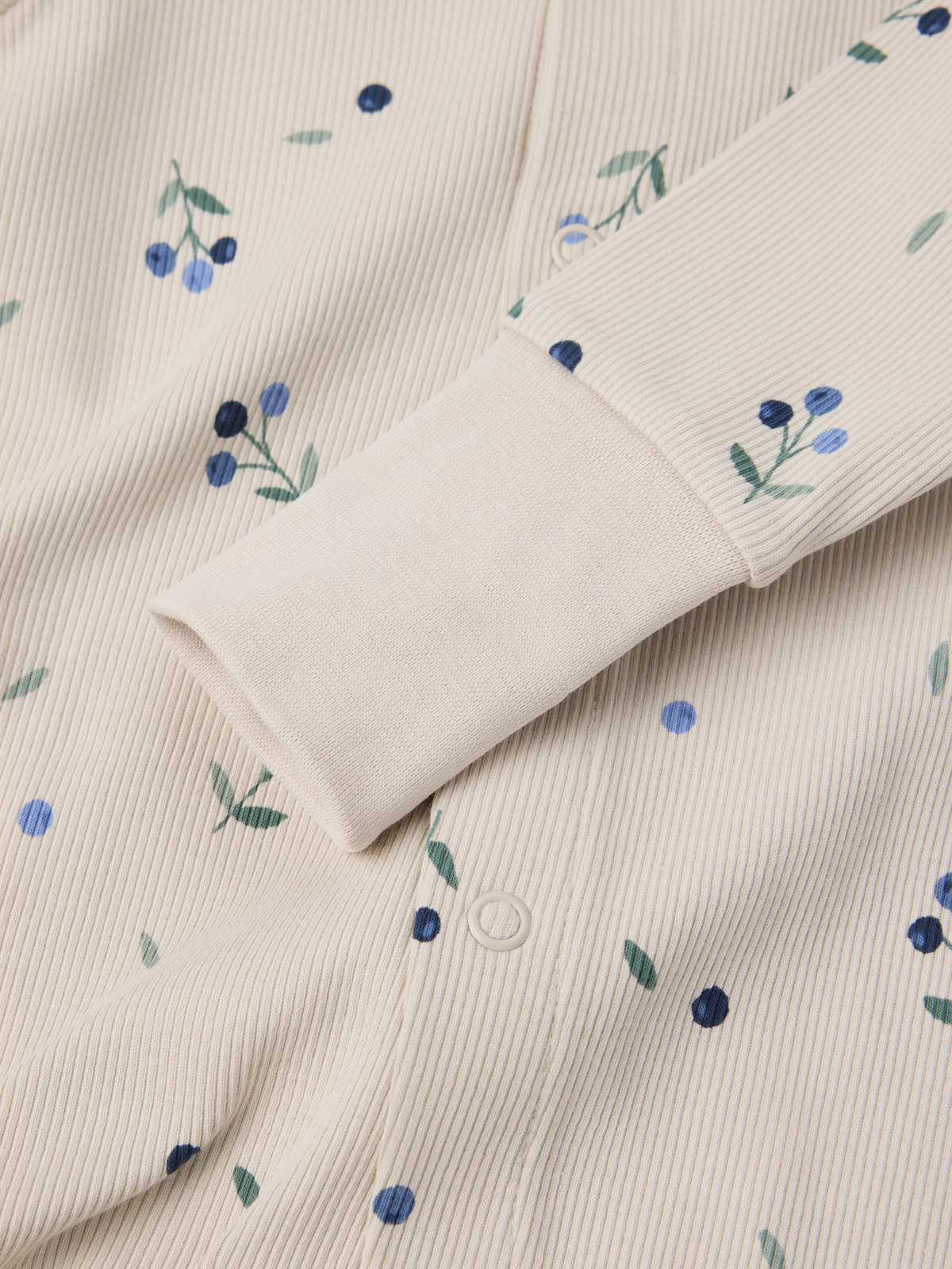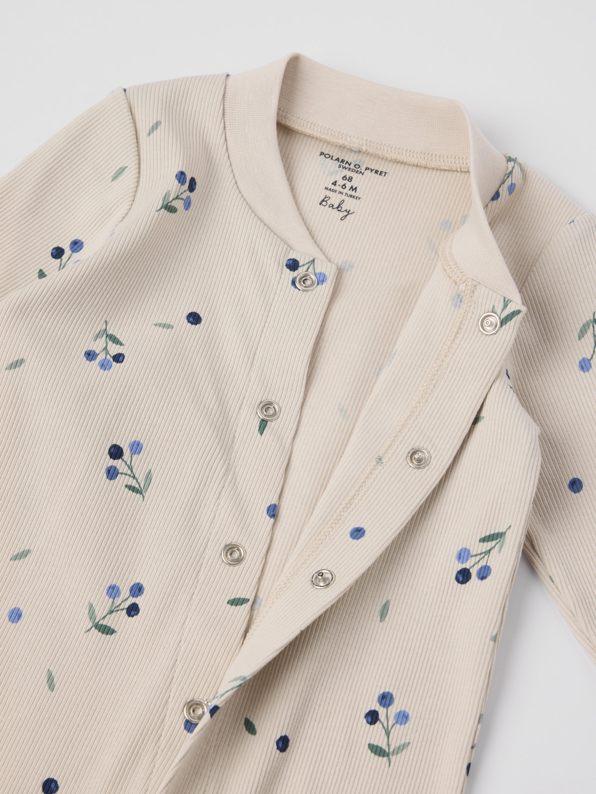 Pyjamahaalarimme pehmeää luomupuuvillaa. Haalarissa on erittäin pehmeät, litteät saumat, jotka eivät hankaa herkkää ihoa. Hihan- ja lahkeensuissa erityispitkät resorit, jotka voi taittaa alas lapsen kasvaessa. Pitkä nappilista pääntieltä lahkeensuulle helpottaa pukemista.